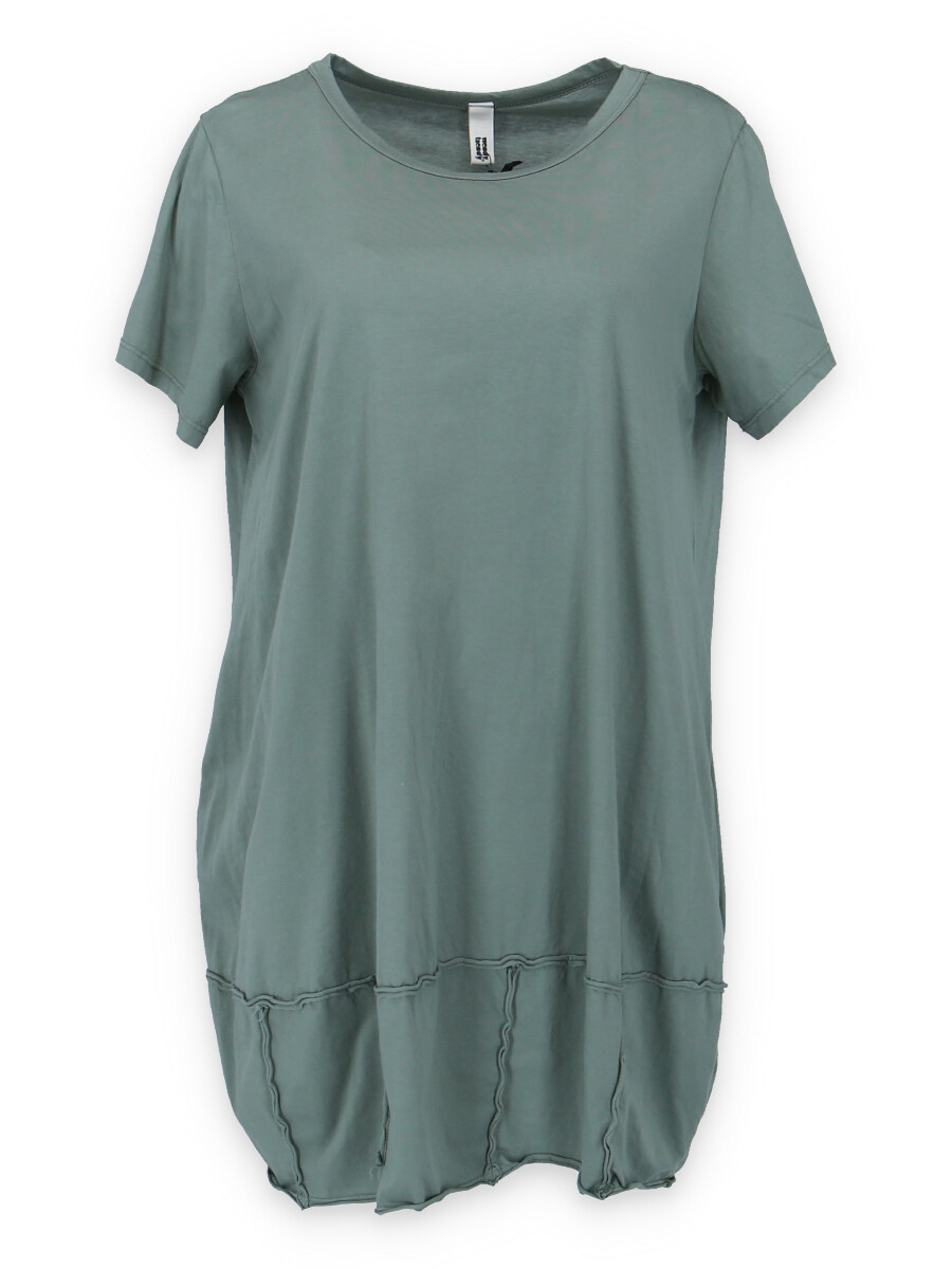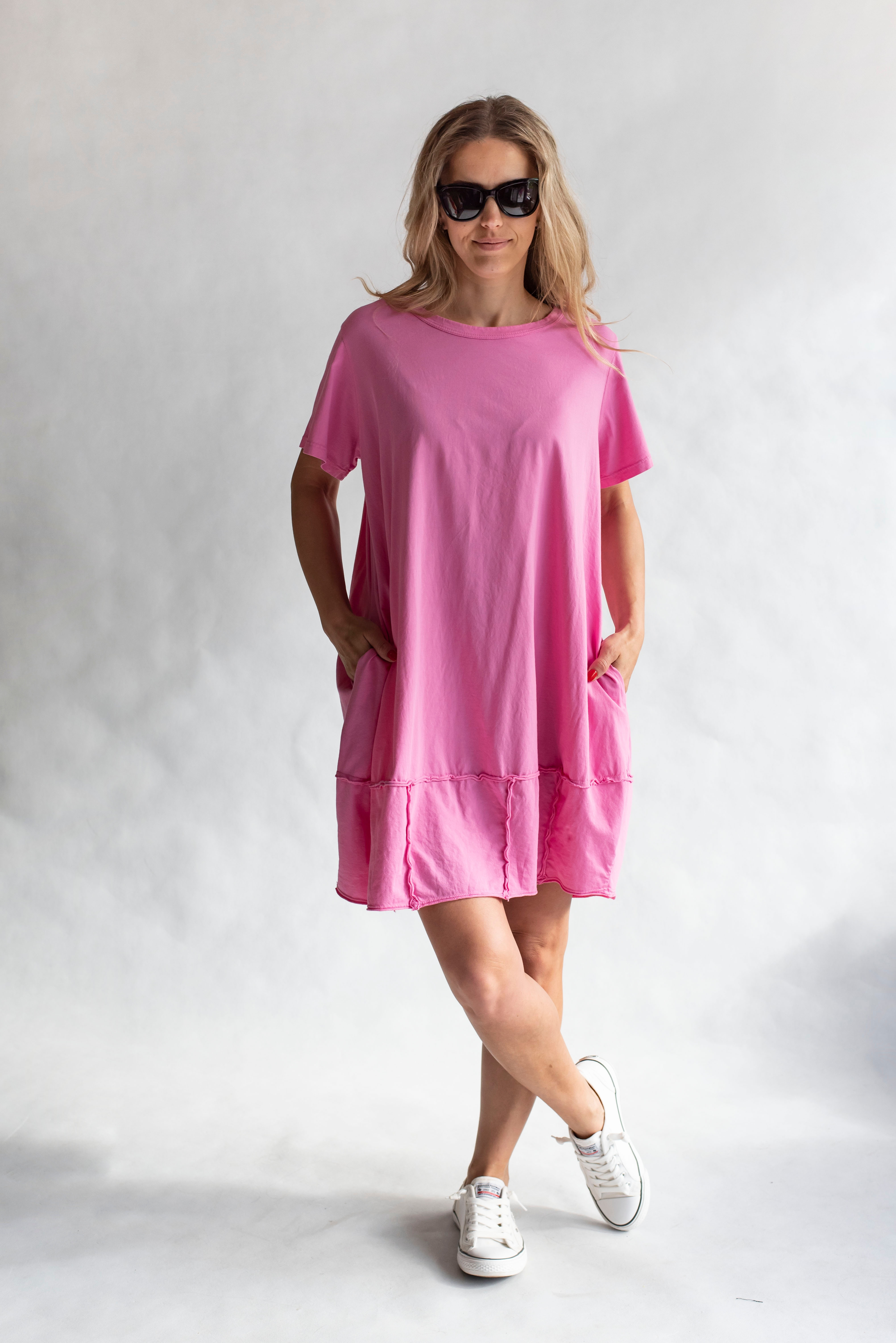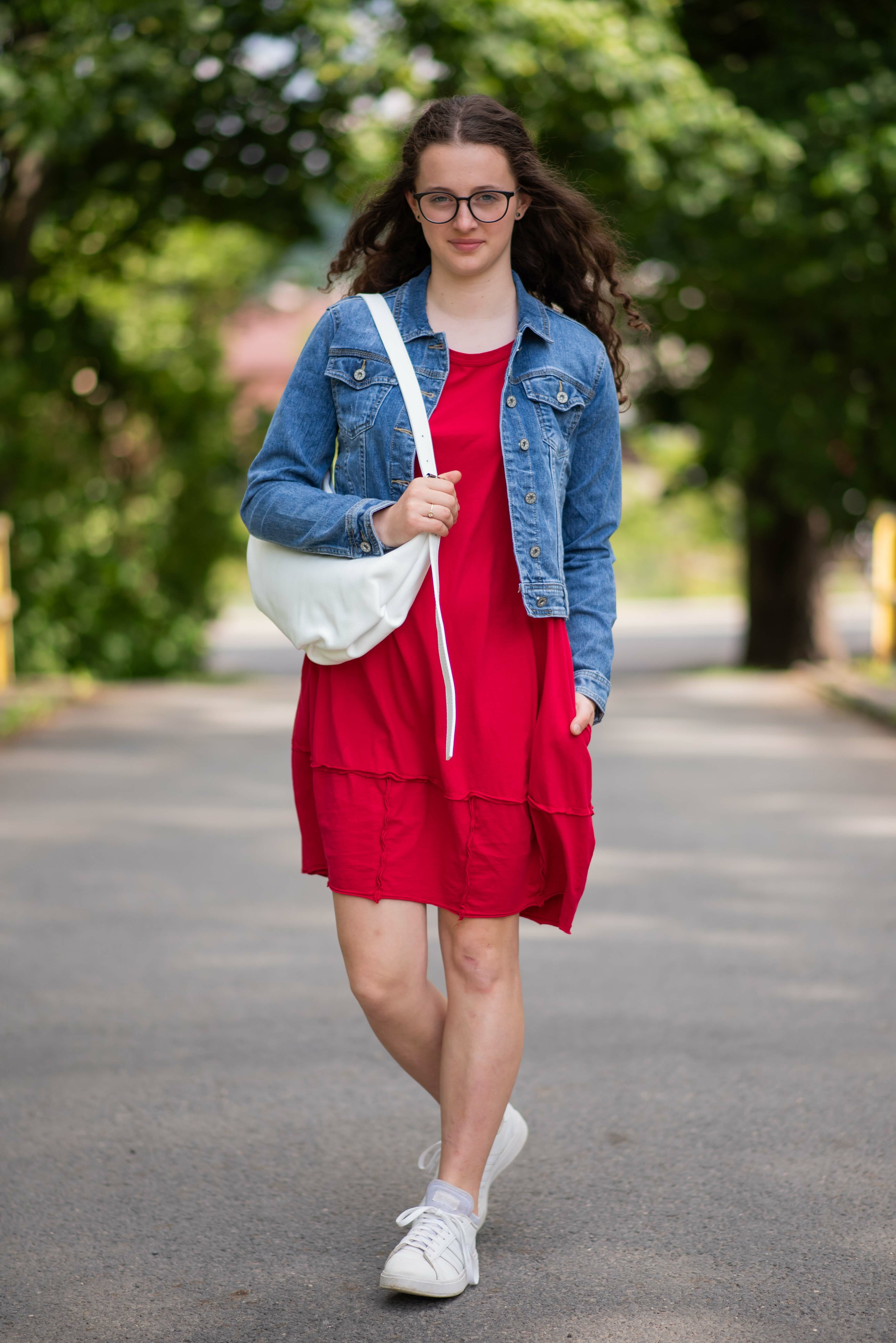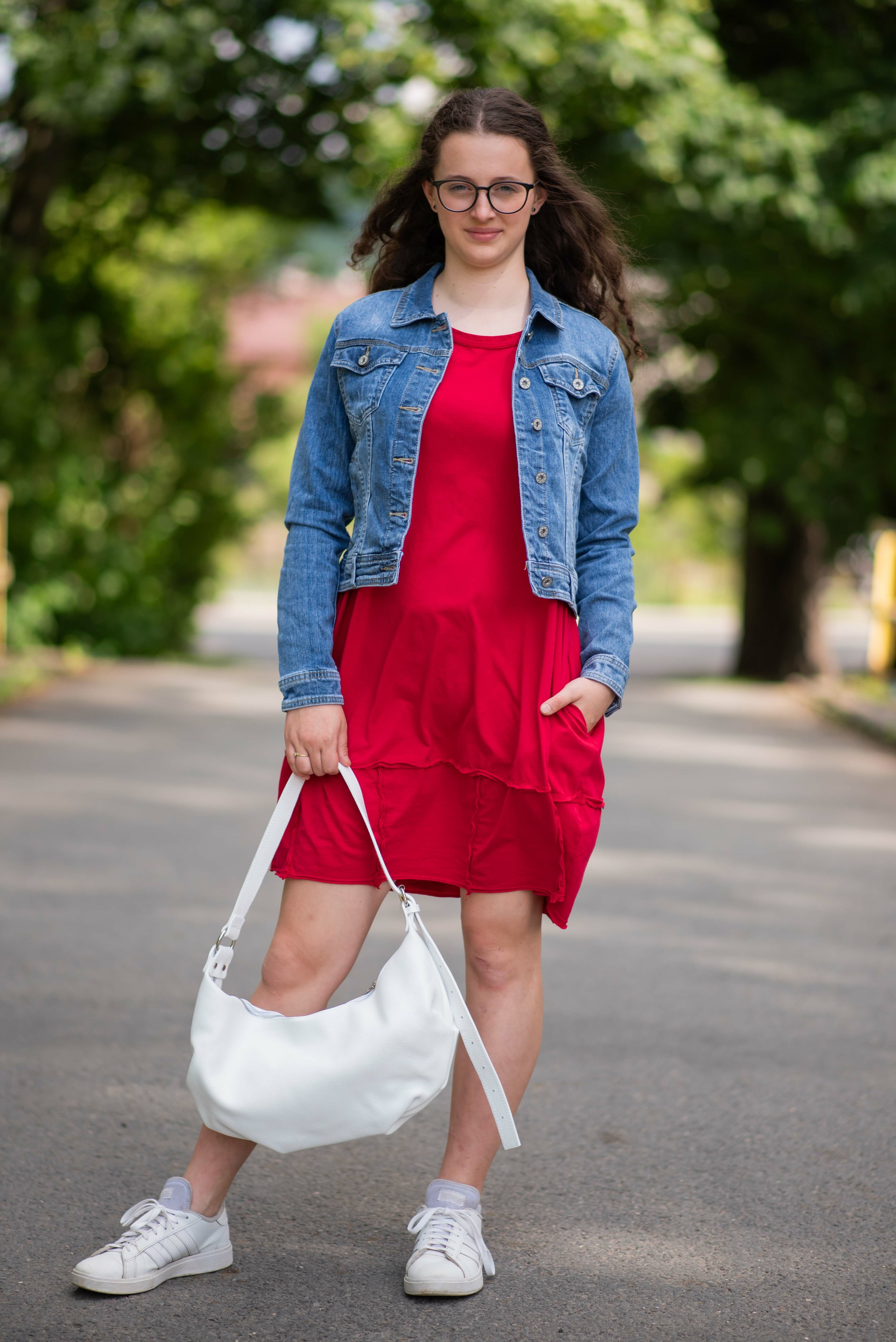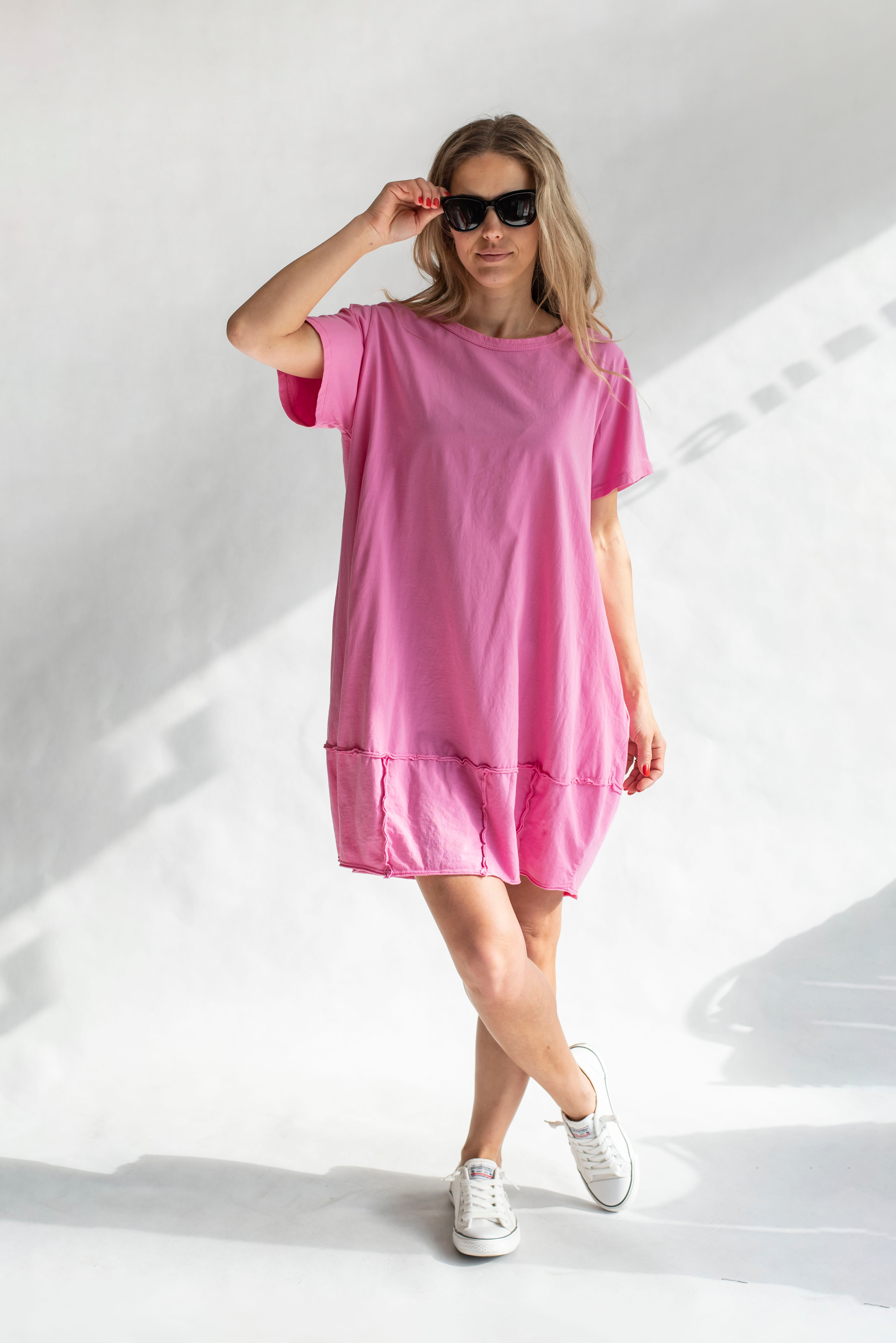 Módní bavlněné krátké šaty s krátkým rukávem a všitými kapsami.