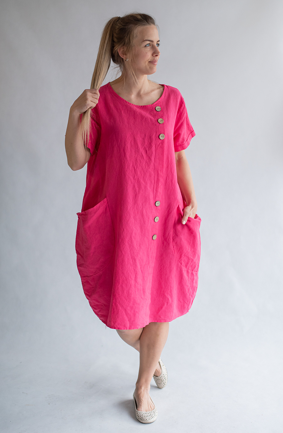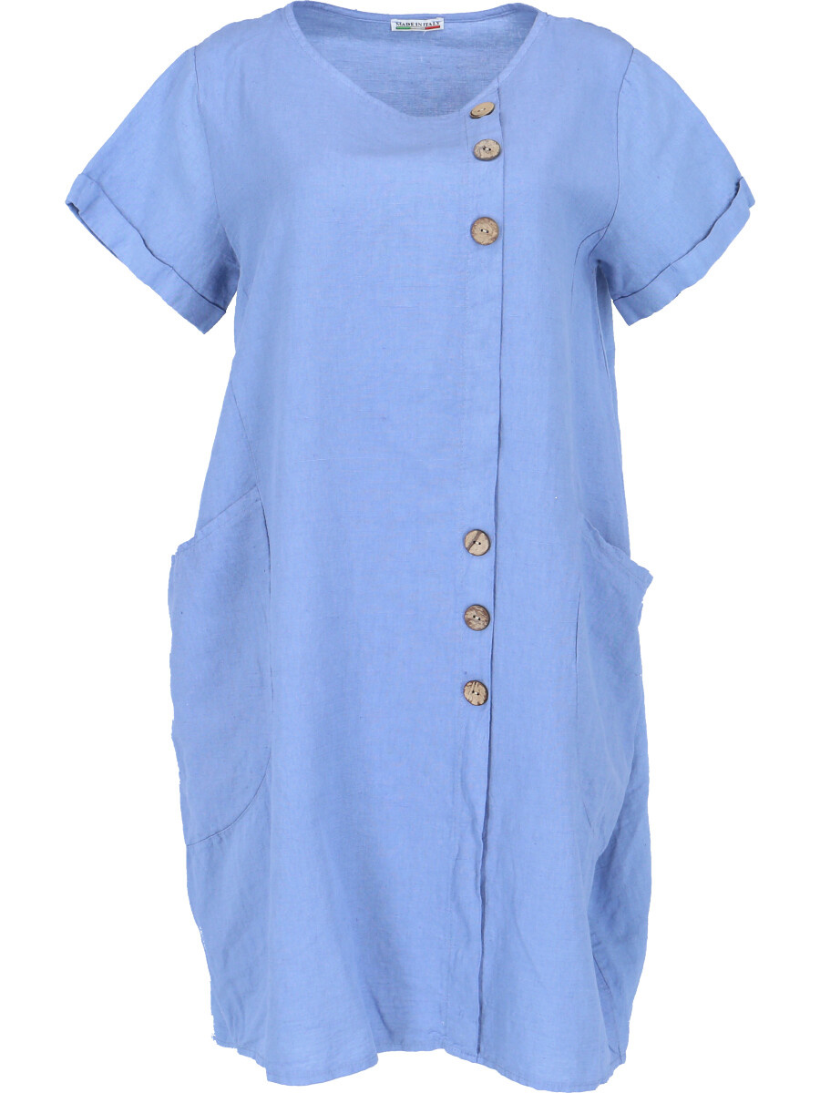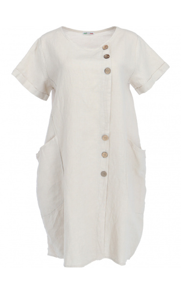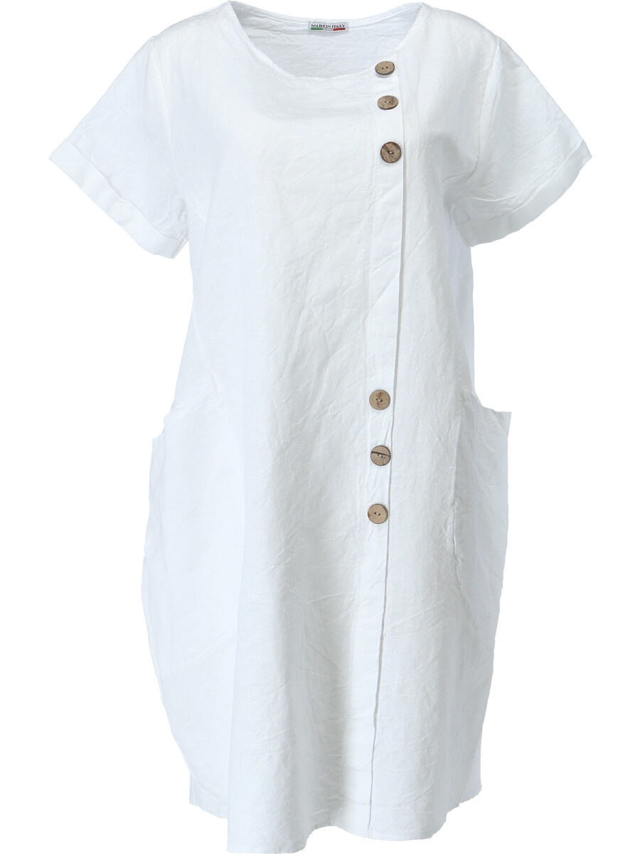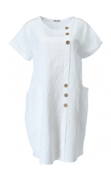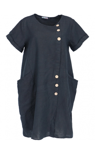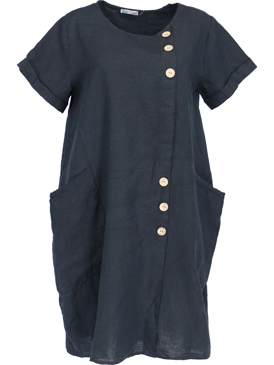 Módní letní dámské šaty s krátkým rukávem zdobené knoflíky, balónového střihu s kapsami na přední straně.