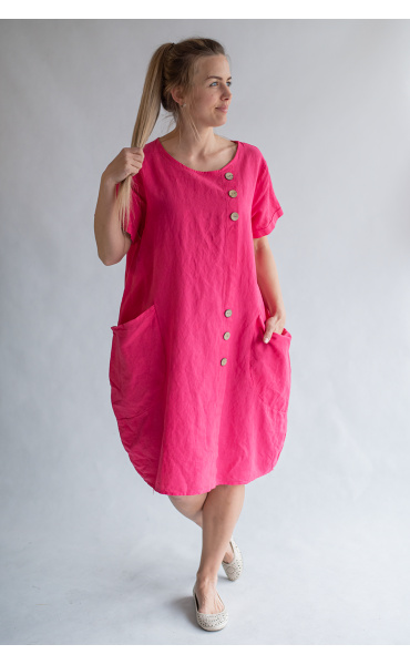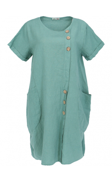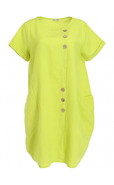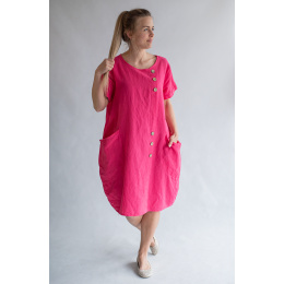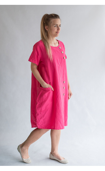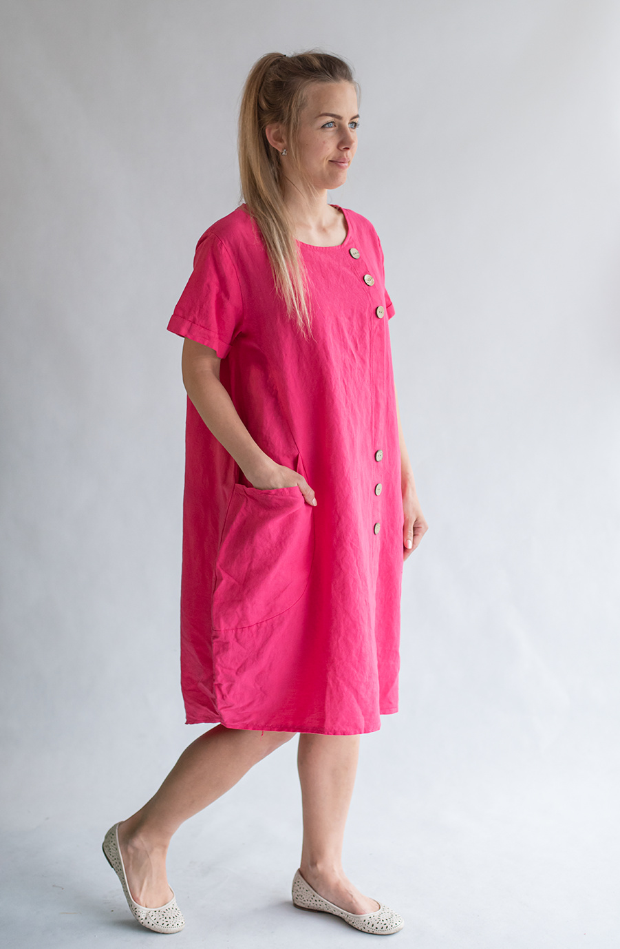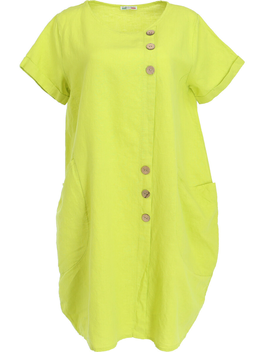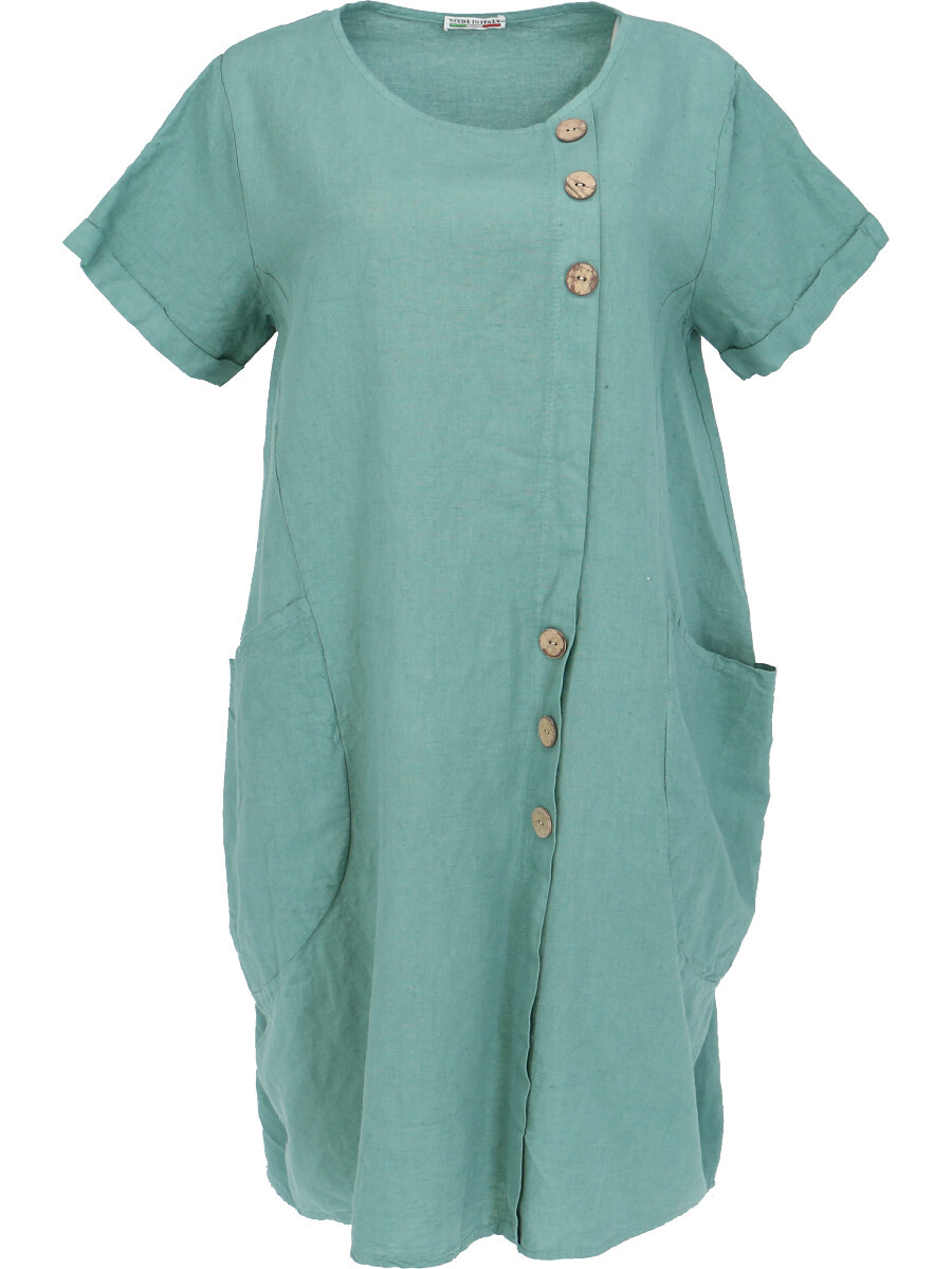 Módní letní dámské šaty s krátkým rukávem zdobené knoflíky, balónového střihu s kapsami na přední straně.