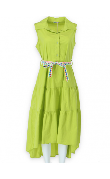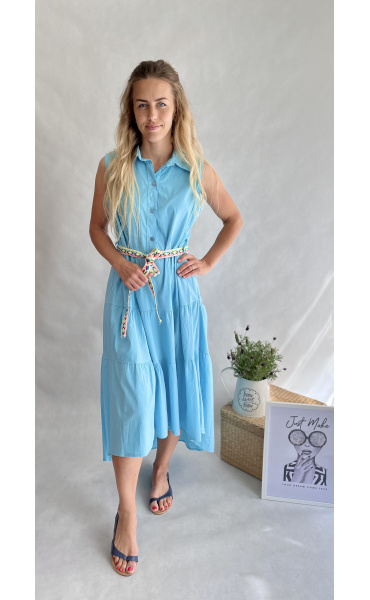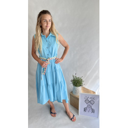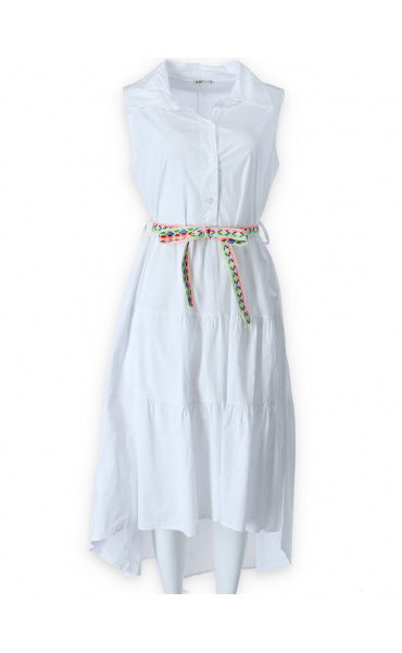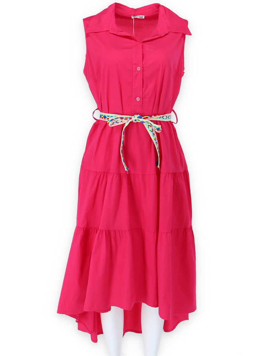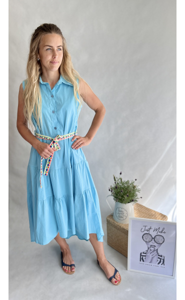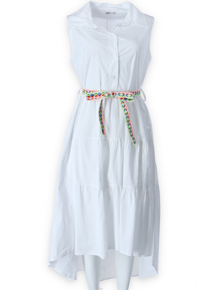 Letní dámské šaty s límečkem, bez rukávů, vázáním v pase a zadní prodlouženou částí.