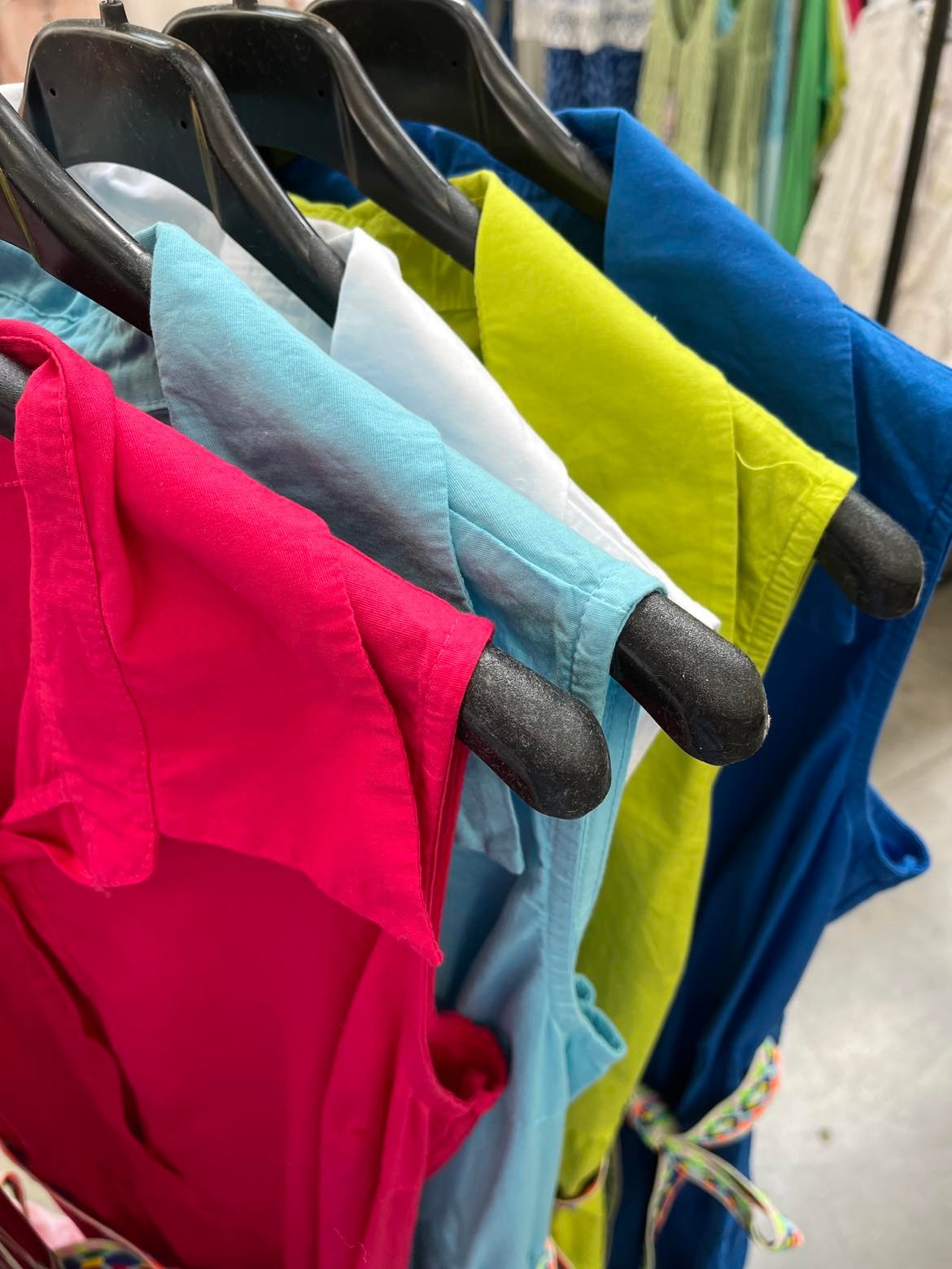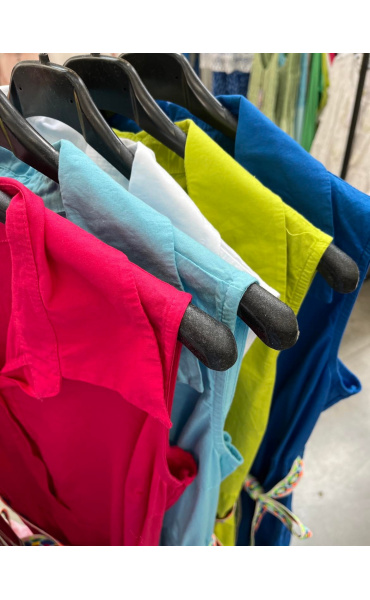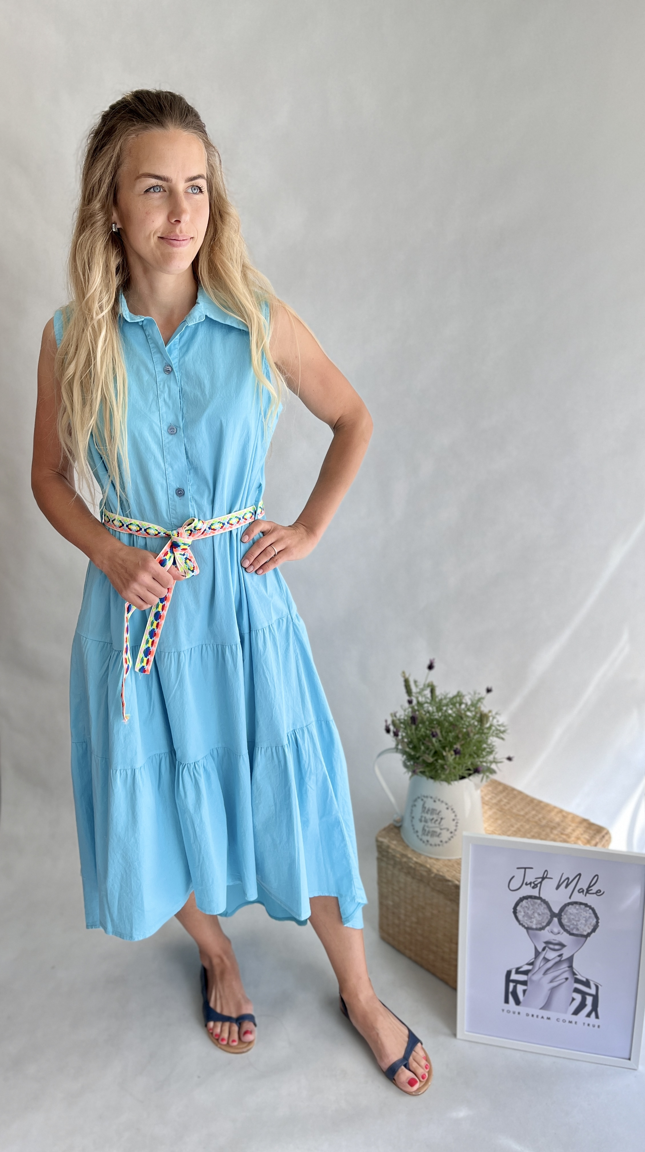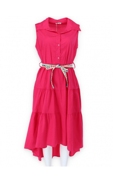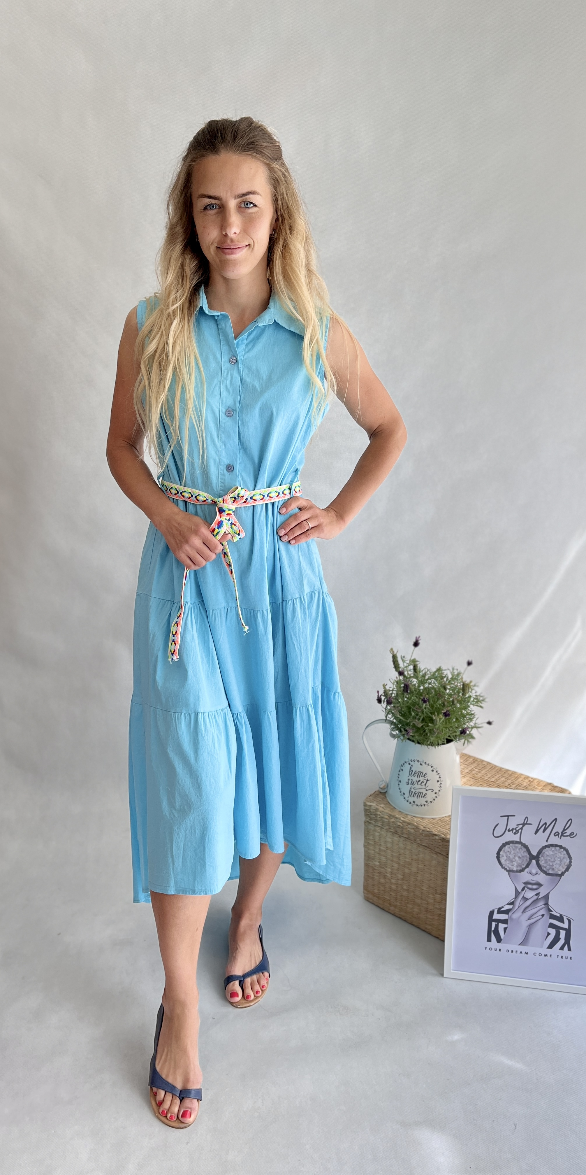 Letní dámské šaty s límečkem, bez rukávů, vázáním v pase a zadní prodlouženou částí.