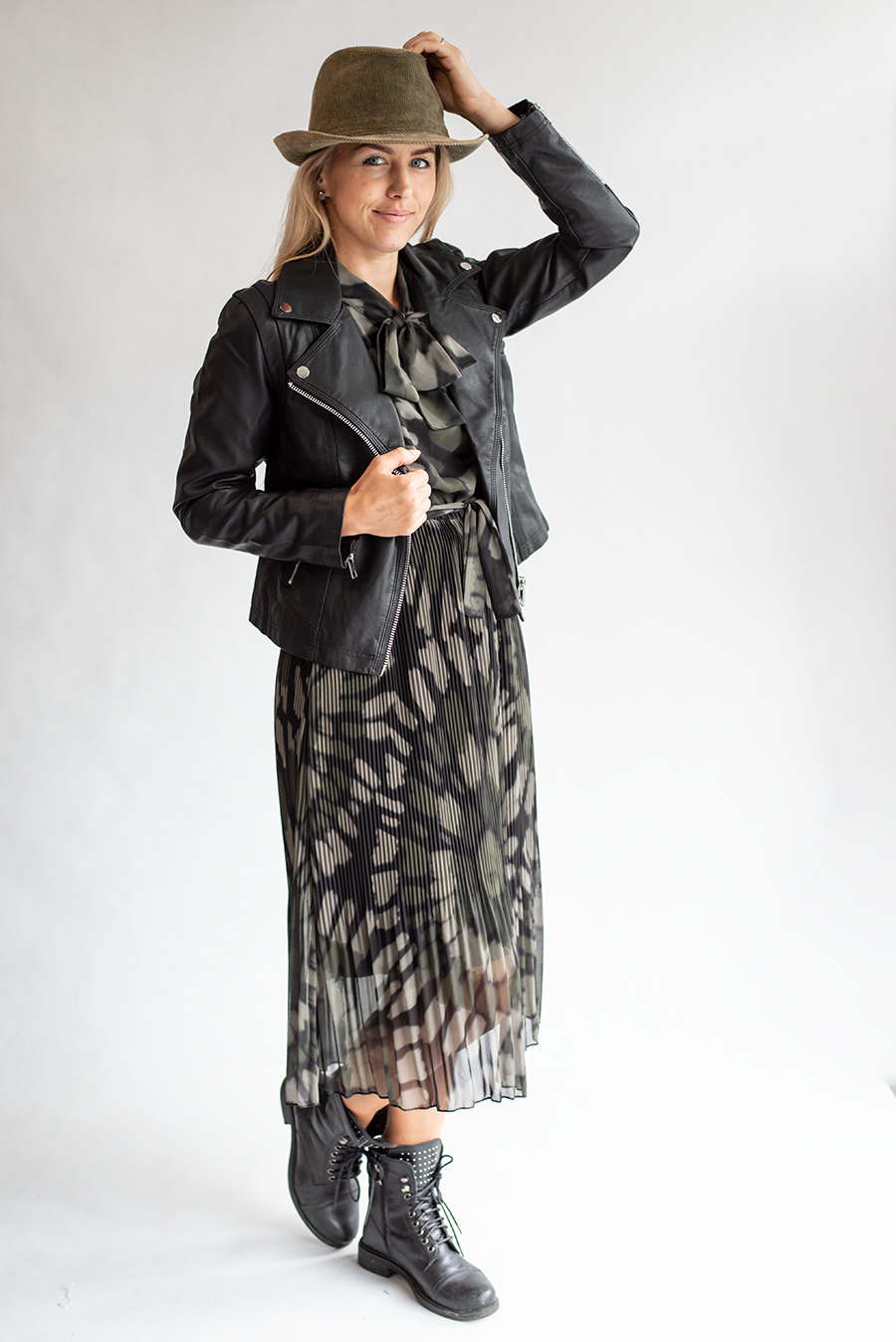Spodní část plisé, vázání okolo krku, v pase do gumy a s vázáním na látkový pásek.