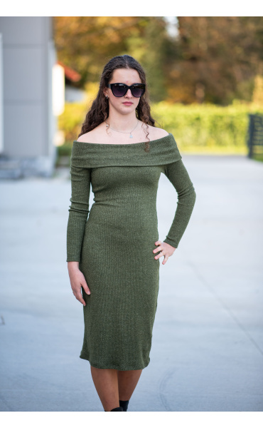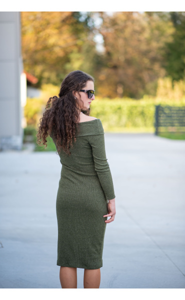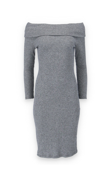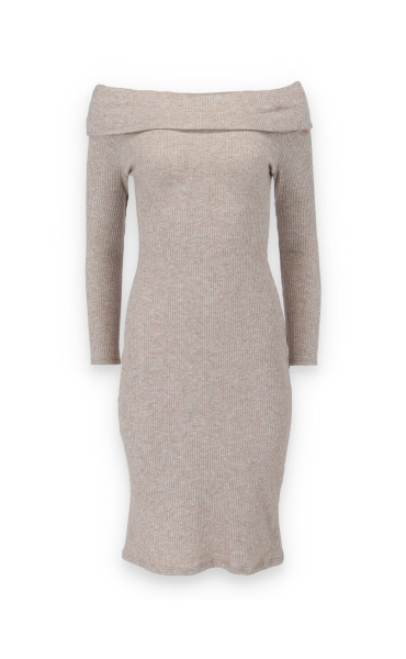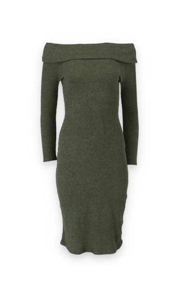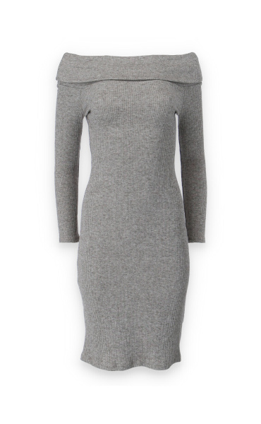 Elegantní šaty s dlouhým rukávem a šálovým límcem na stažení přes ramena. Šaty jsou z žebrovaného materiálu.