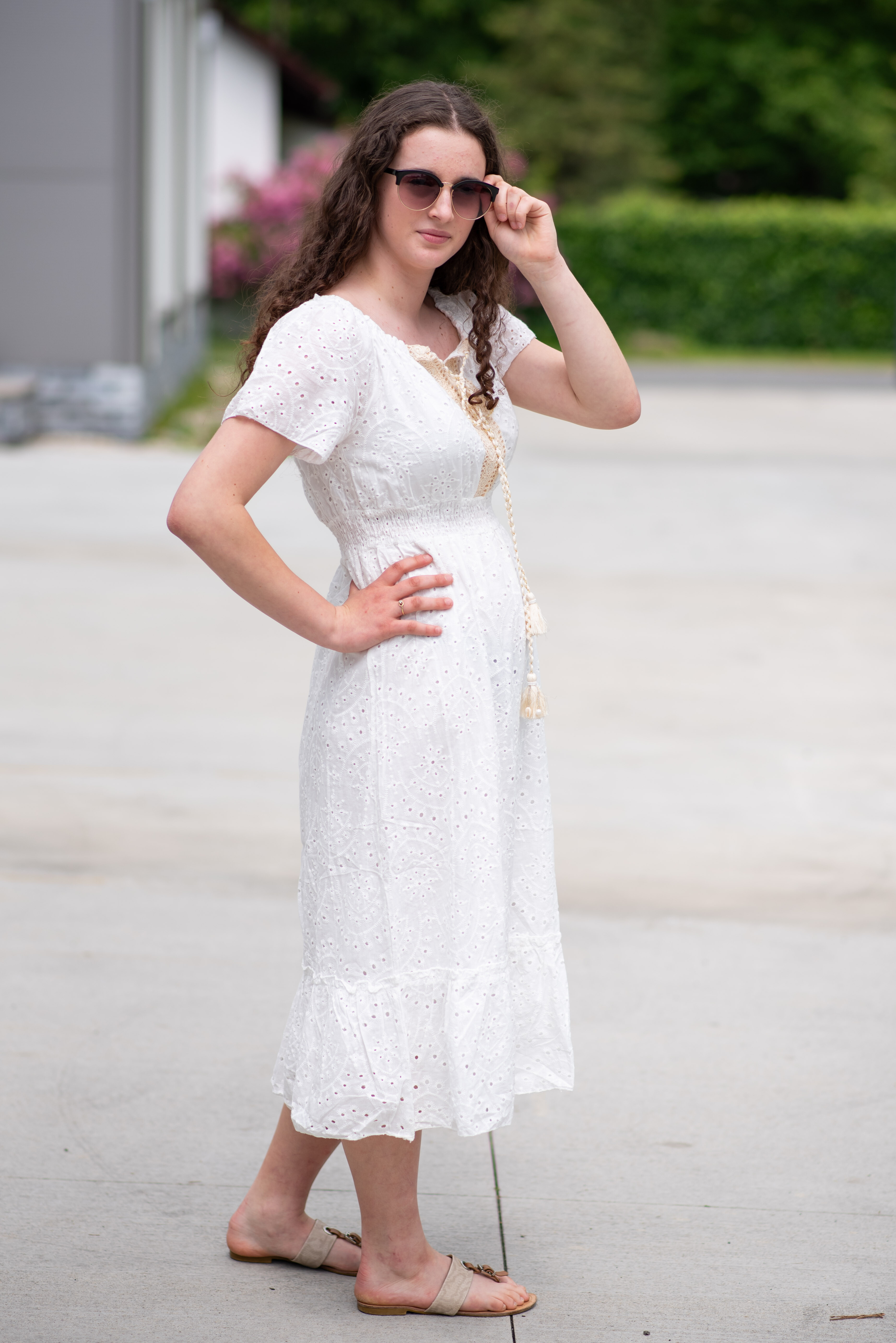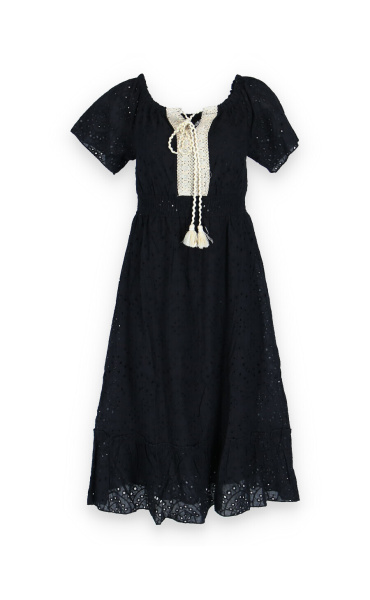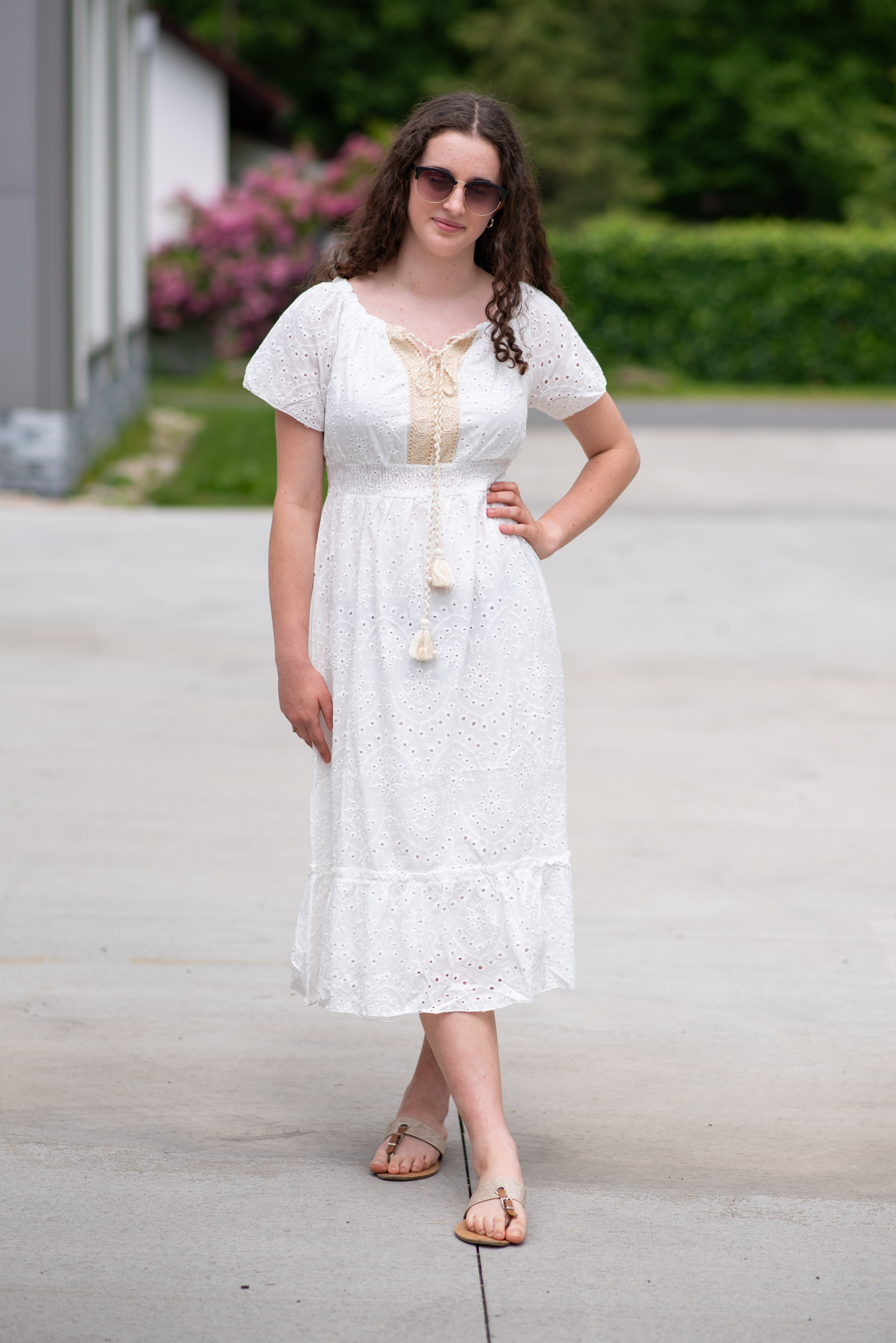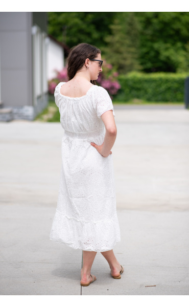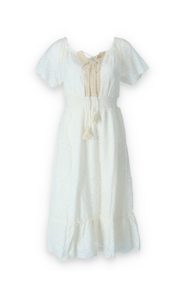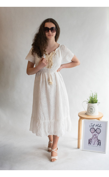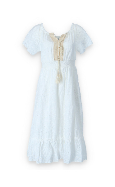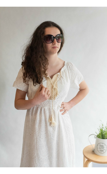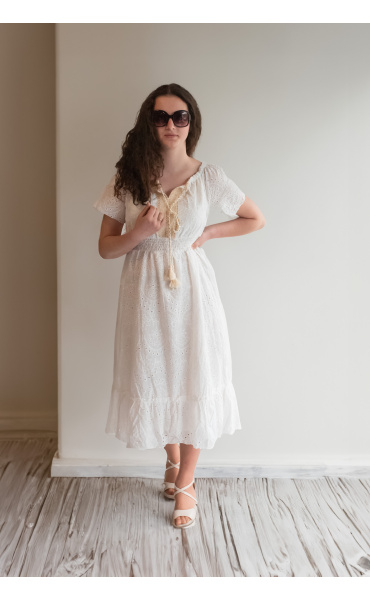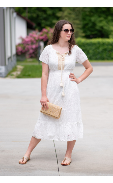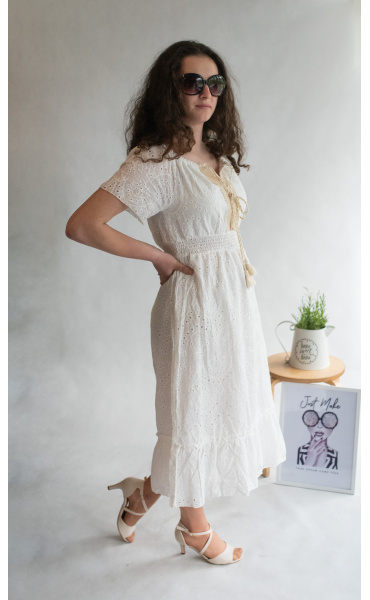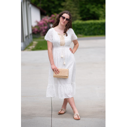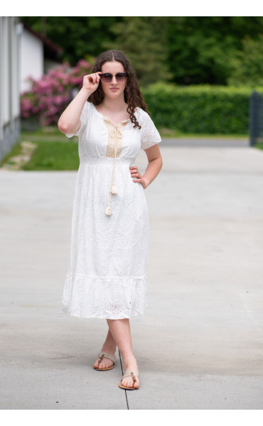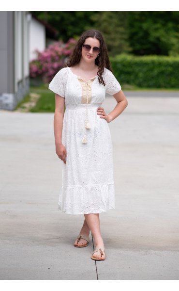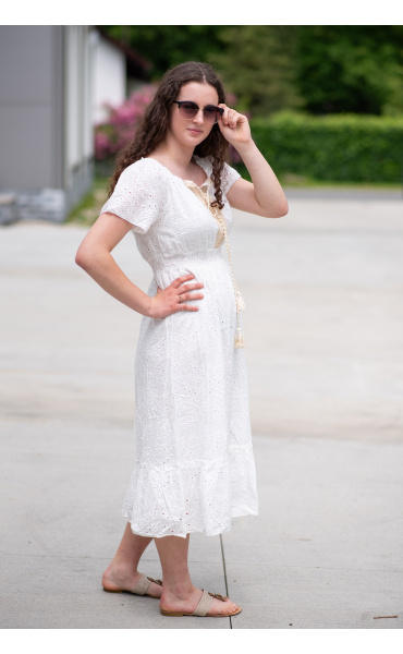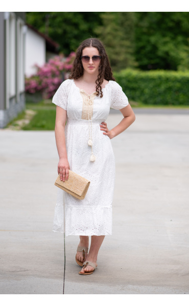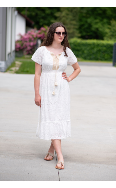 Dlouhé šaty s krátkým rukávem MADEIRA, na přední straně vázání ve výstřihu. Dlouhé letní šaty romantického stylu, s madeirovou krajkou, v pase do gumy a zakončeny jsou volánem ve spodní části.