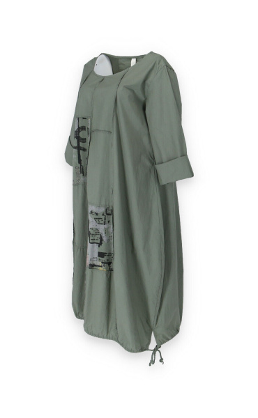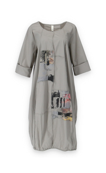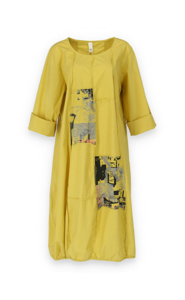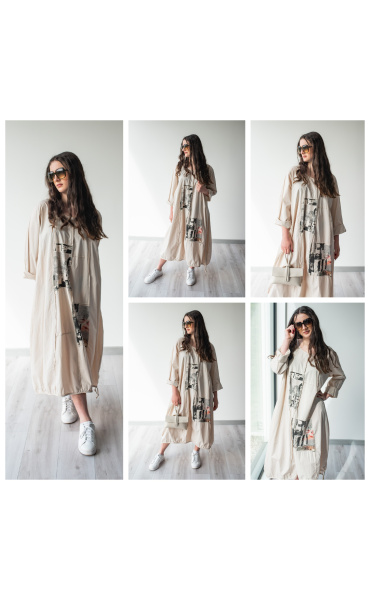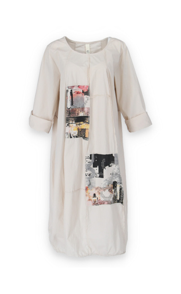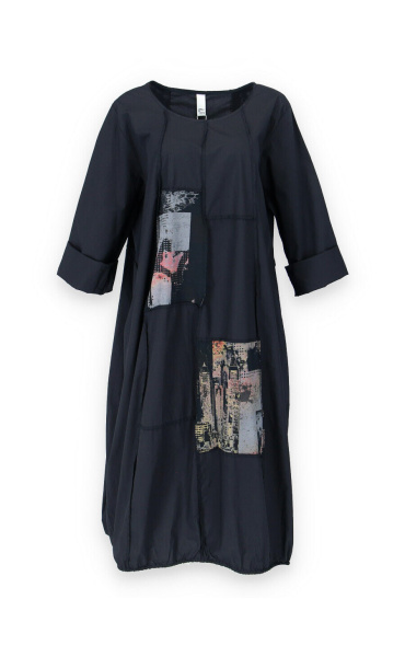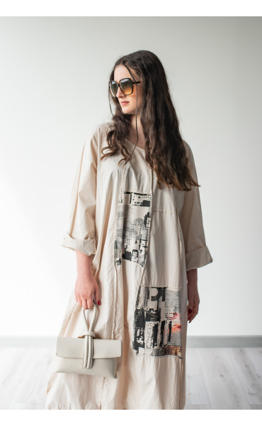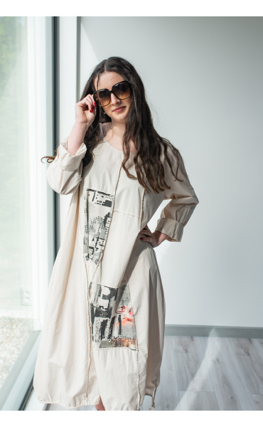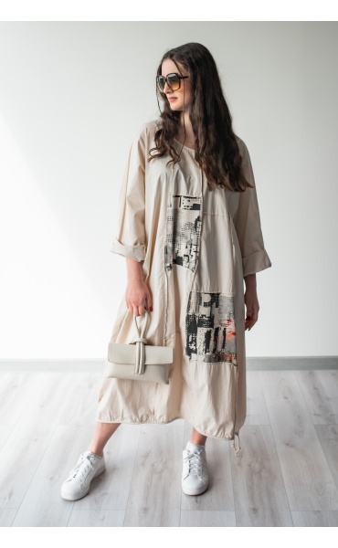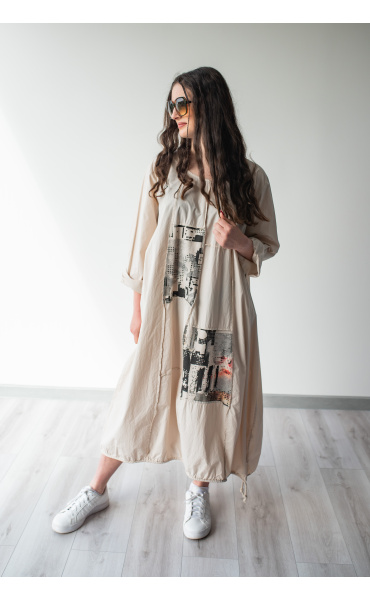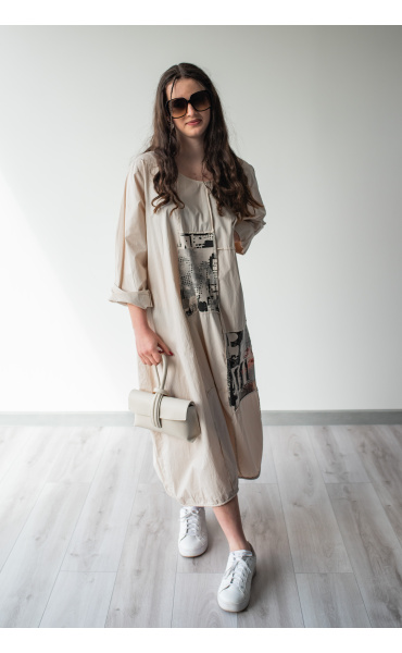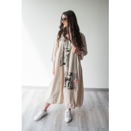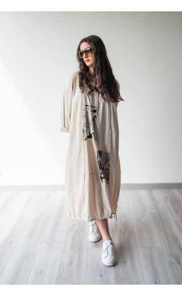 Dlouhé šaty s potiskem. Šaty jsou volnějšího balónového střihu. Ve spodní části regulace utažení na šňůrku.