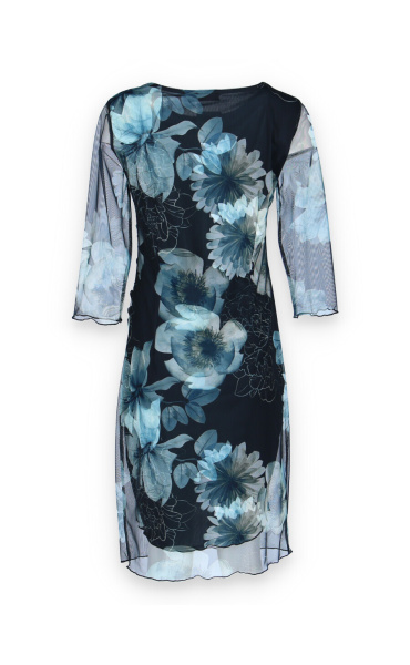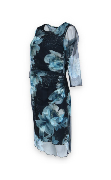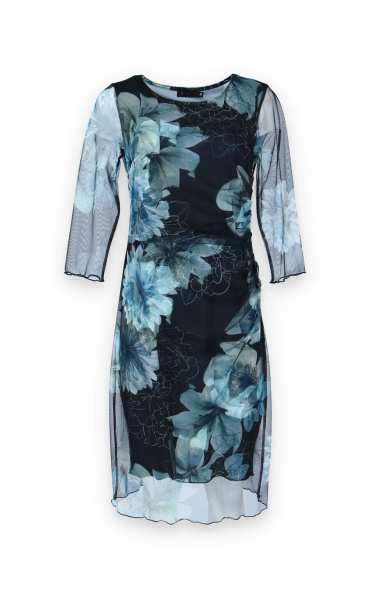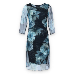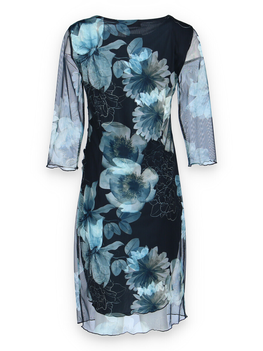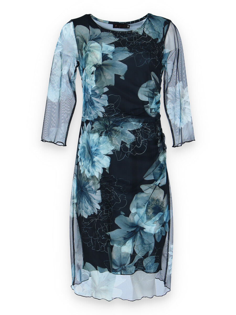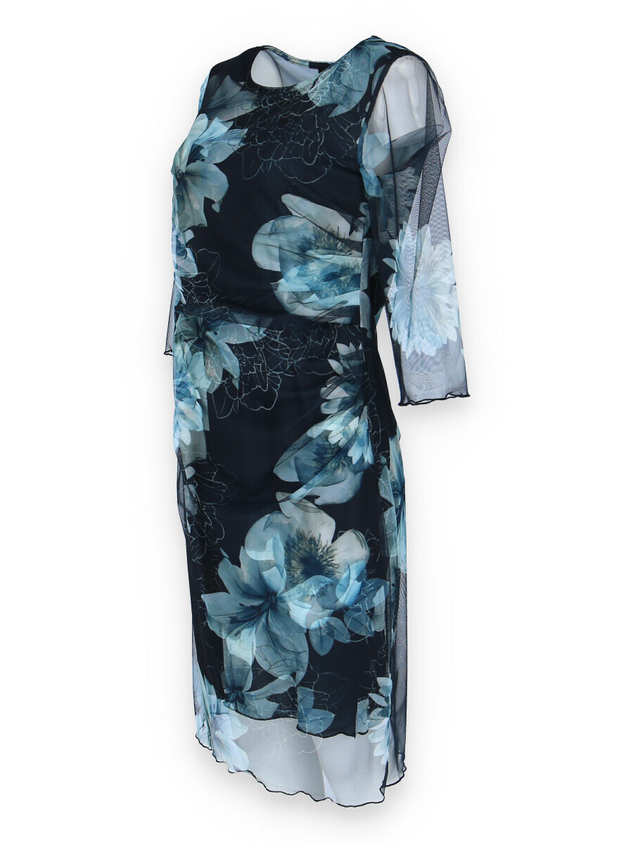 Elegantní společenské šaty s 3/4 rukávem, v modré barvě s délkou ke kolenům vhodné i na denní nošení, řasená sukně