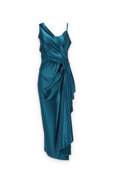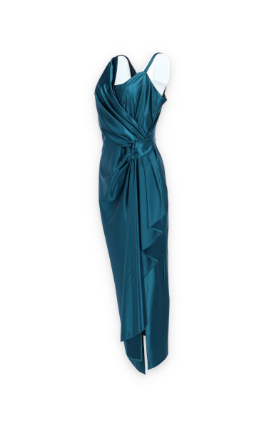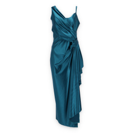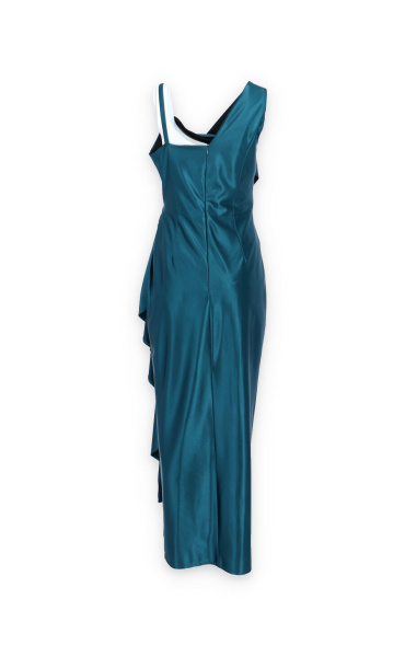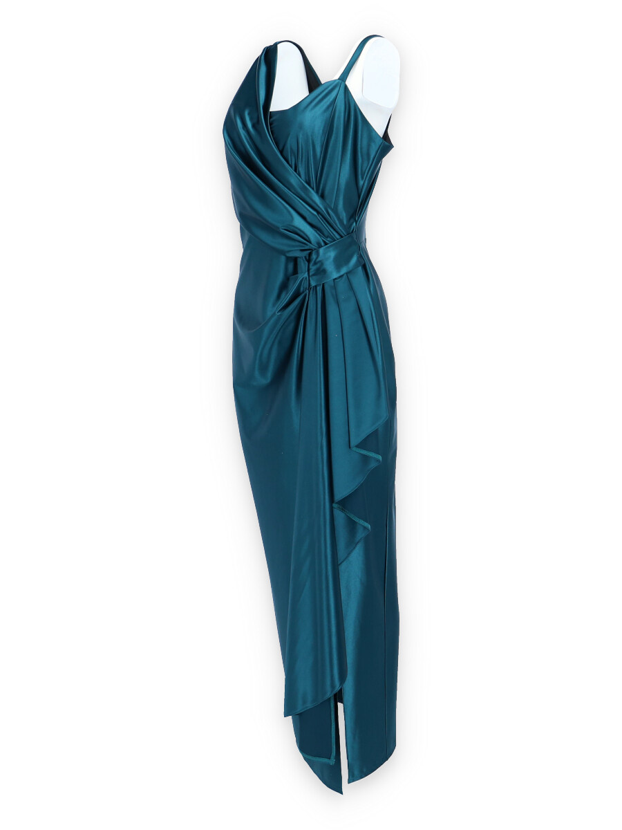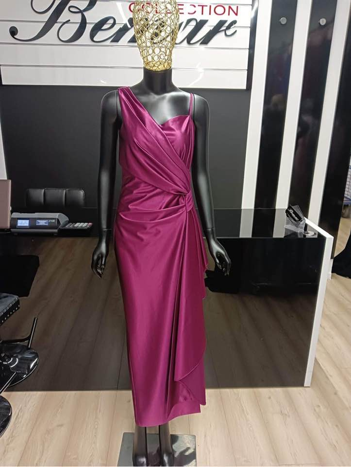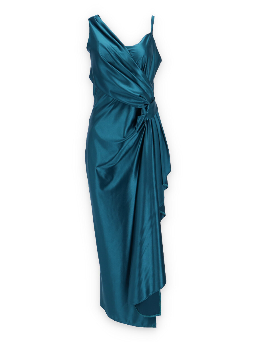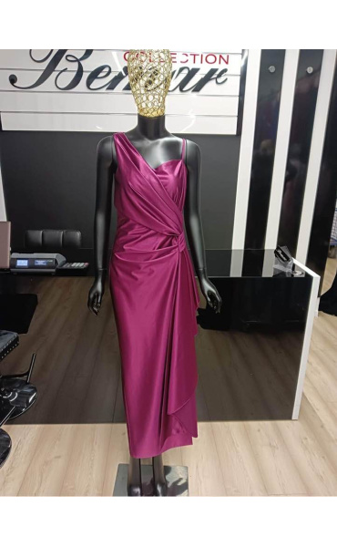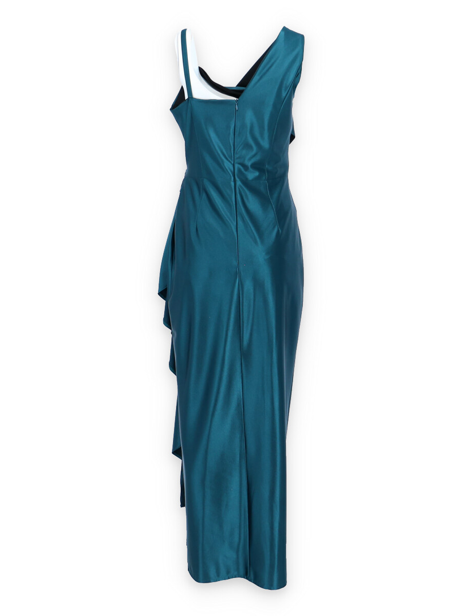 Společenské dlouhé šaty s asymetrickým ramínkem, zadní skrytý zip, jemný metalický lesk v materiálu.