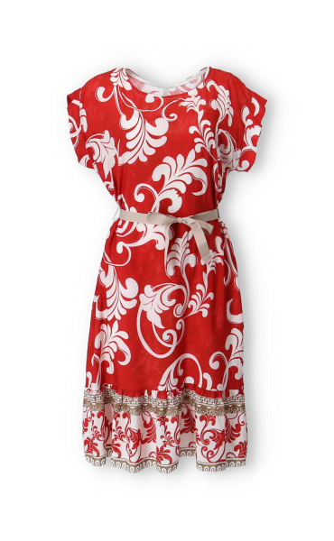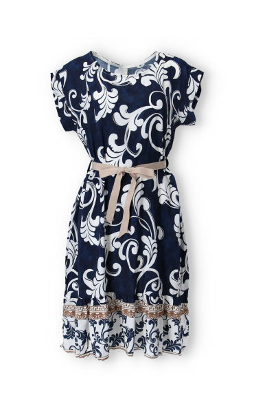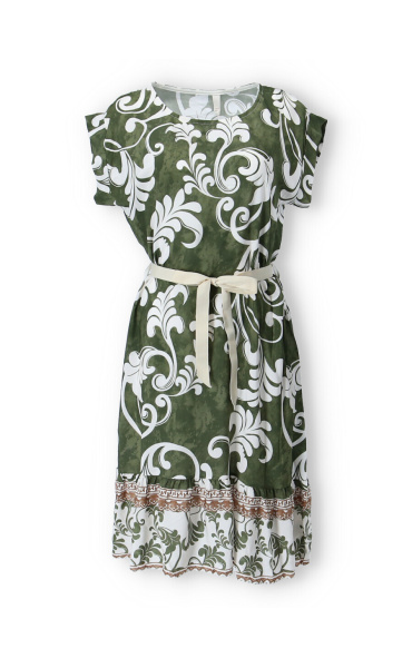 Dámské šaty se vzorem. Šaty mají kulatý výstřih, ve spodní části volán a v pase doplněny stuhou. Vyrobeno v Itálii.