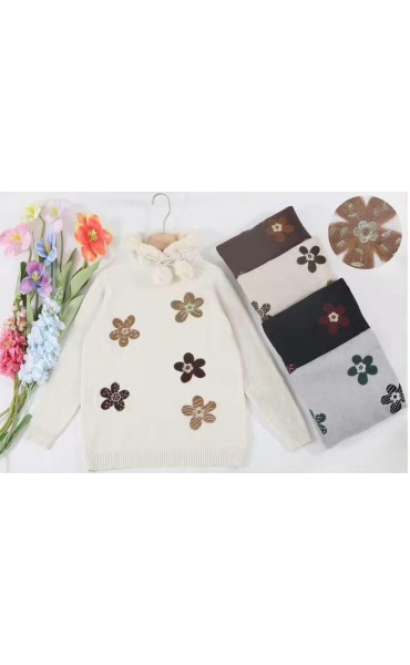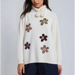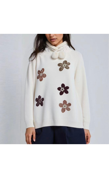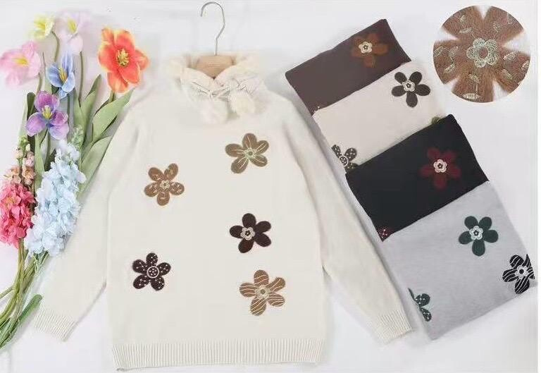 Stylový zimní svetřík s aplikací květů. Svetr je z příjemného úpletu a v oblasti krku má kožíškový límec s regulací.
