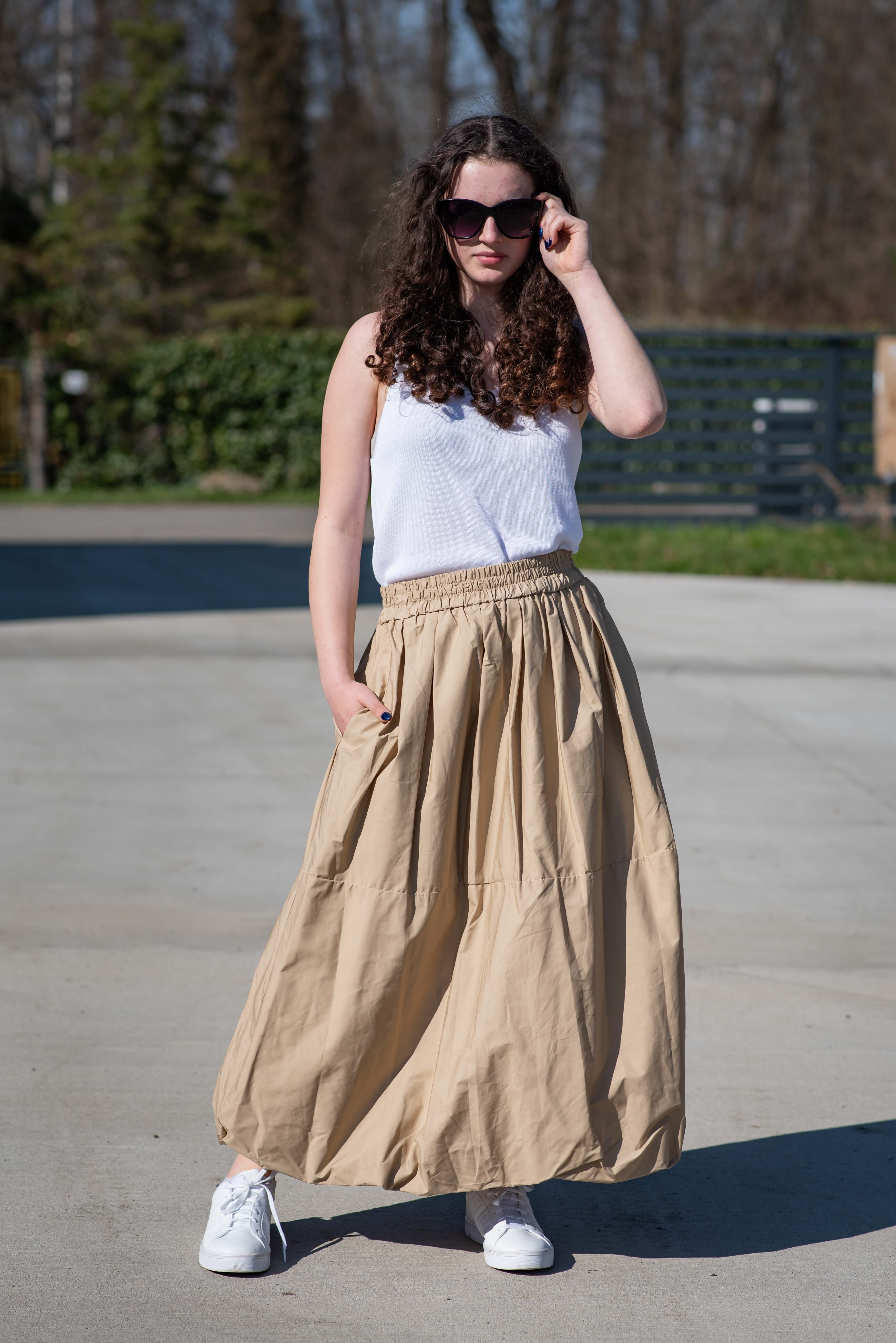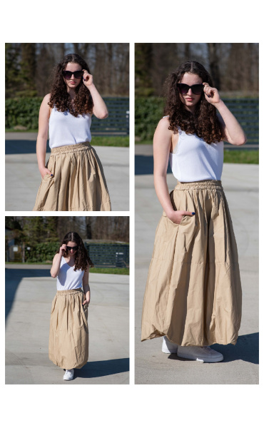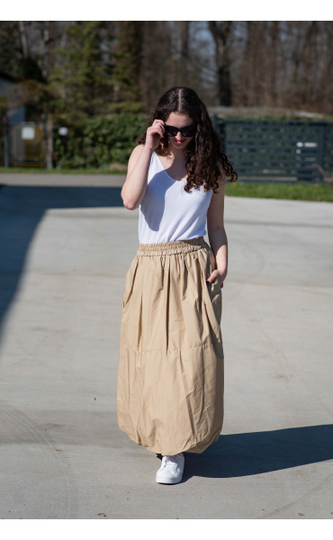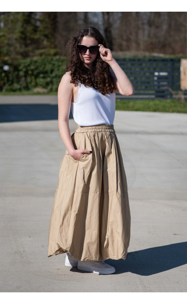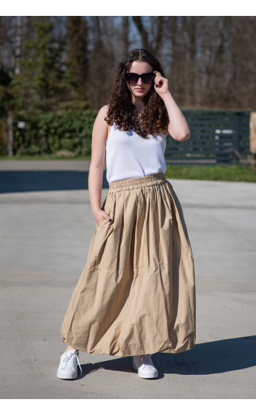 Dámská sukně balónového střihu v MIDI délce. Sukně má všité kapsy po stranách a v pase je do gumy.