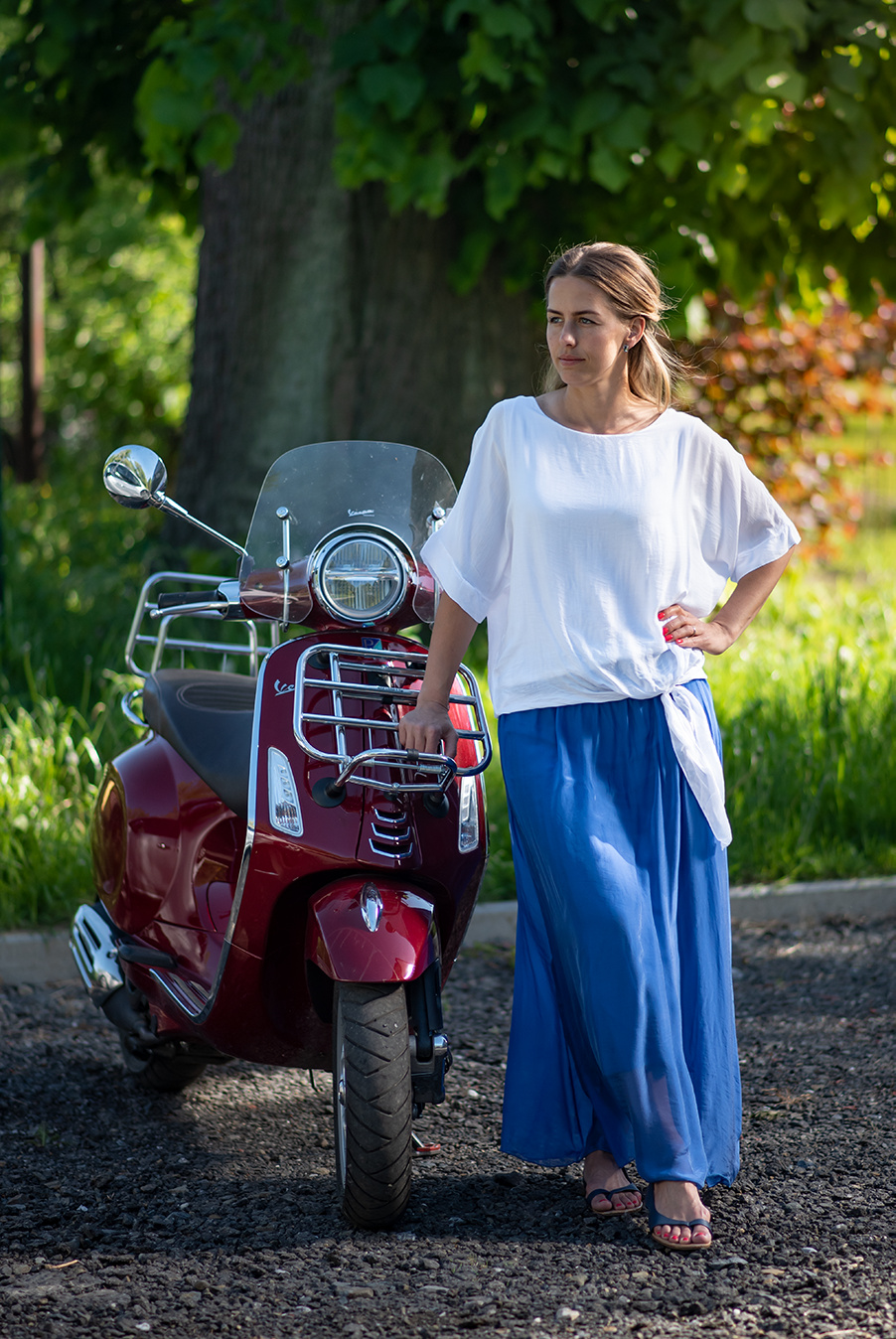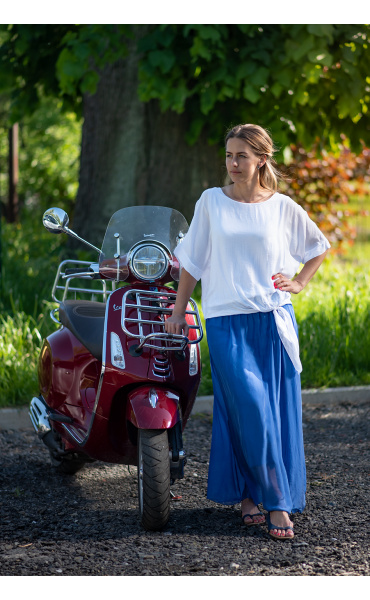 Dlouhá sukně s páskem z mačkaného materiálu doplněná páskem. Sukně má podšívku a v pase je do gumy.