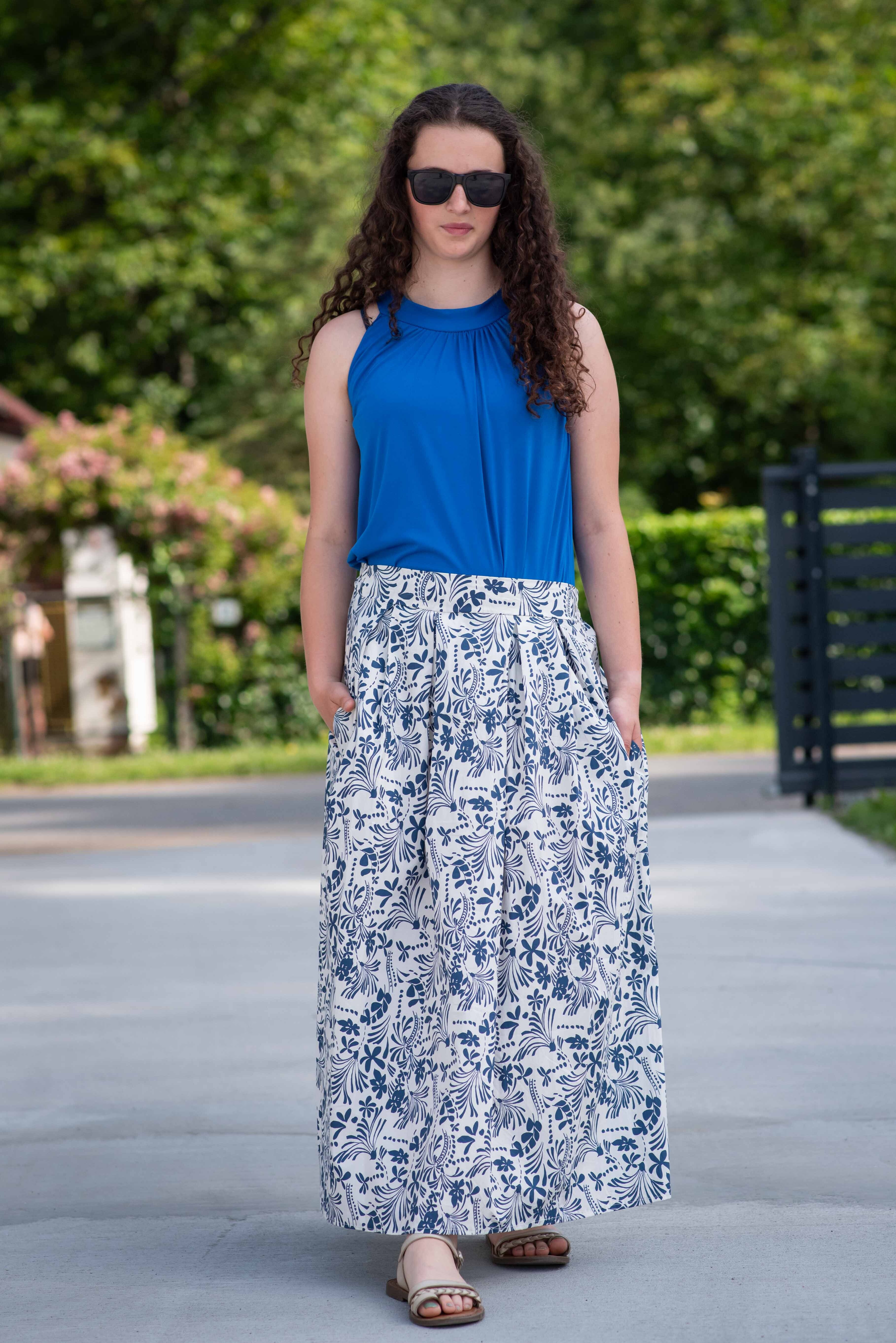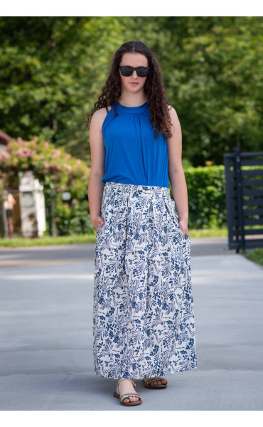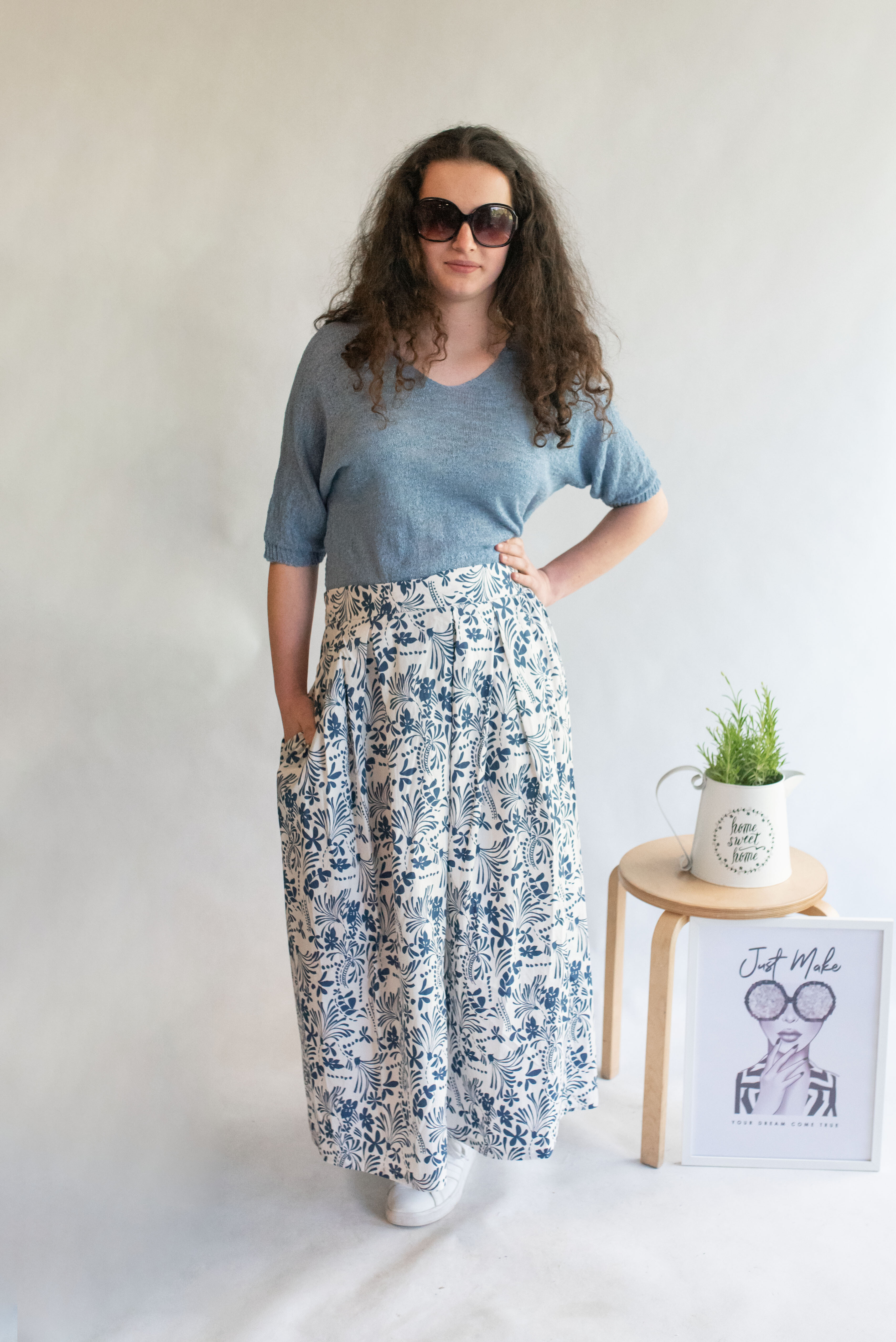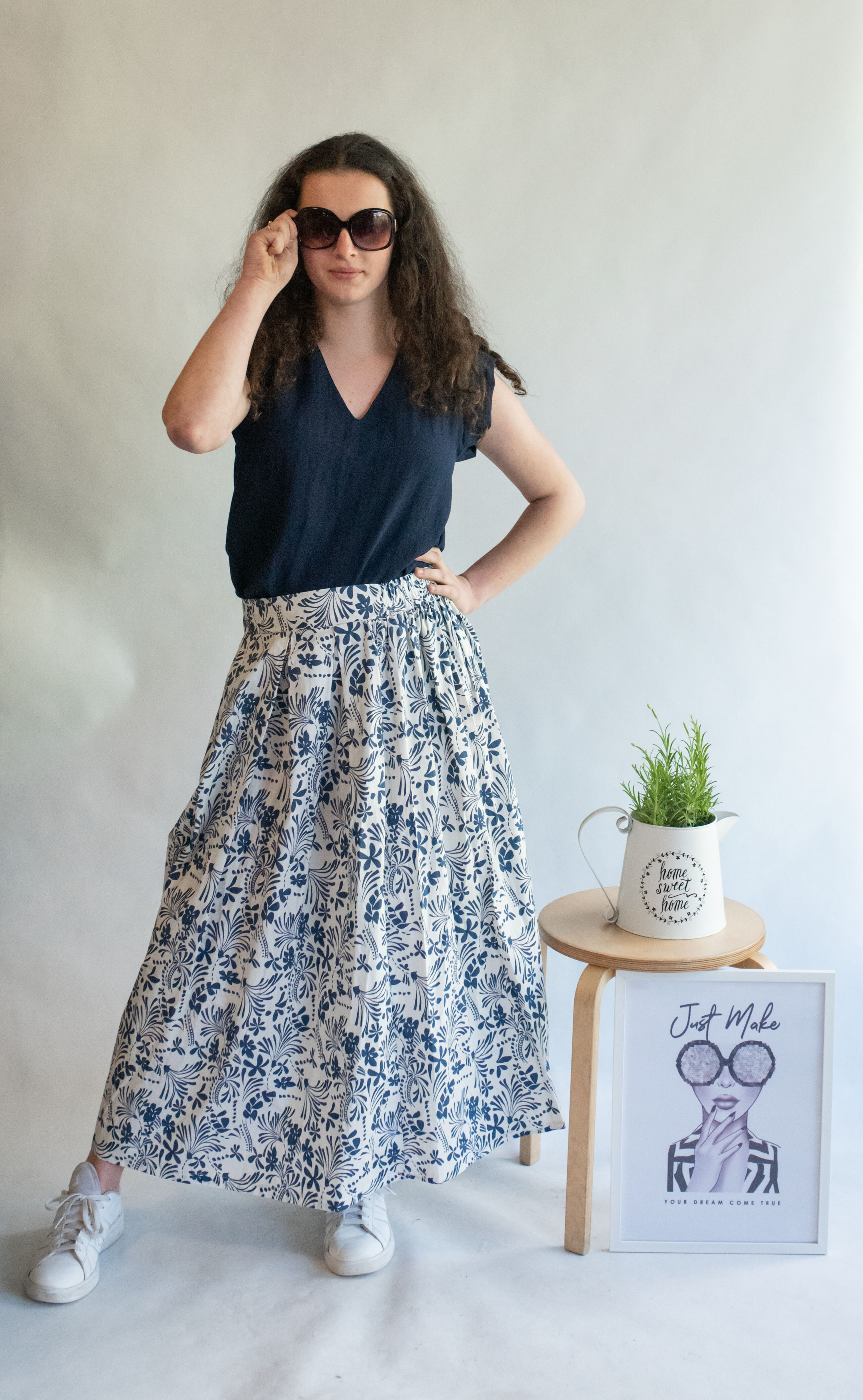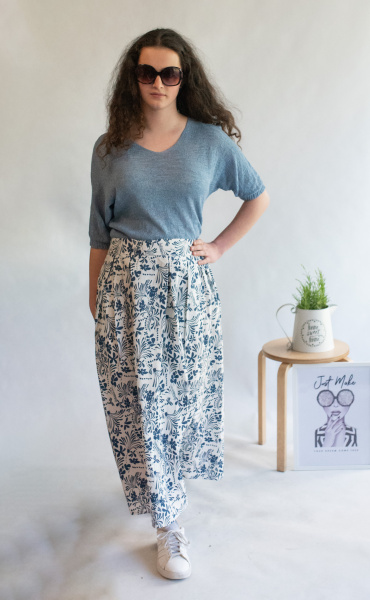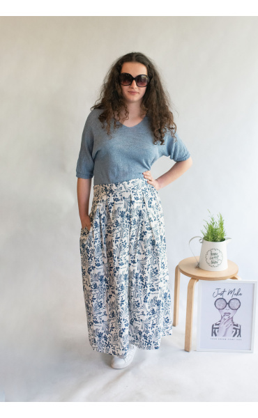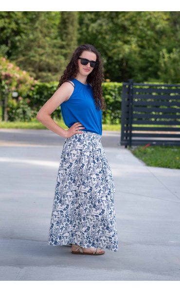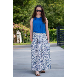 Dlouhá sukně áčkového střihu, zadní část pasu na gumu. Sukně má všité kapsy po stranách