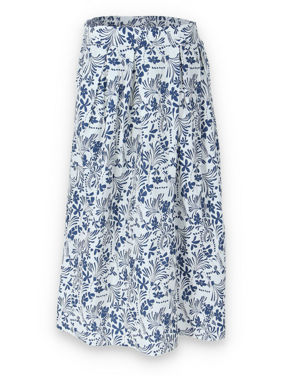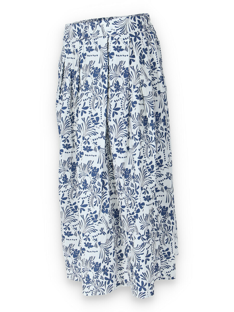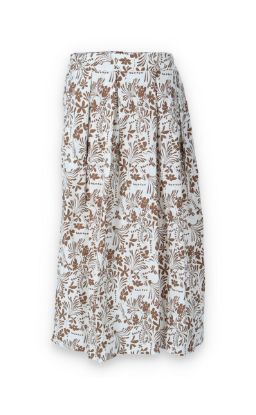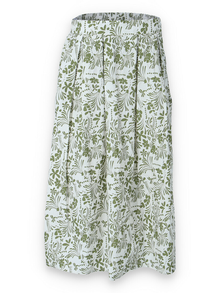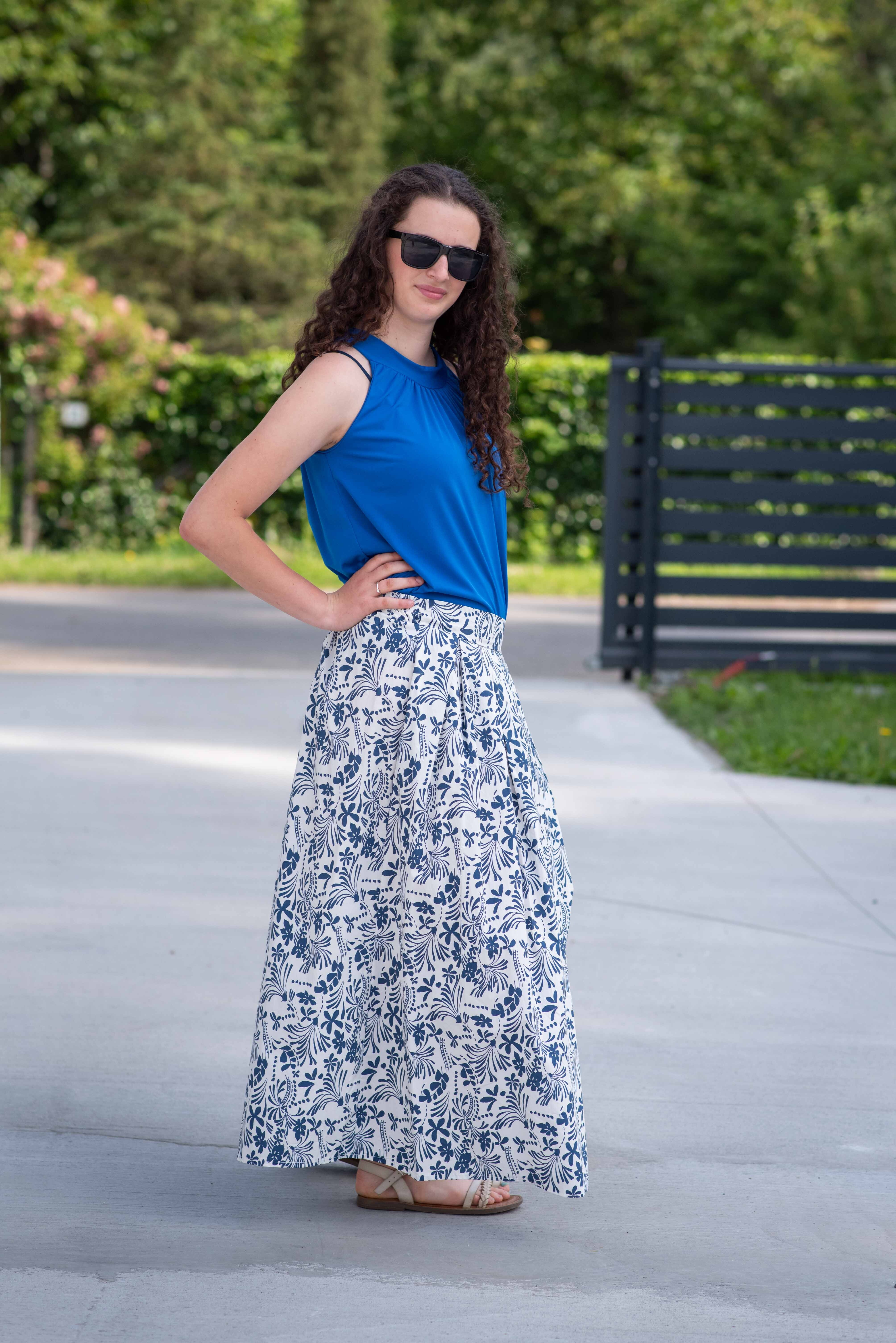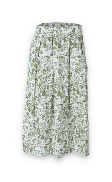 Dlouhá sukně áčkového střihu, zadní část pasu na gumu. Sukně má všité kapsy po stranách