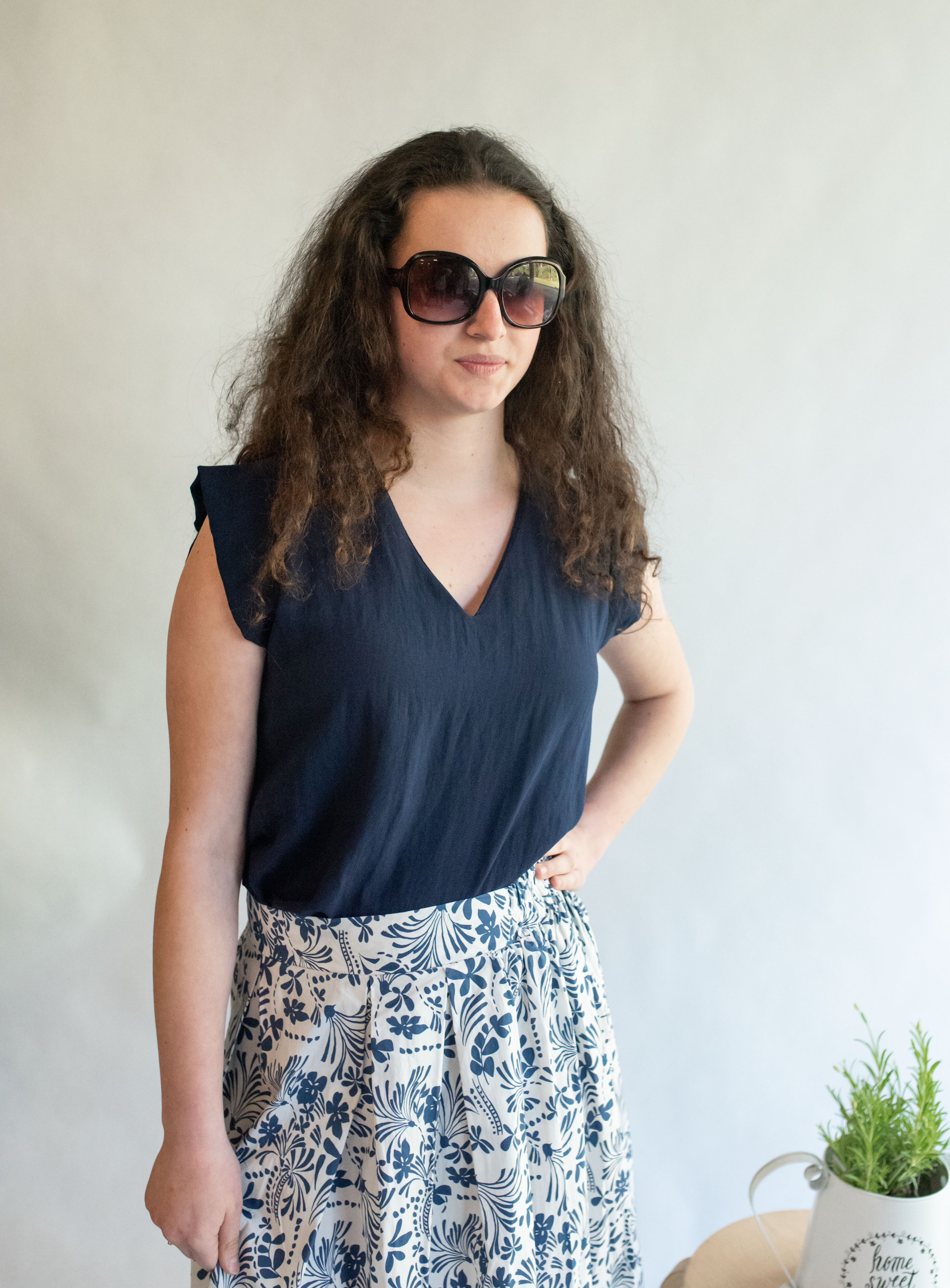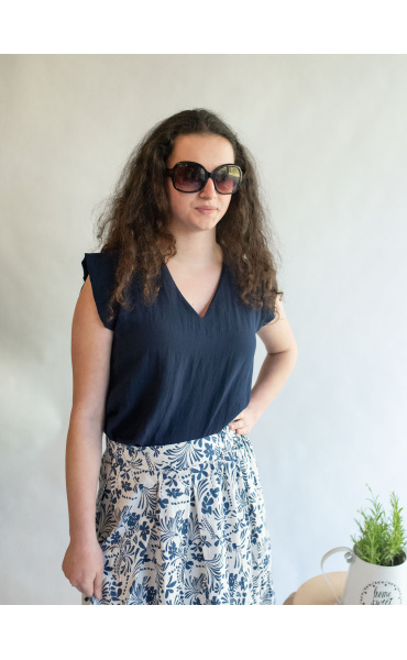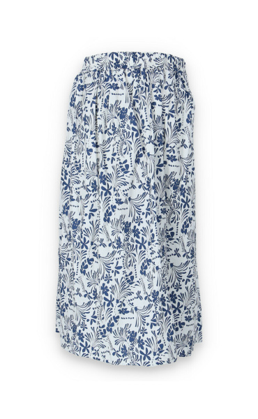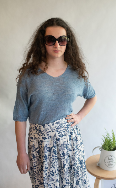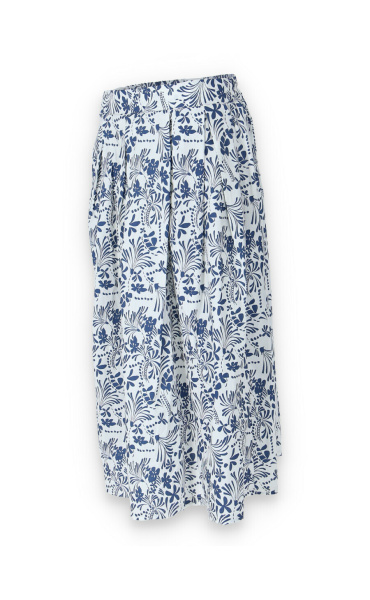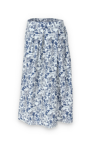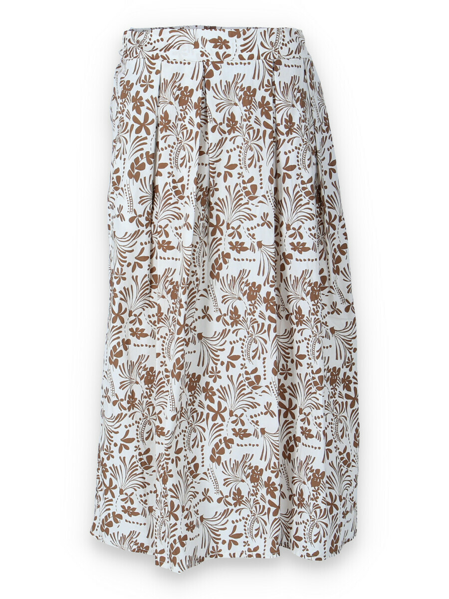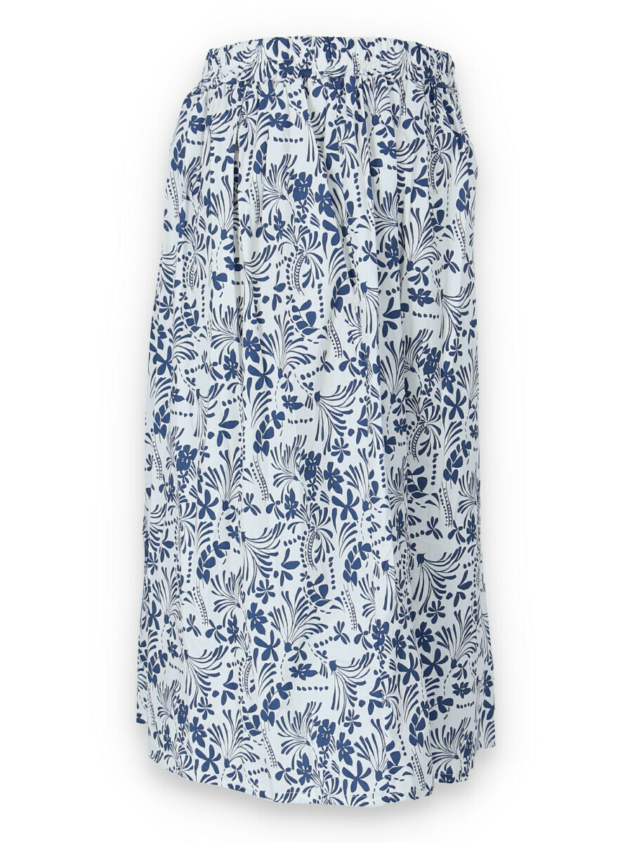 Dlouhá sukně áčkového střihu, zadní část pasu na gumu. Sukně má všité kapsy po stranách