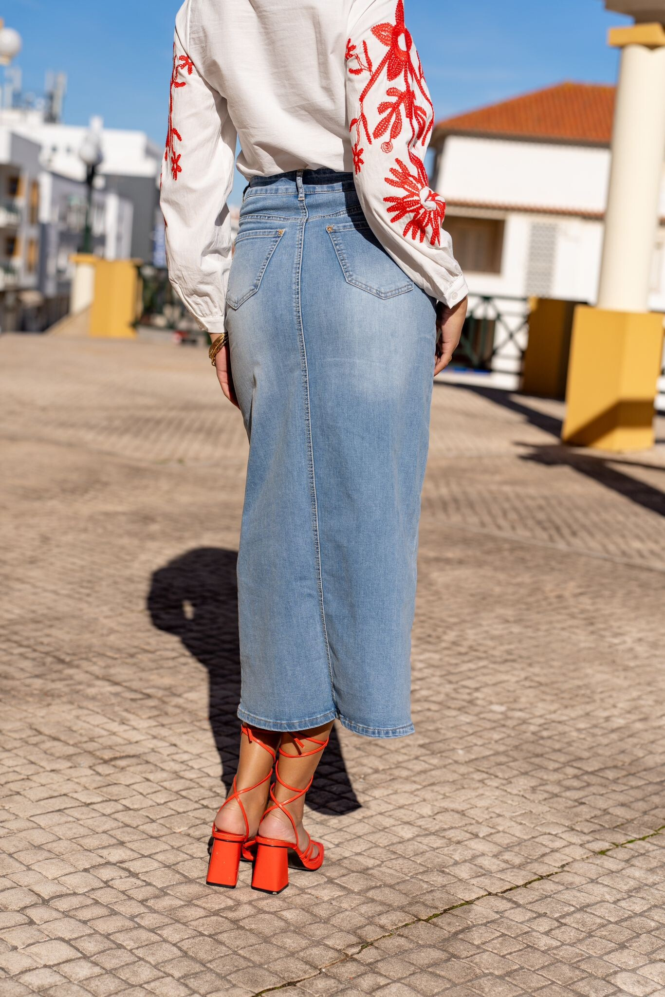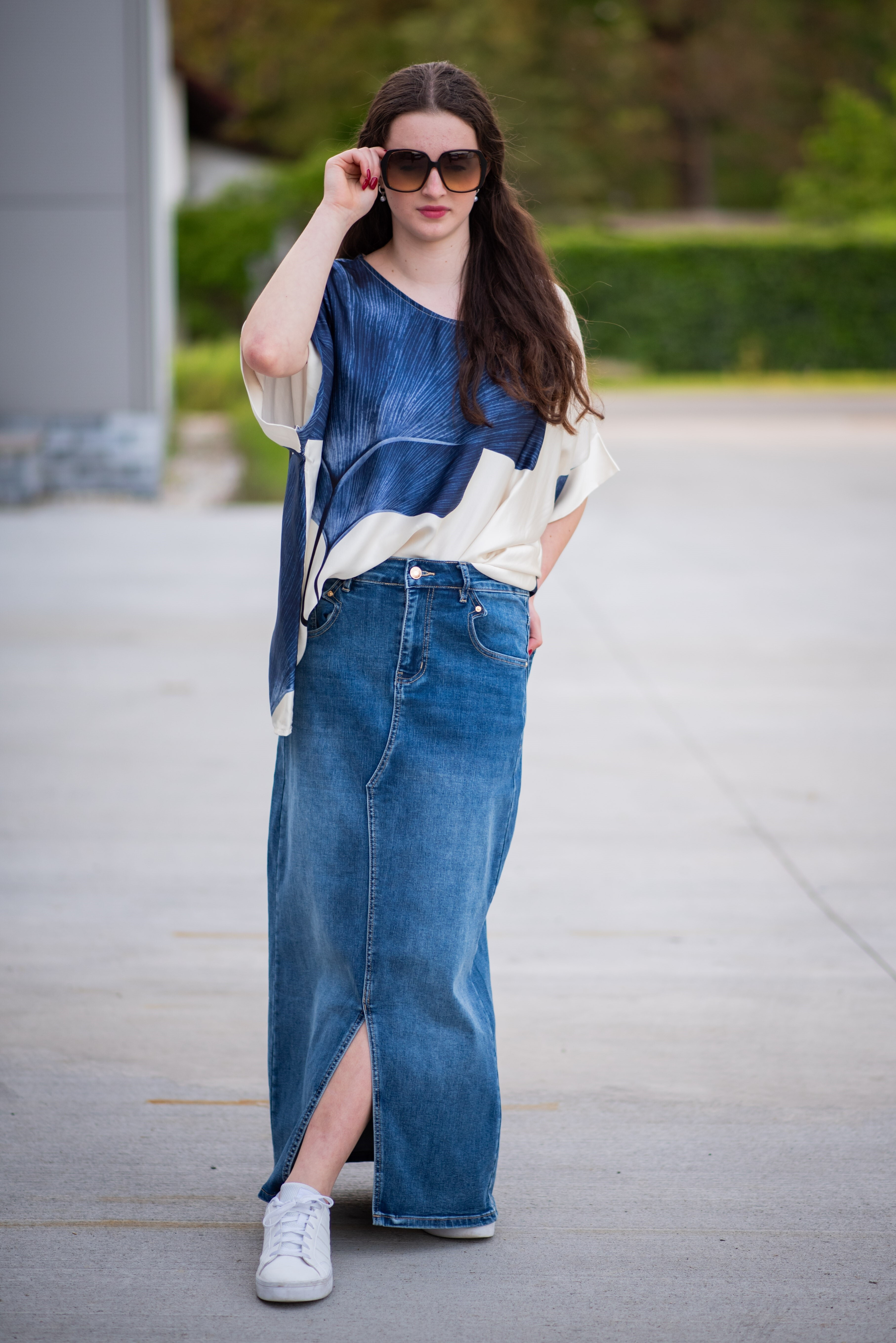 Trendy džínová sukně v MAXI délce. Sukně je na zip a knoflík, na přední straně rozparek, zadní strana má našité kapsy.