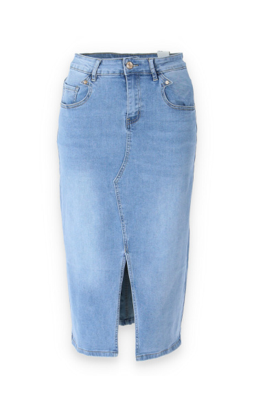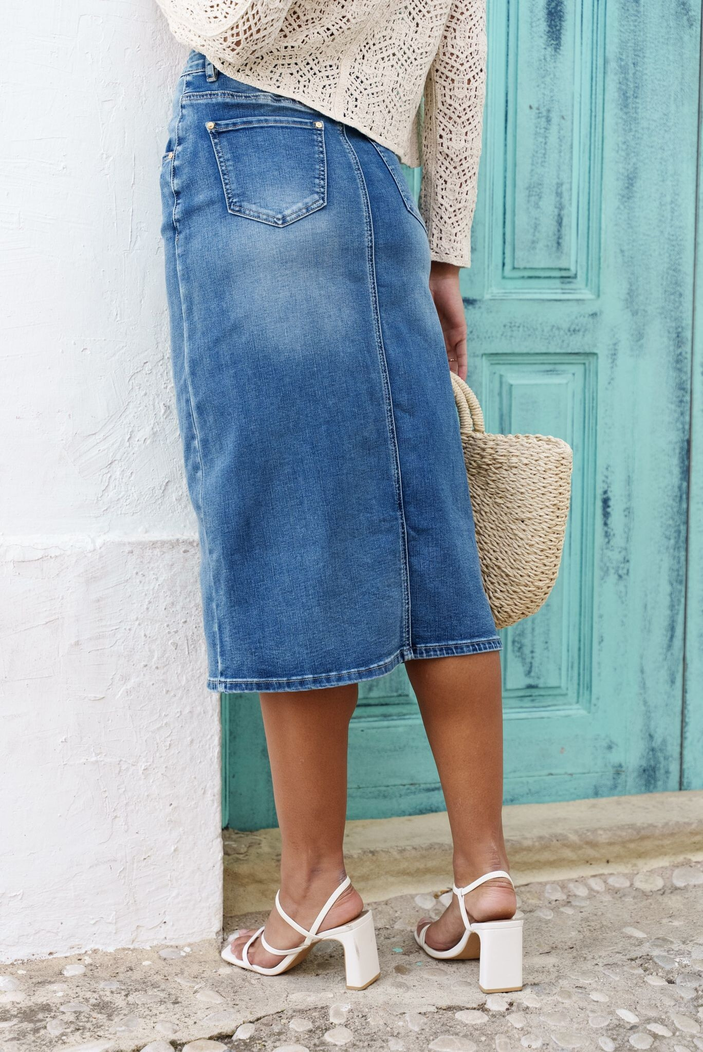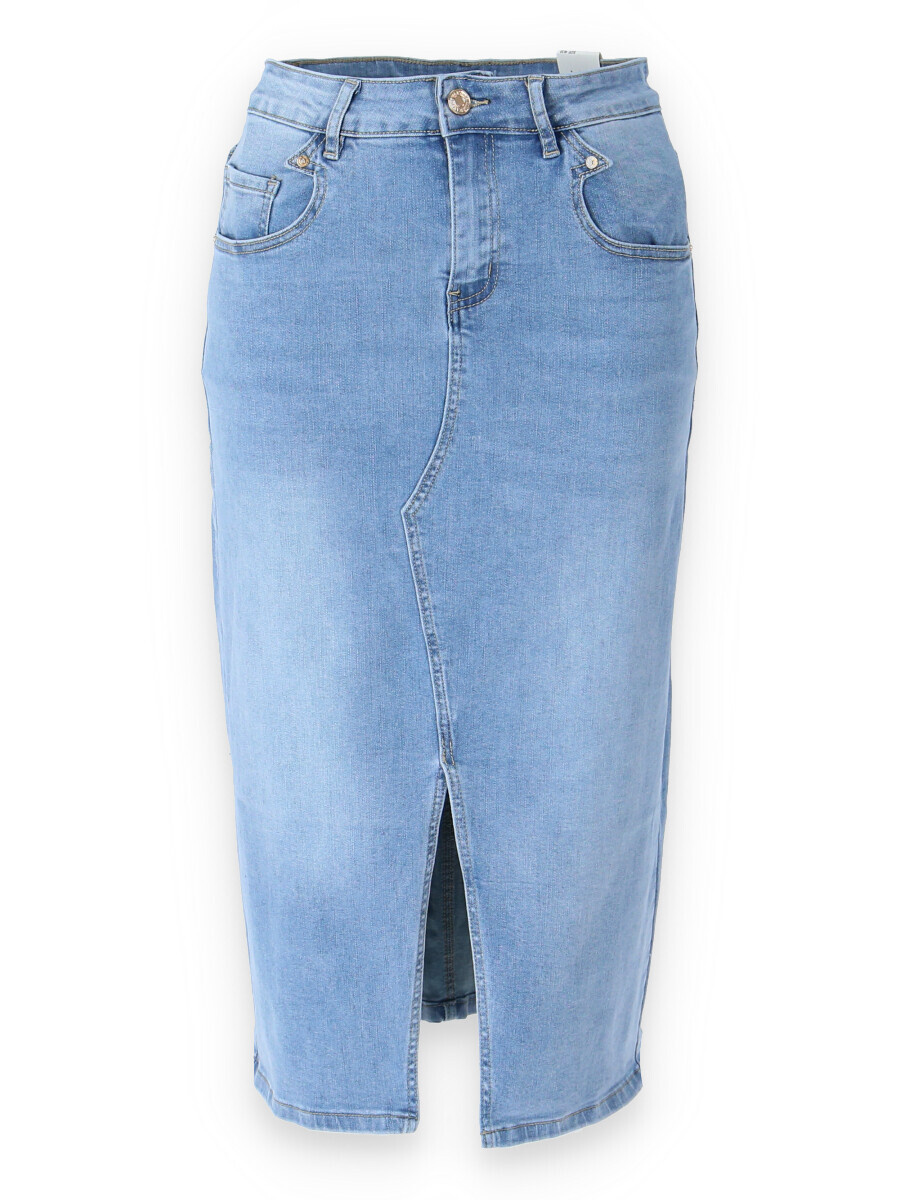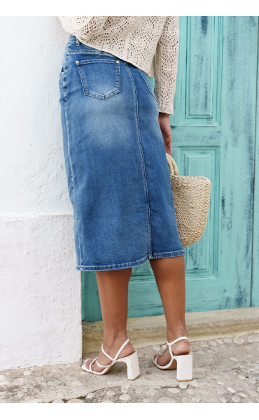 Trendy džínová sukně v midi délce. Sukně je v pase na zip a knoflík, na přední straně rozparek ve spodní částí, zadní strana má našité kapsy.