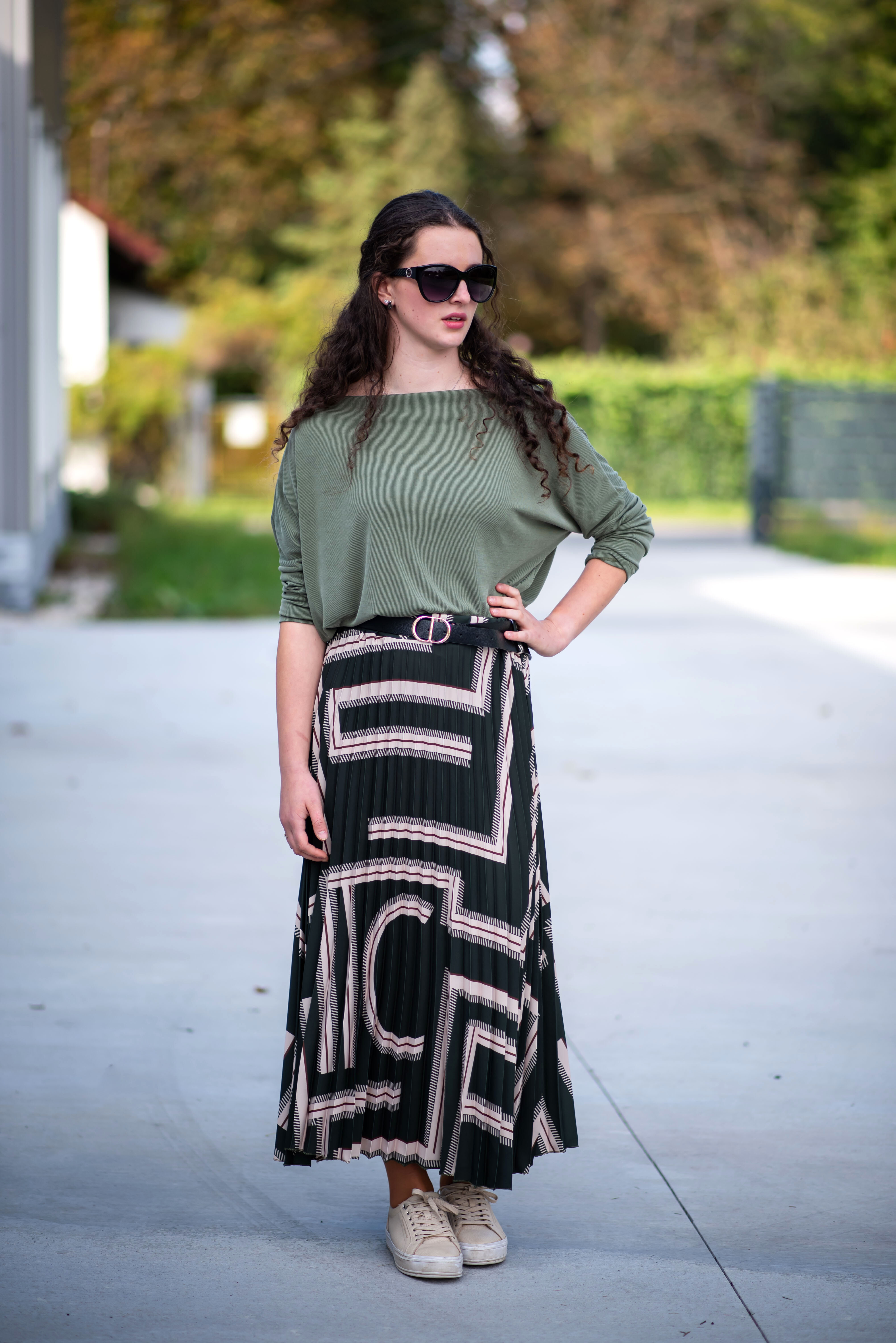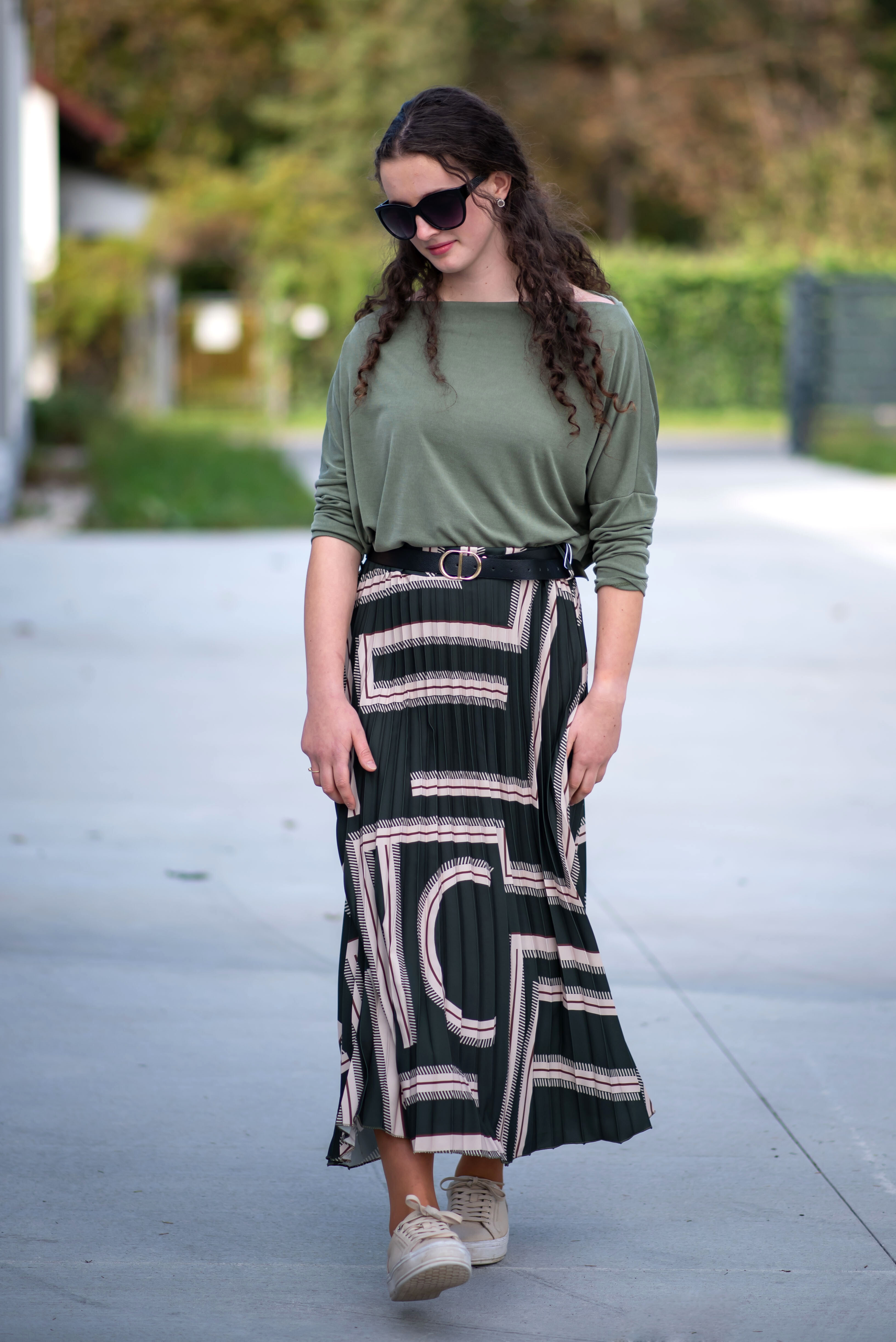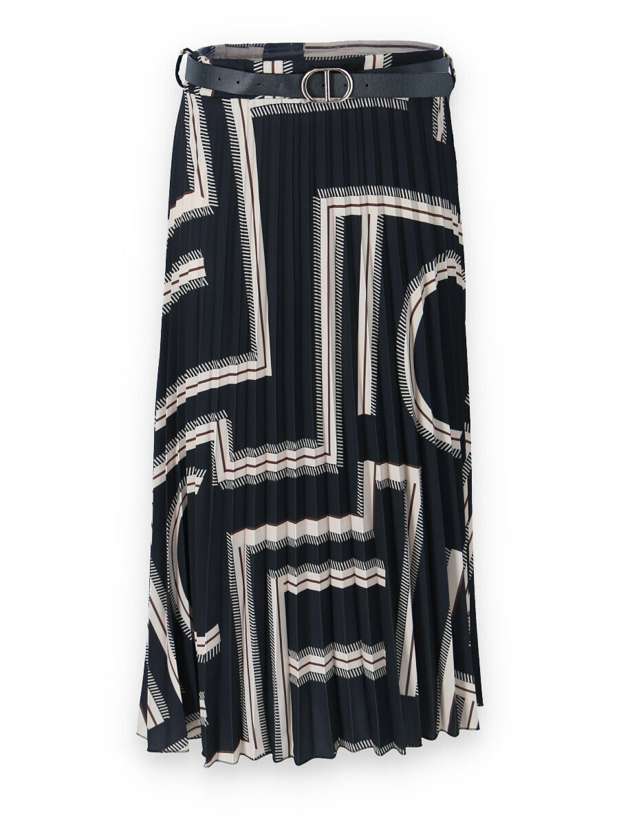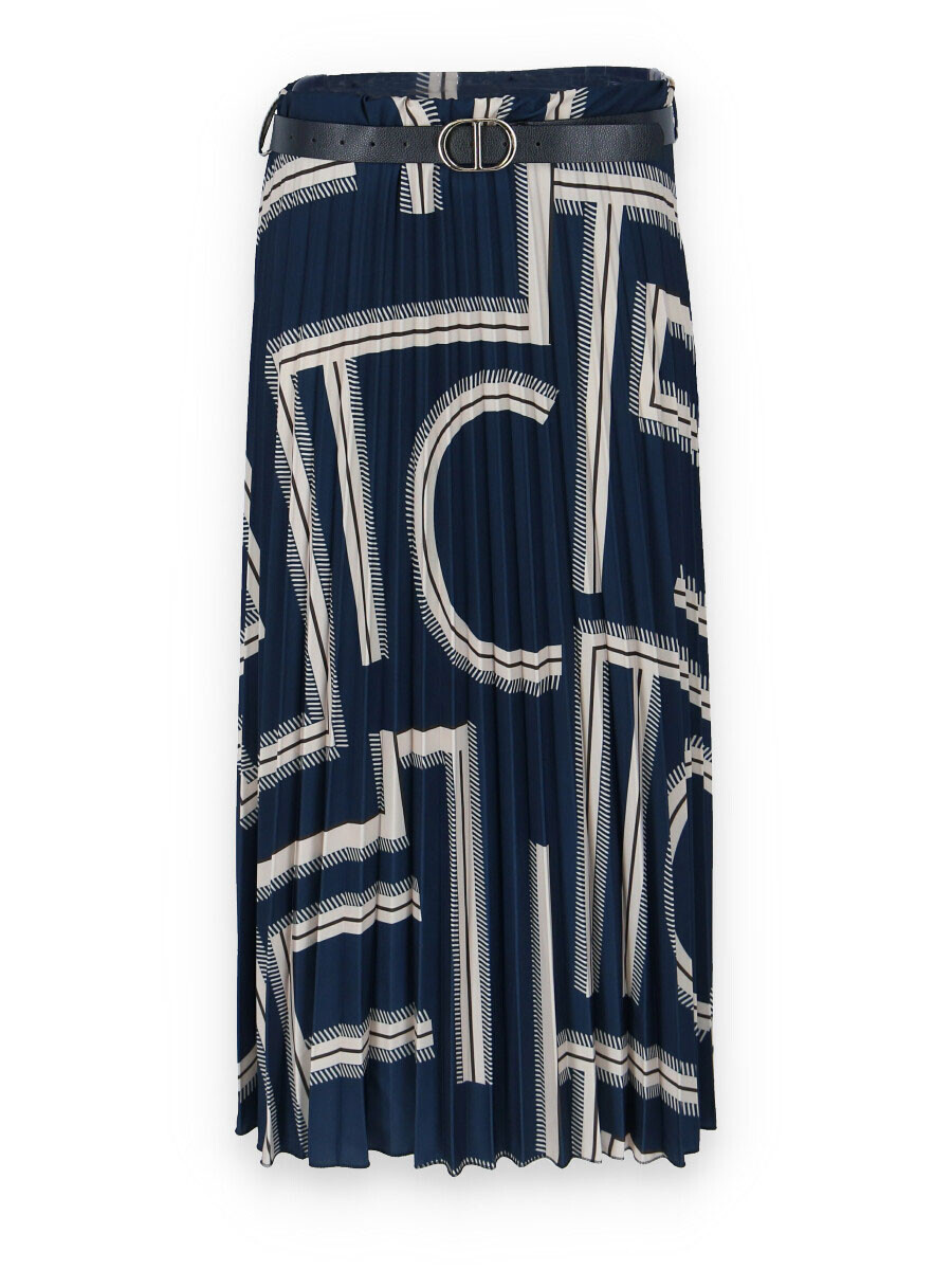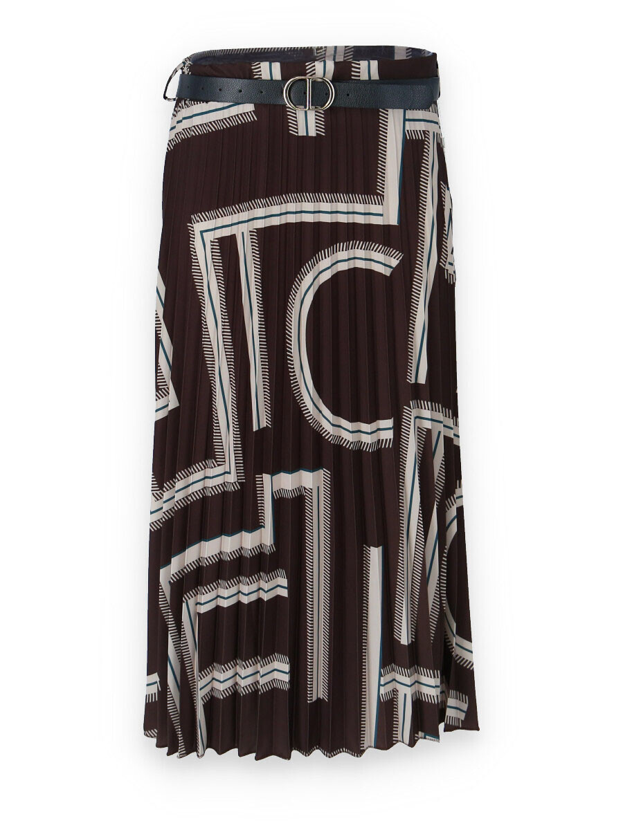 Sukně plisé s potiskem, sukně je v pase do gumy, doplněná páskem.