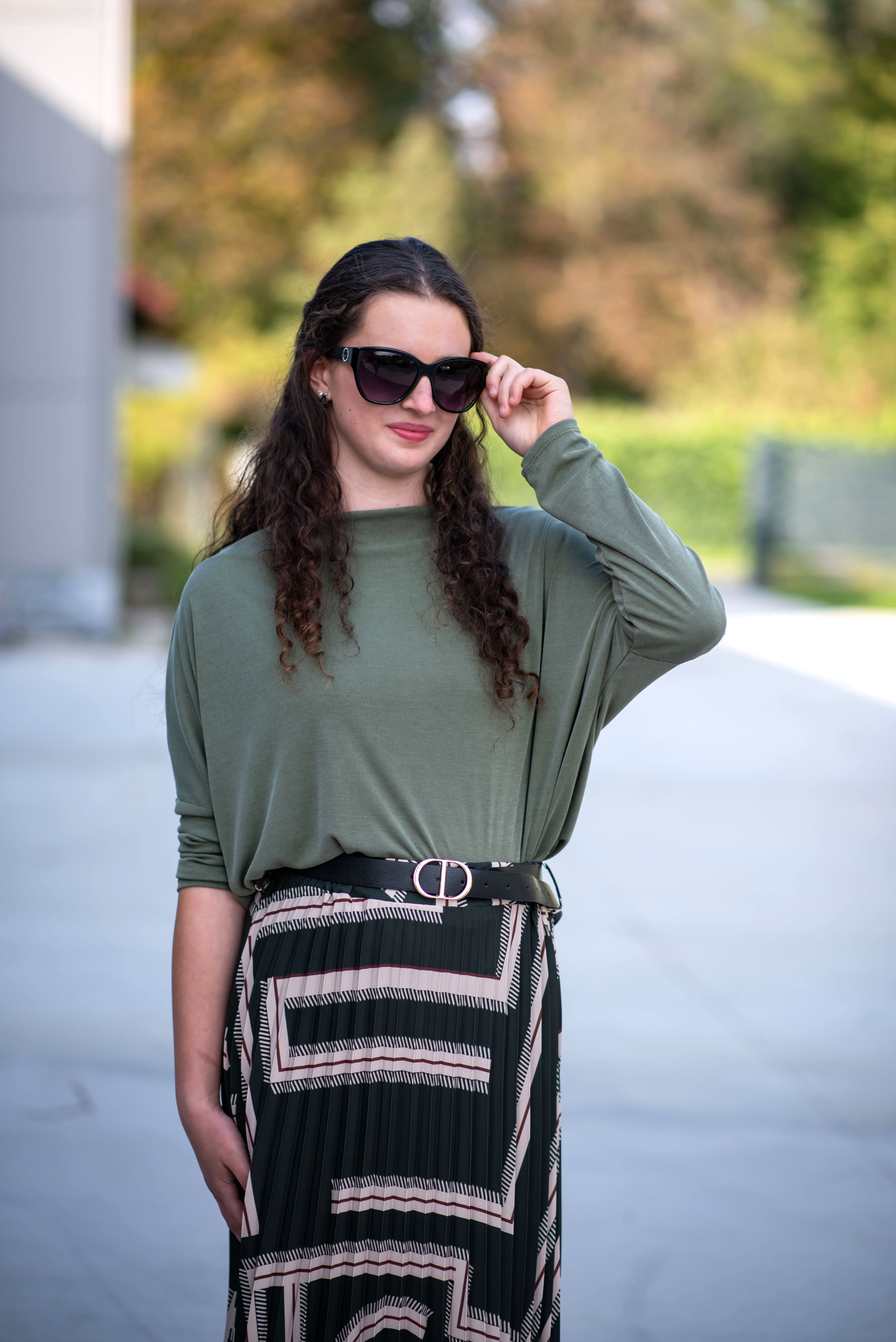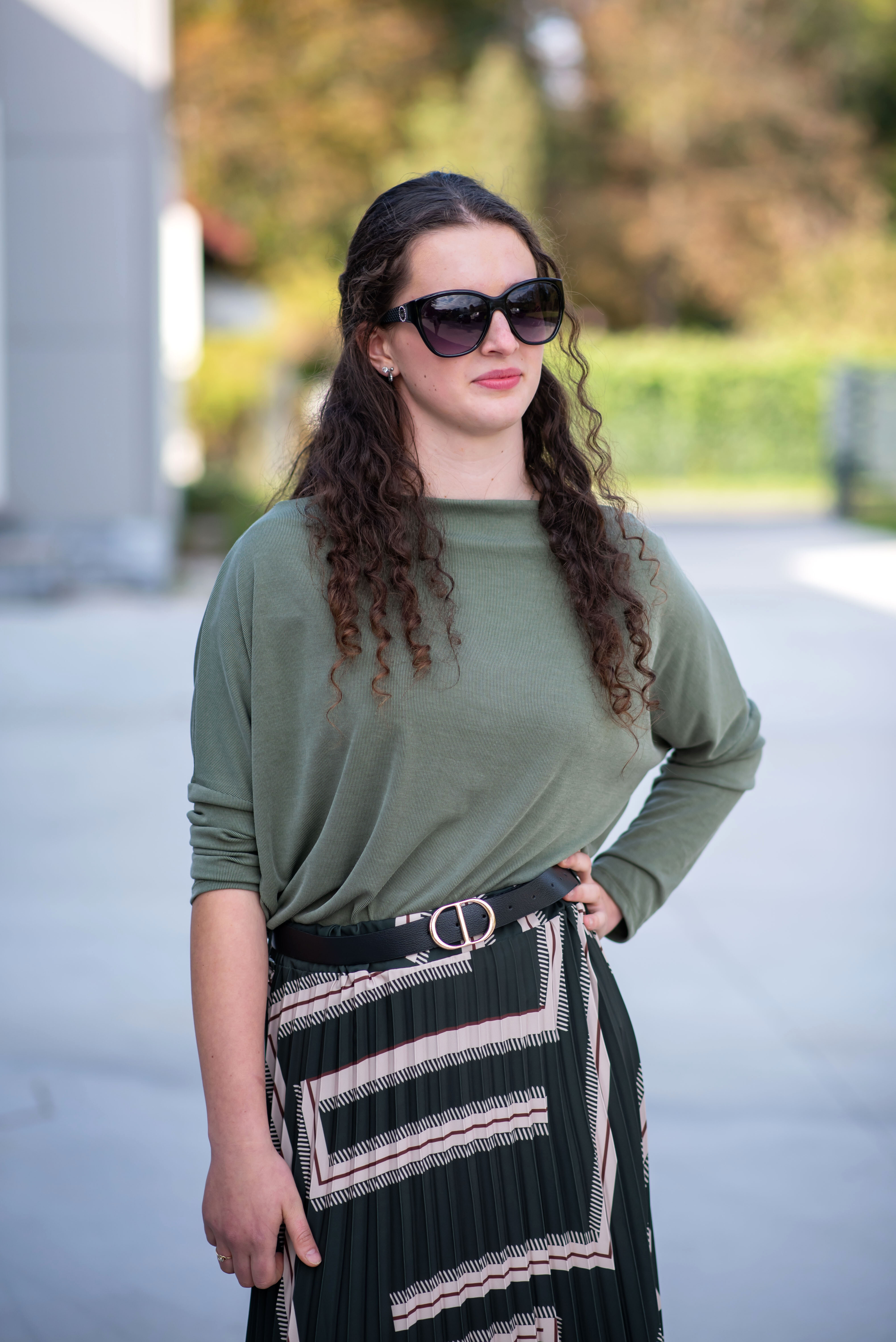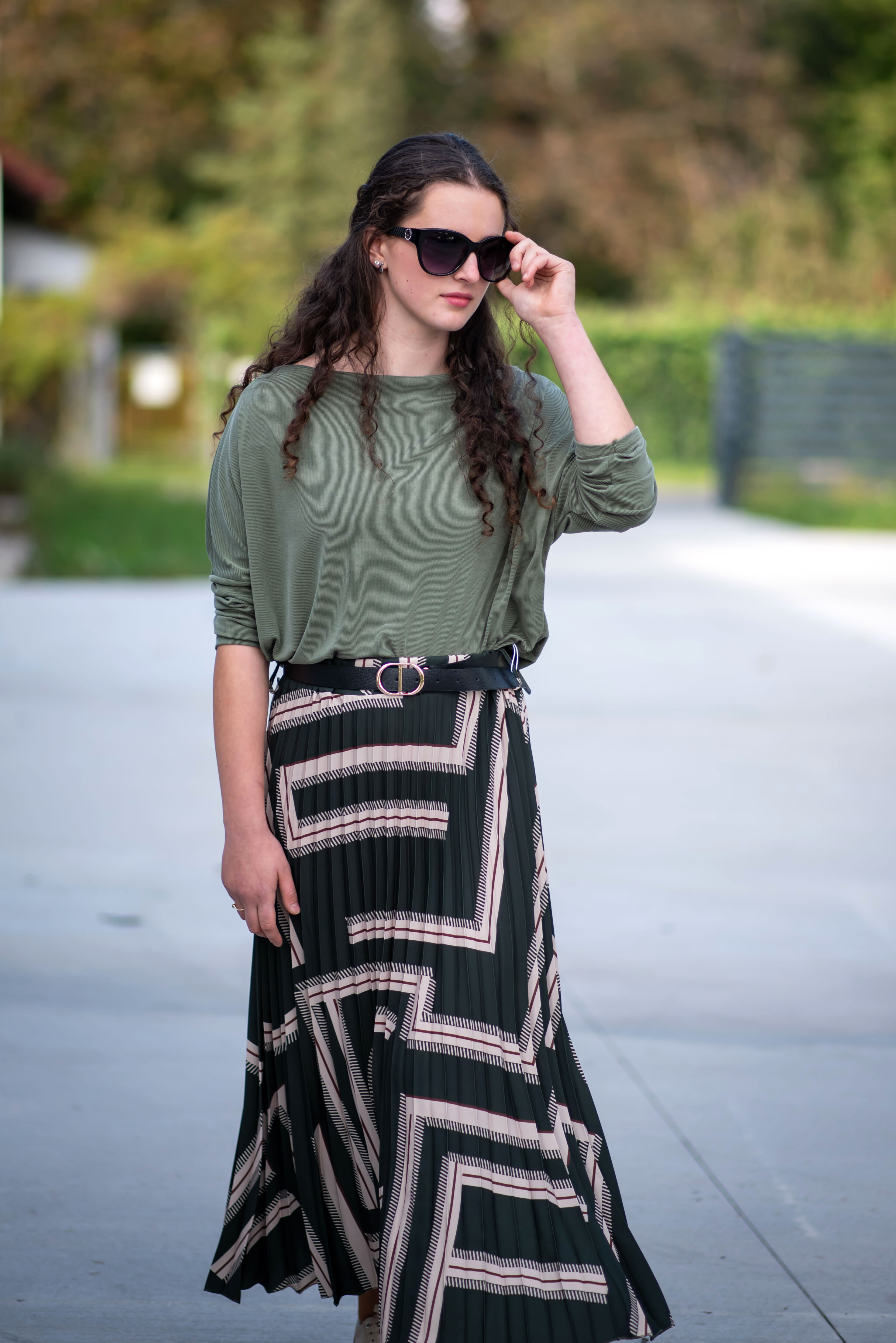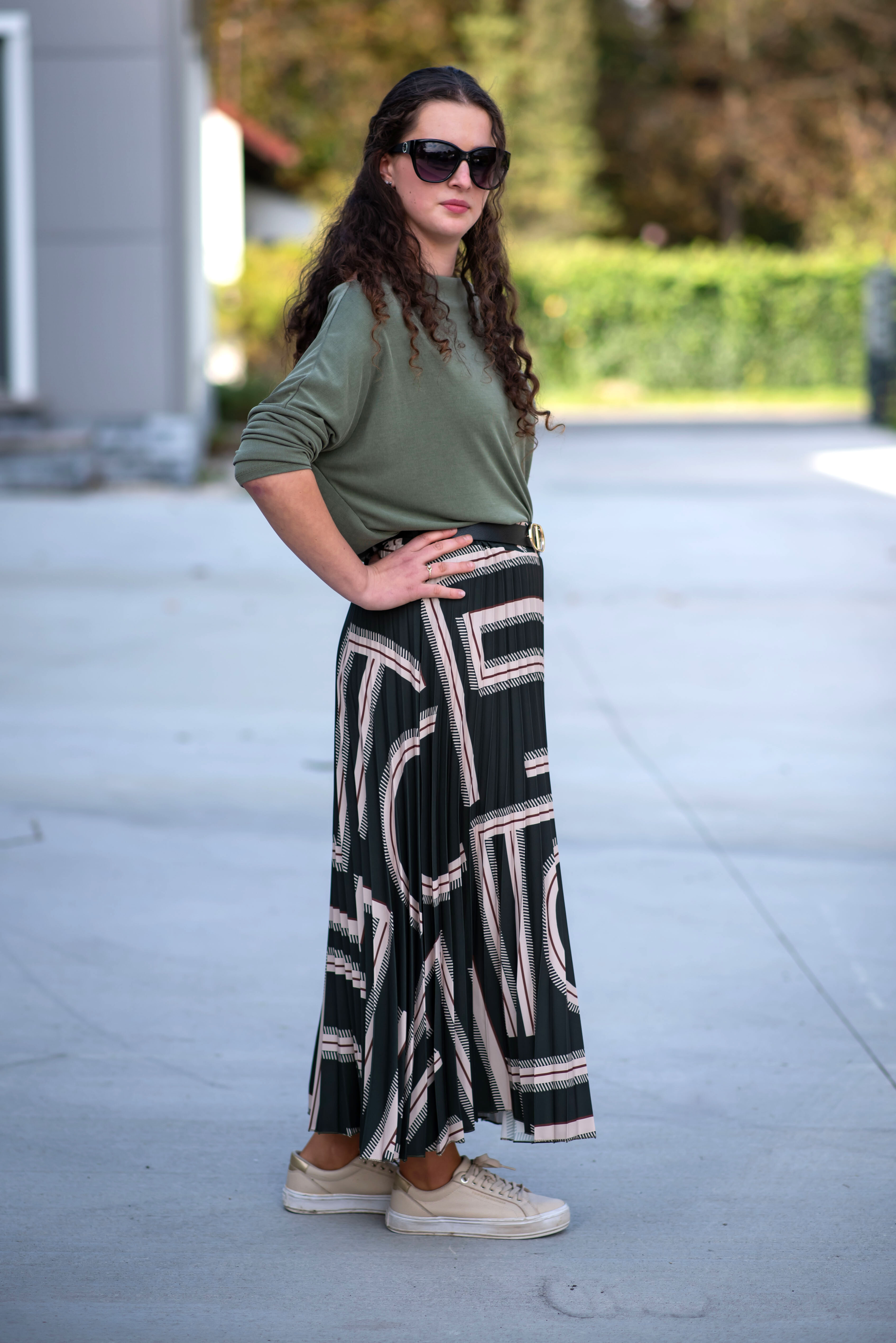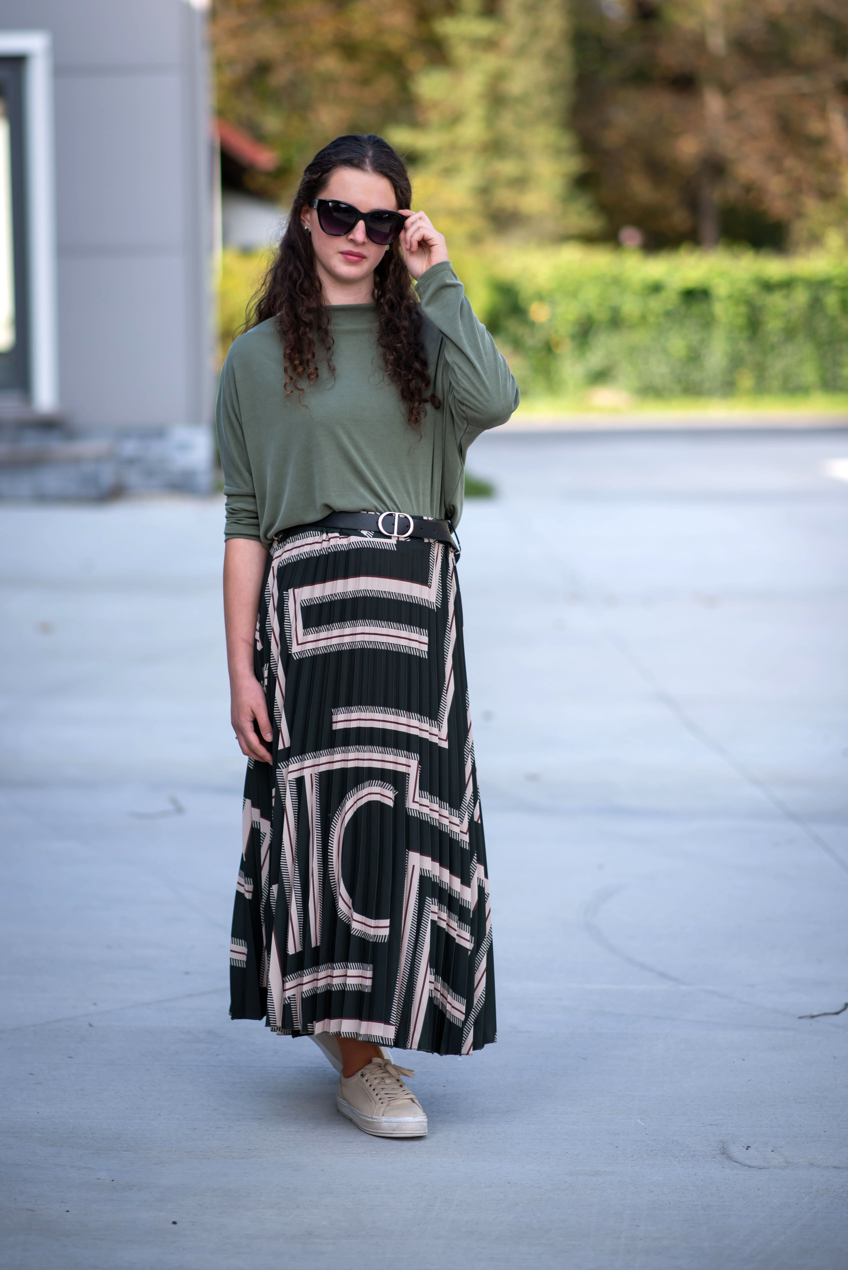 Sukně plisé s potiskem, sukně je v pase do gumy, doplněná páskem.