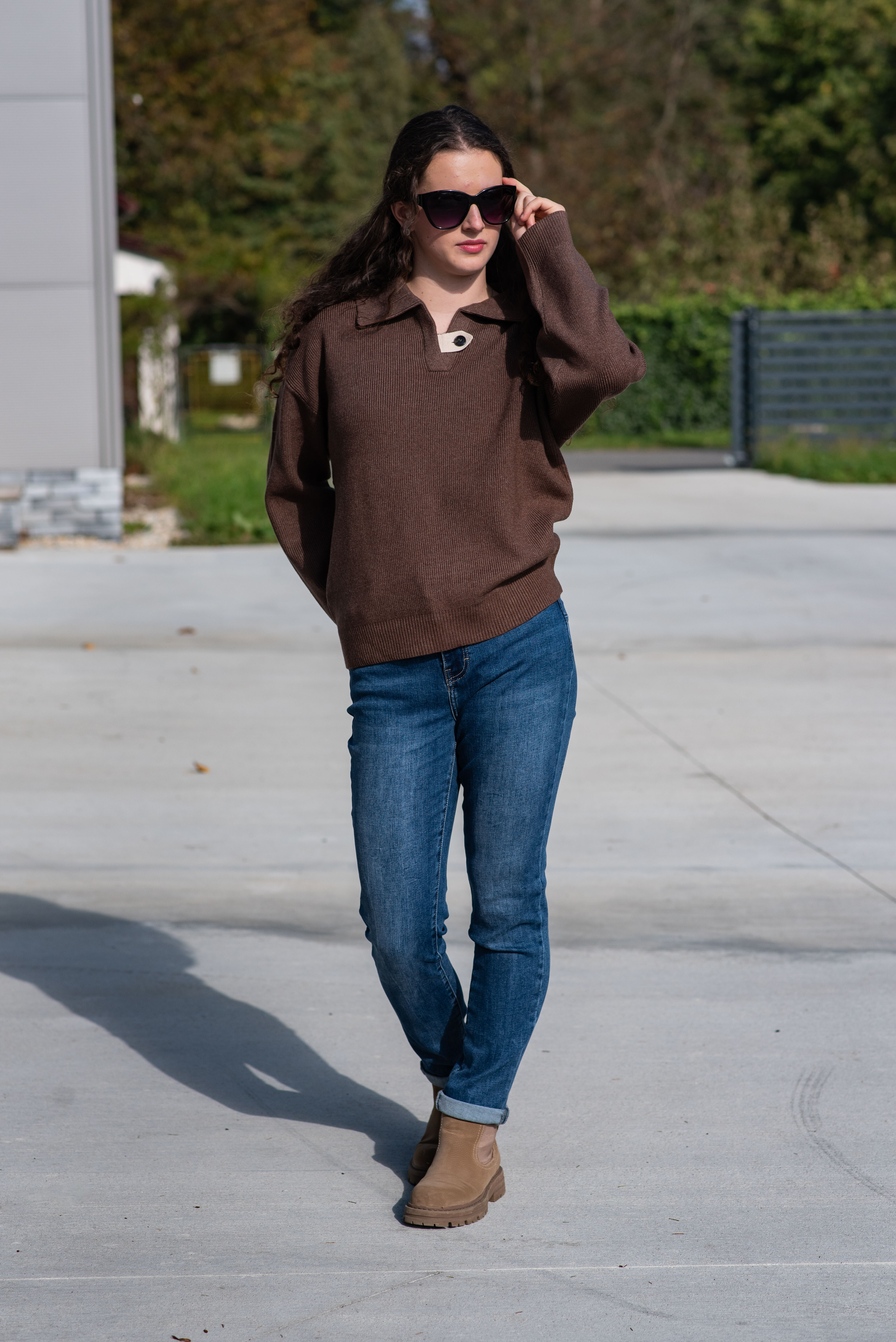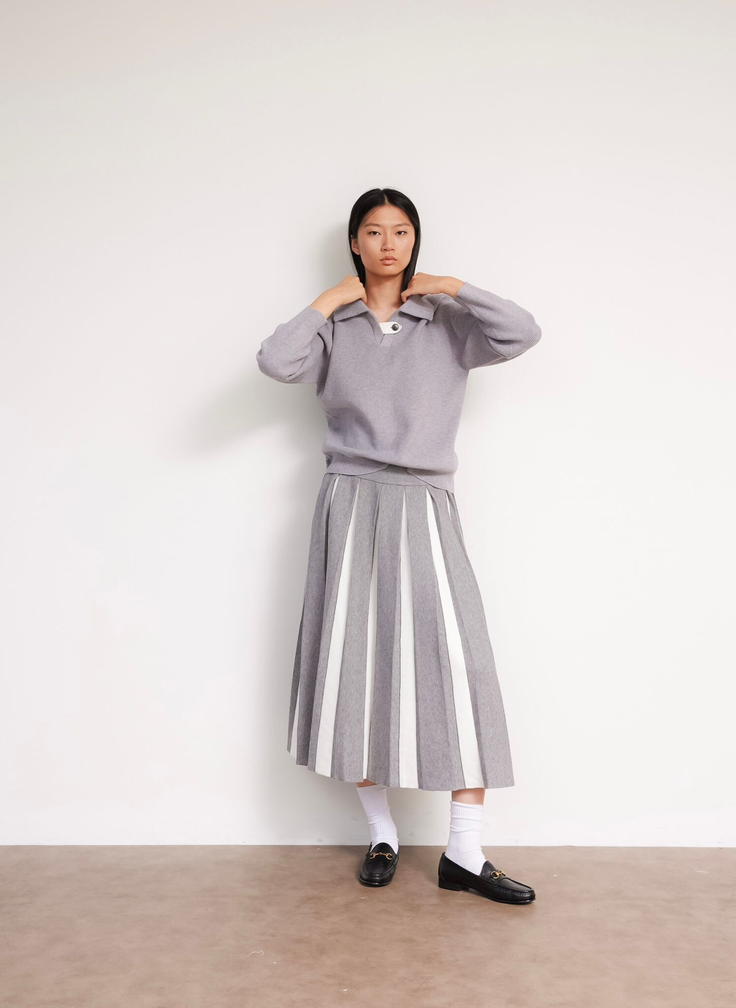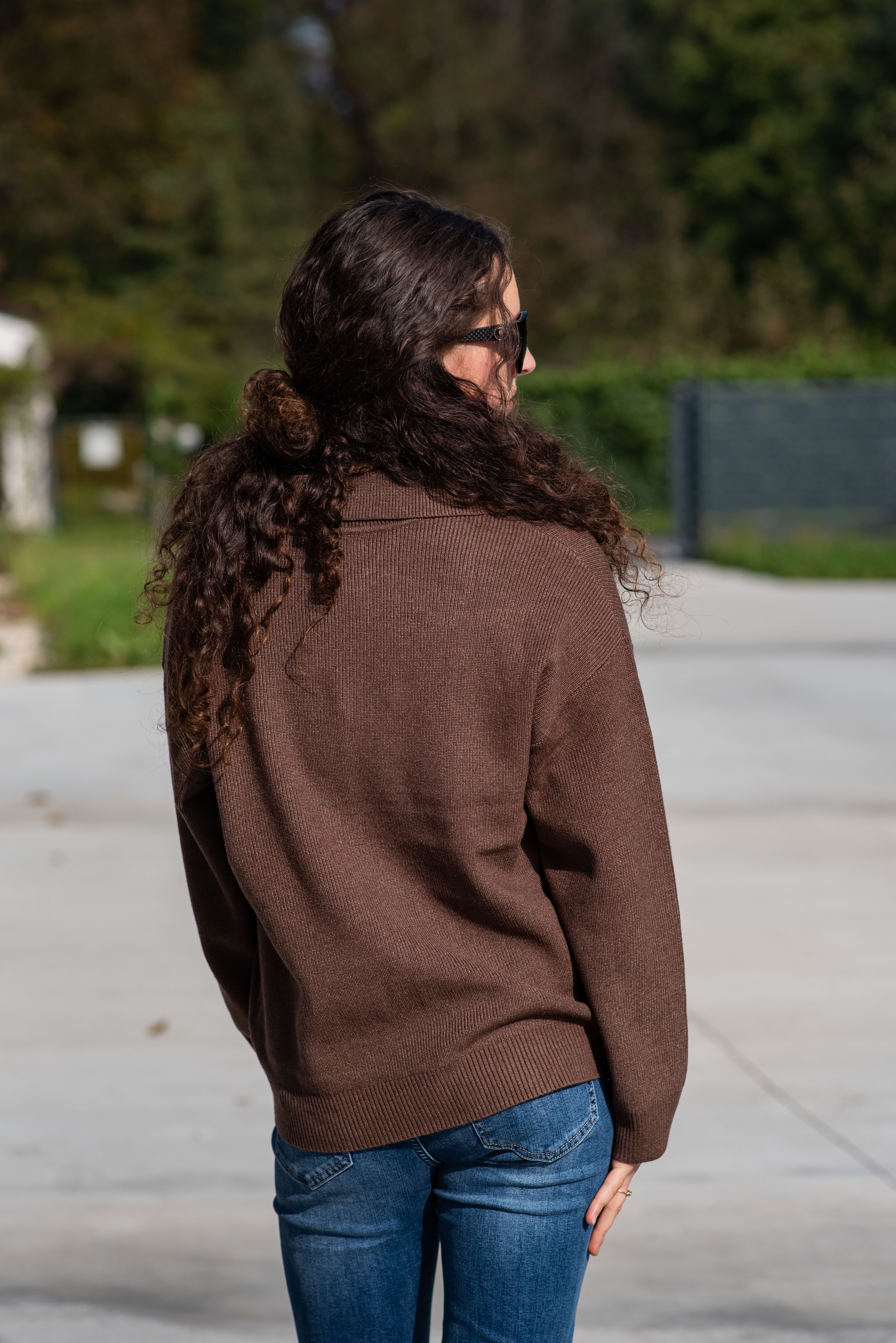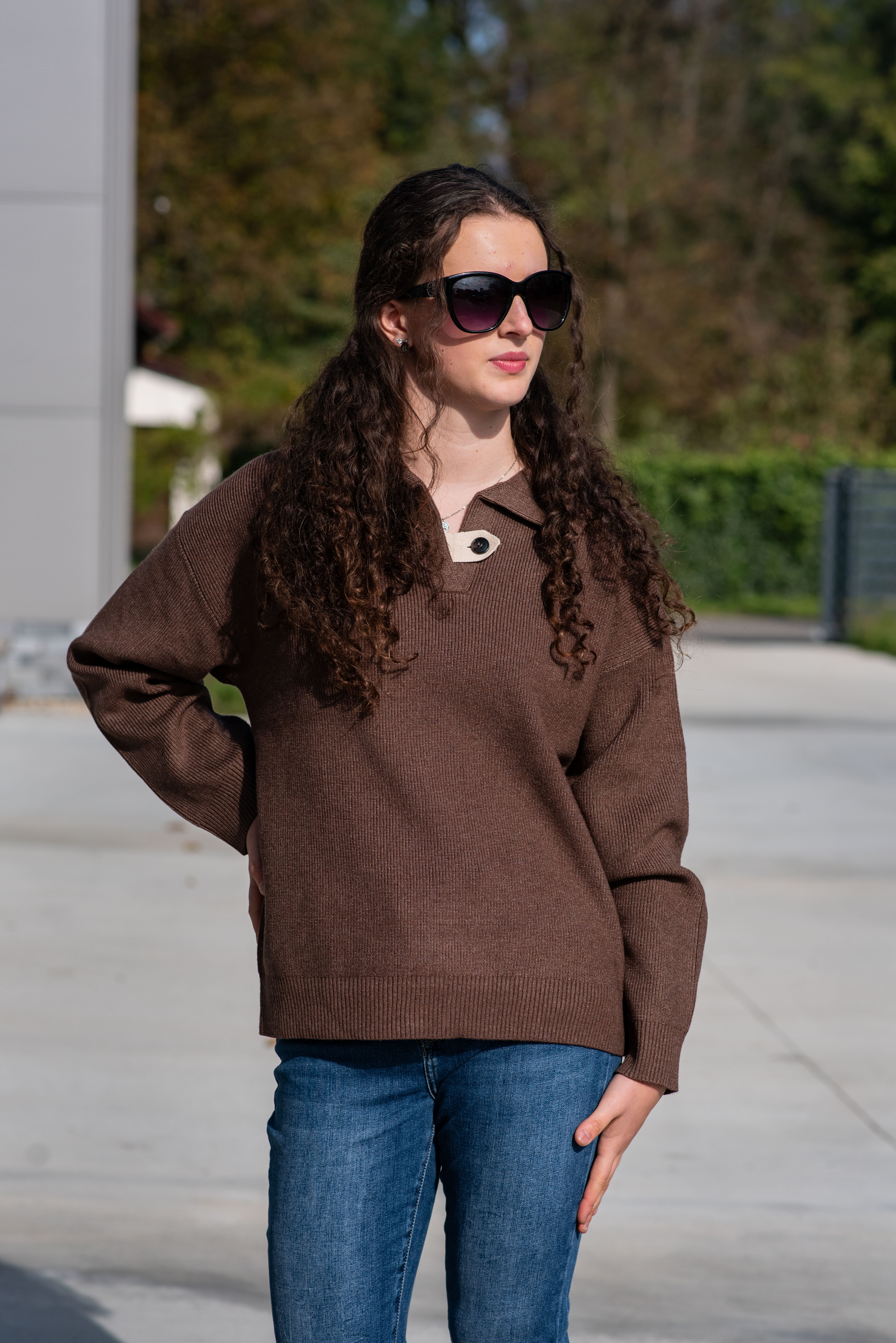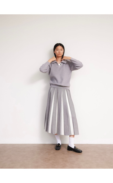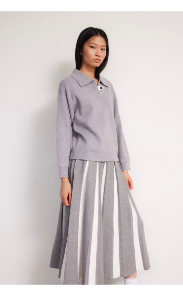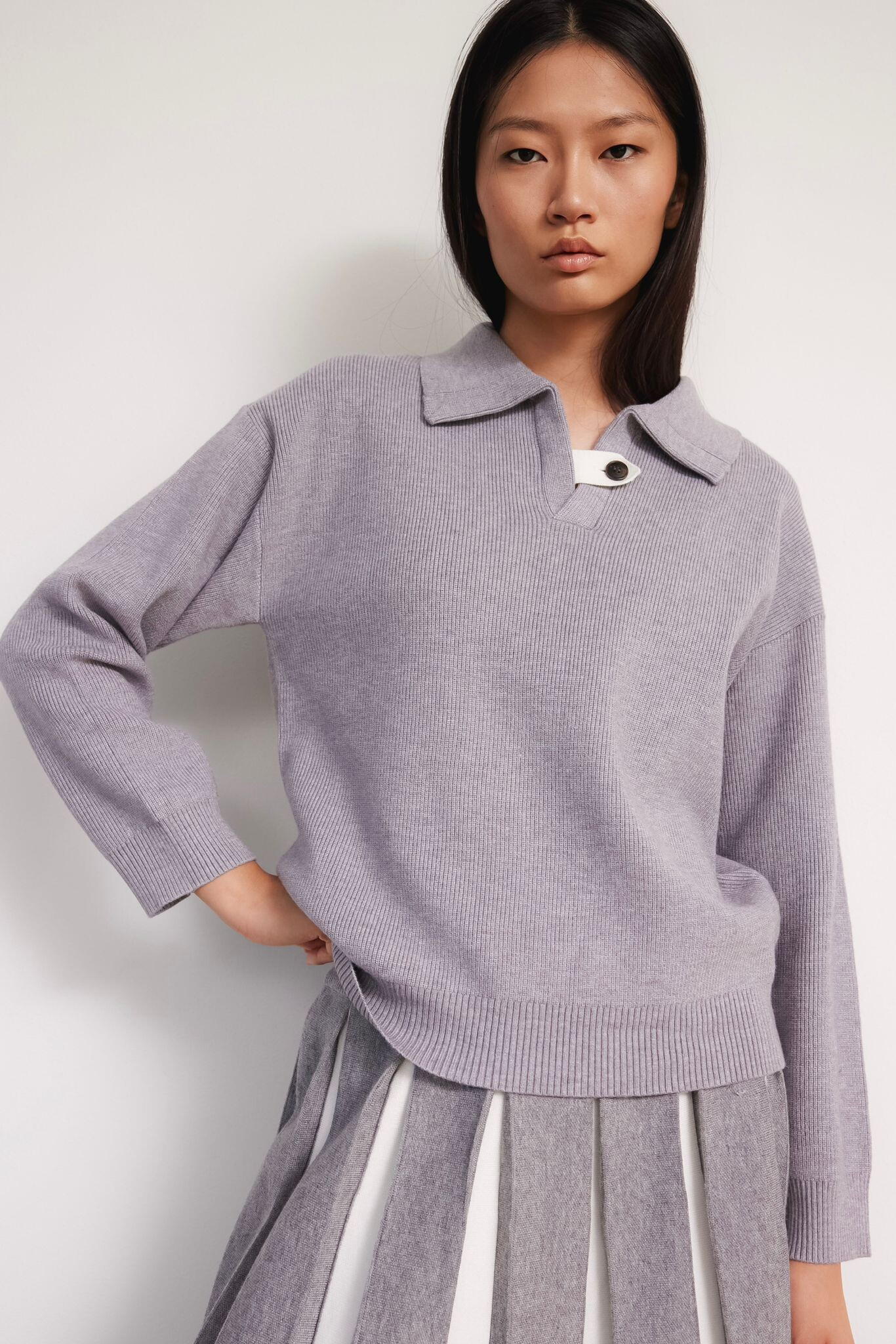 Módní svetřík s límečkem z hrubšího žebrovaného úpletu.