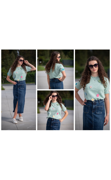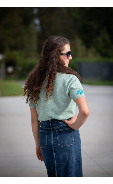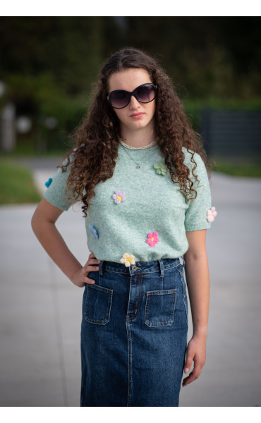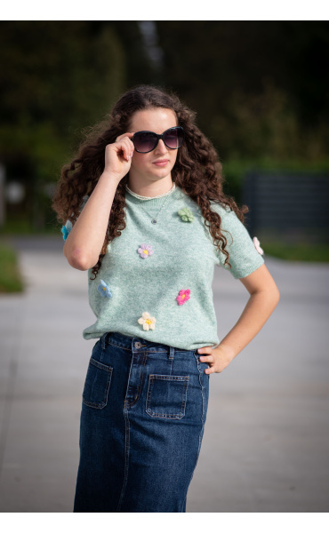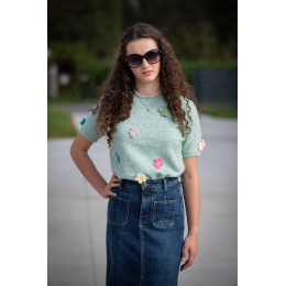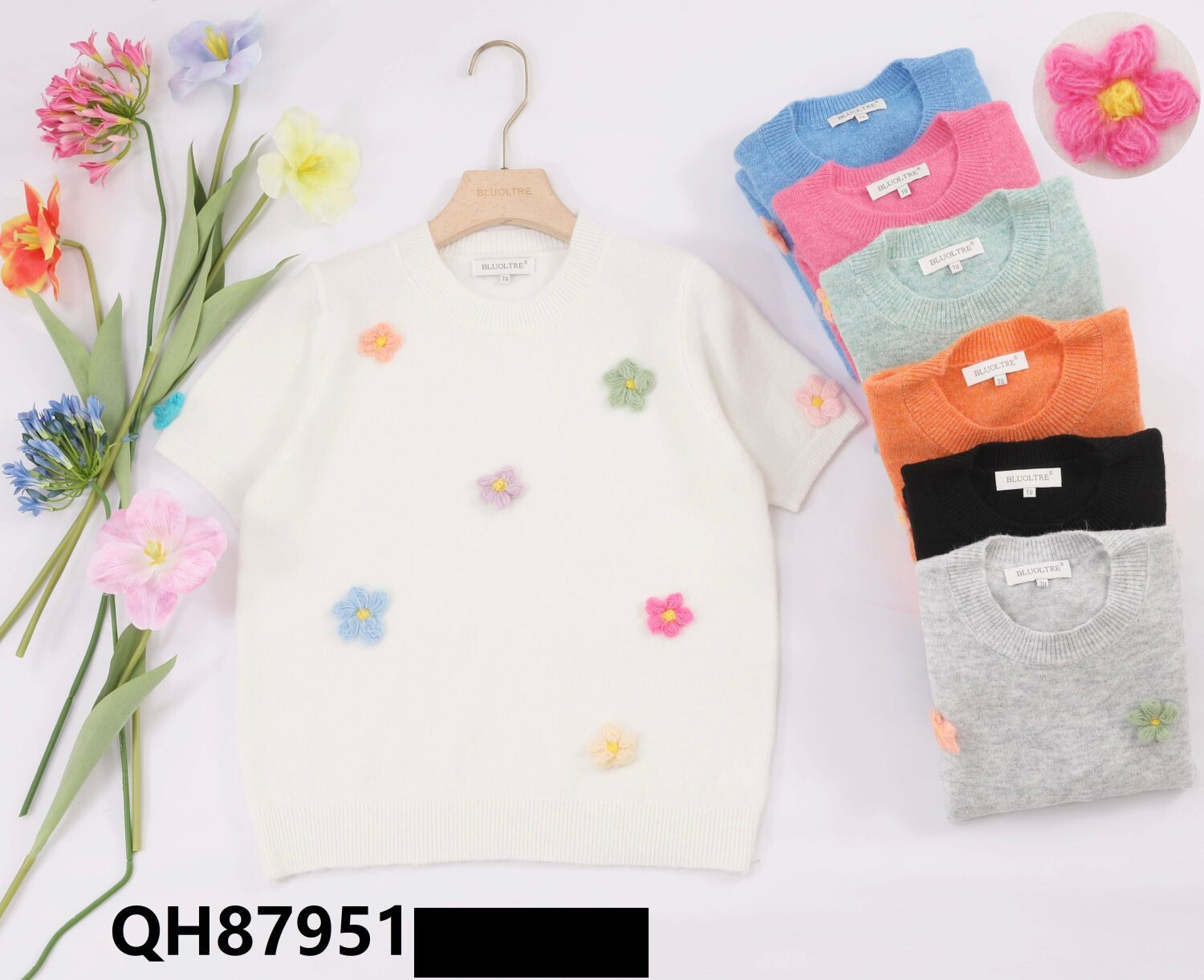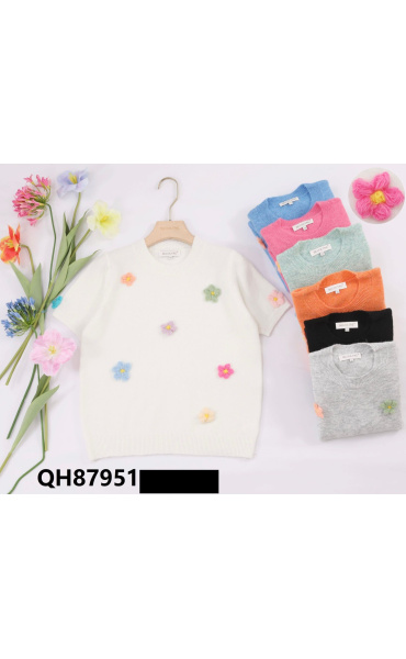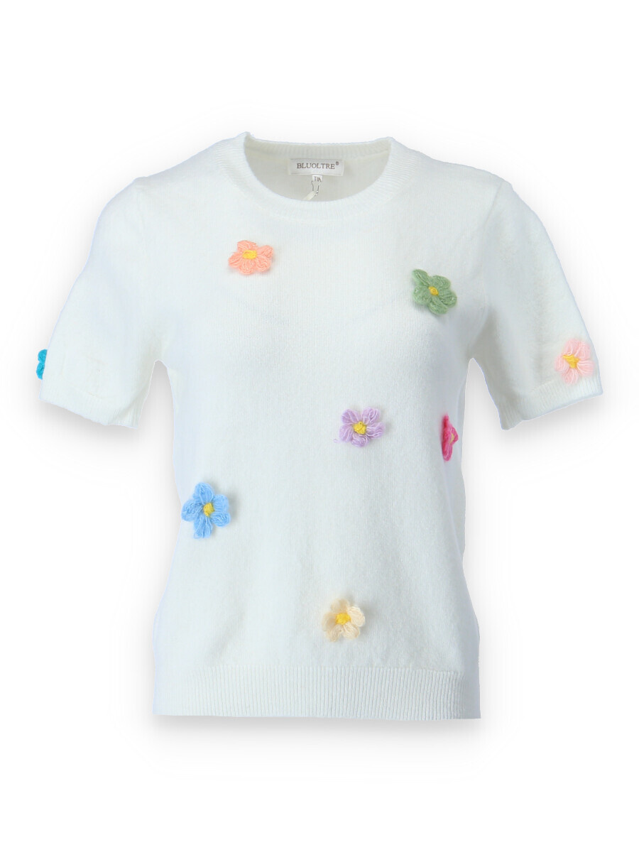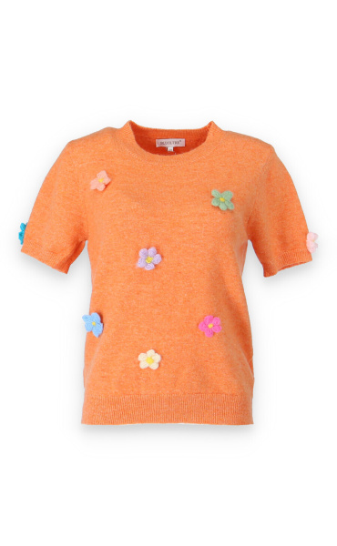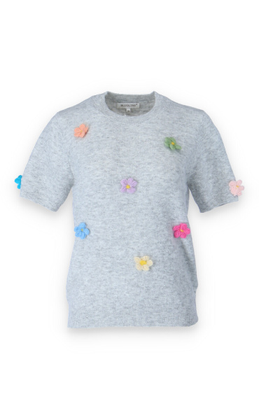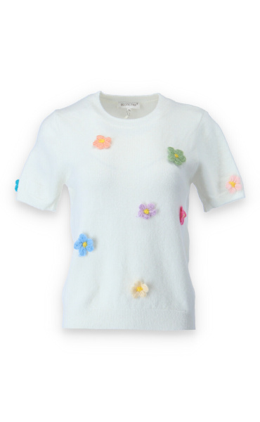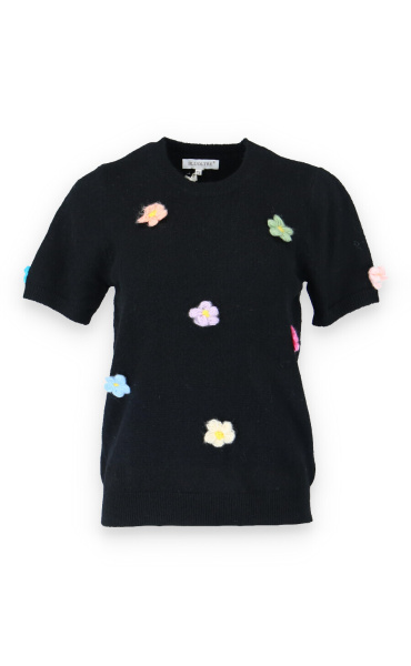 Svetřík s kr. rukávem, kulatý výstřih, doplněn aplikací květin. Dovoz Itálie.