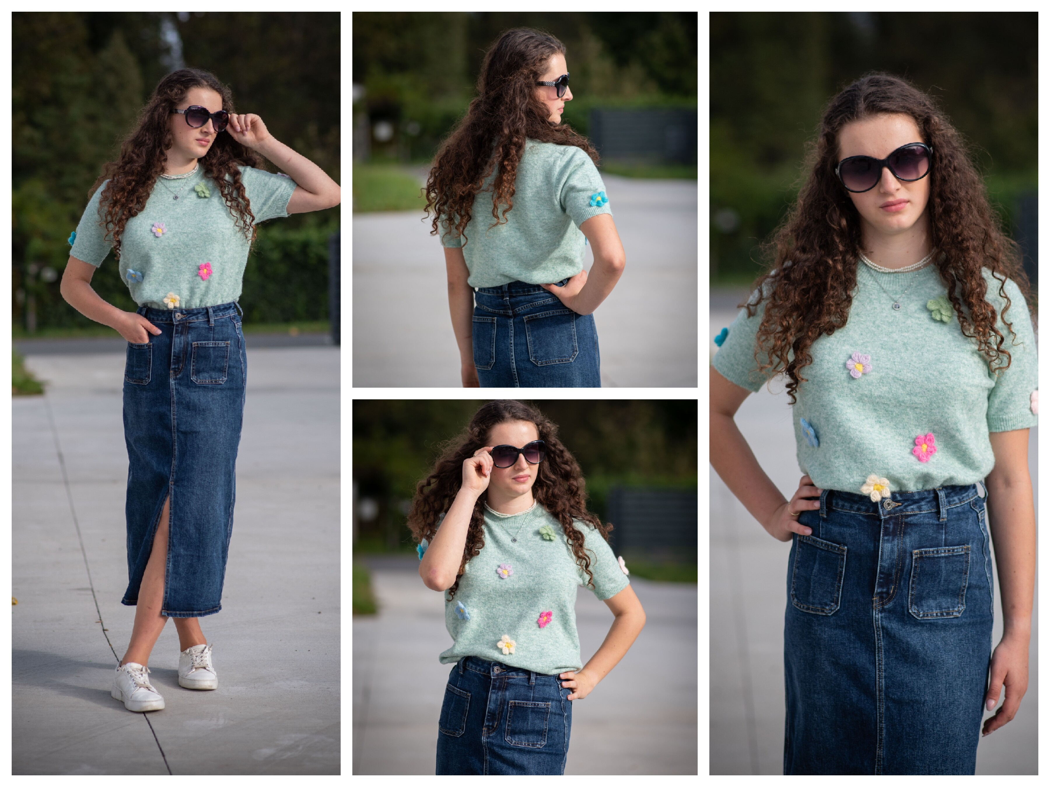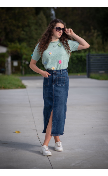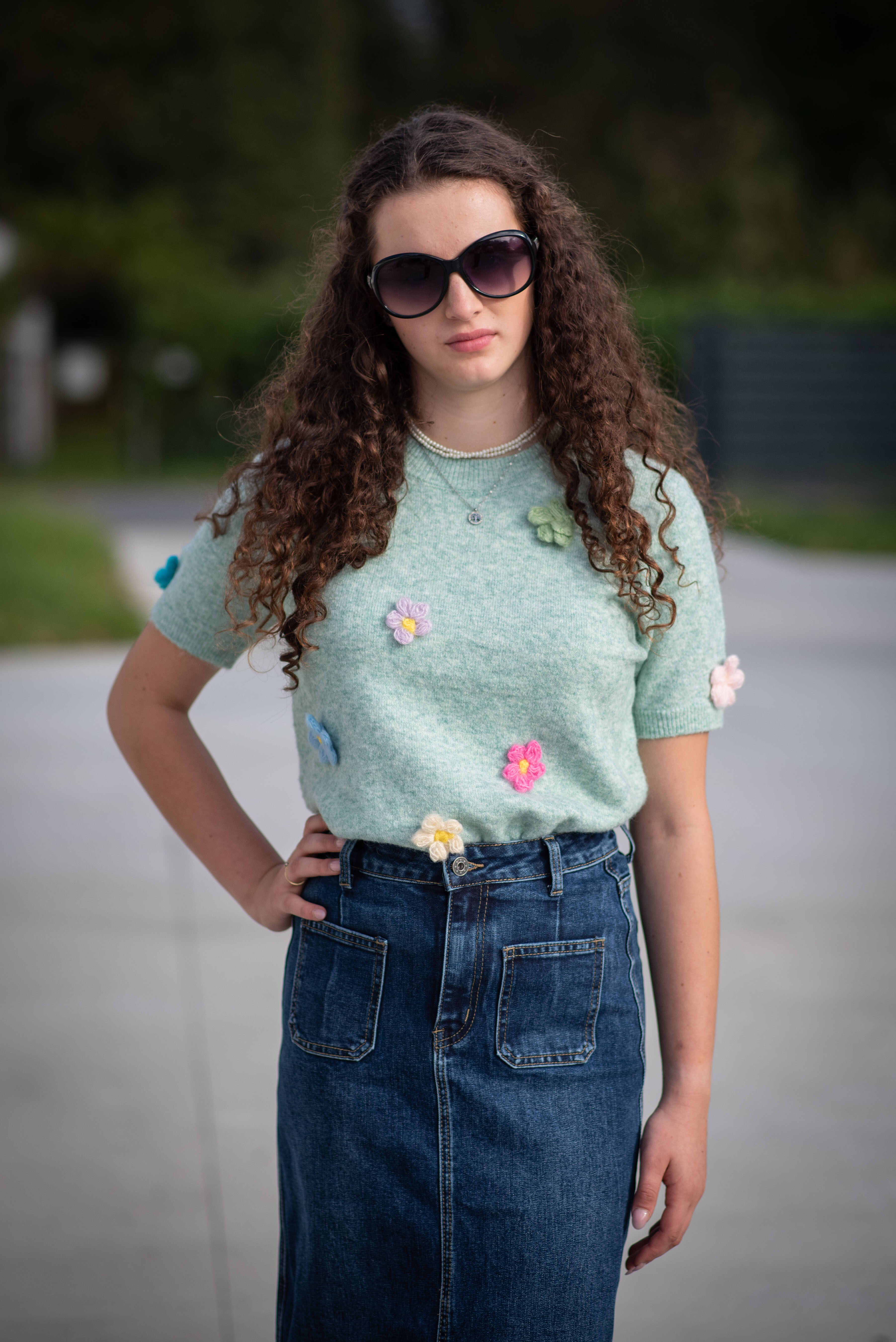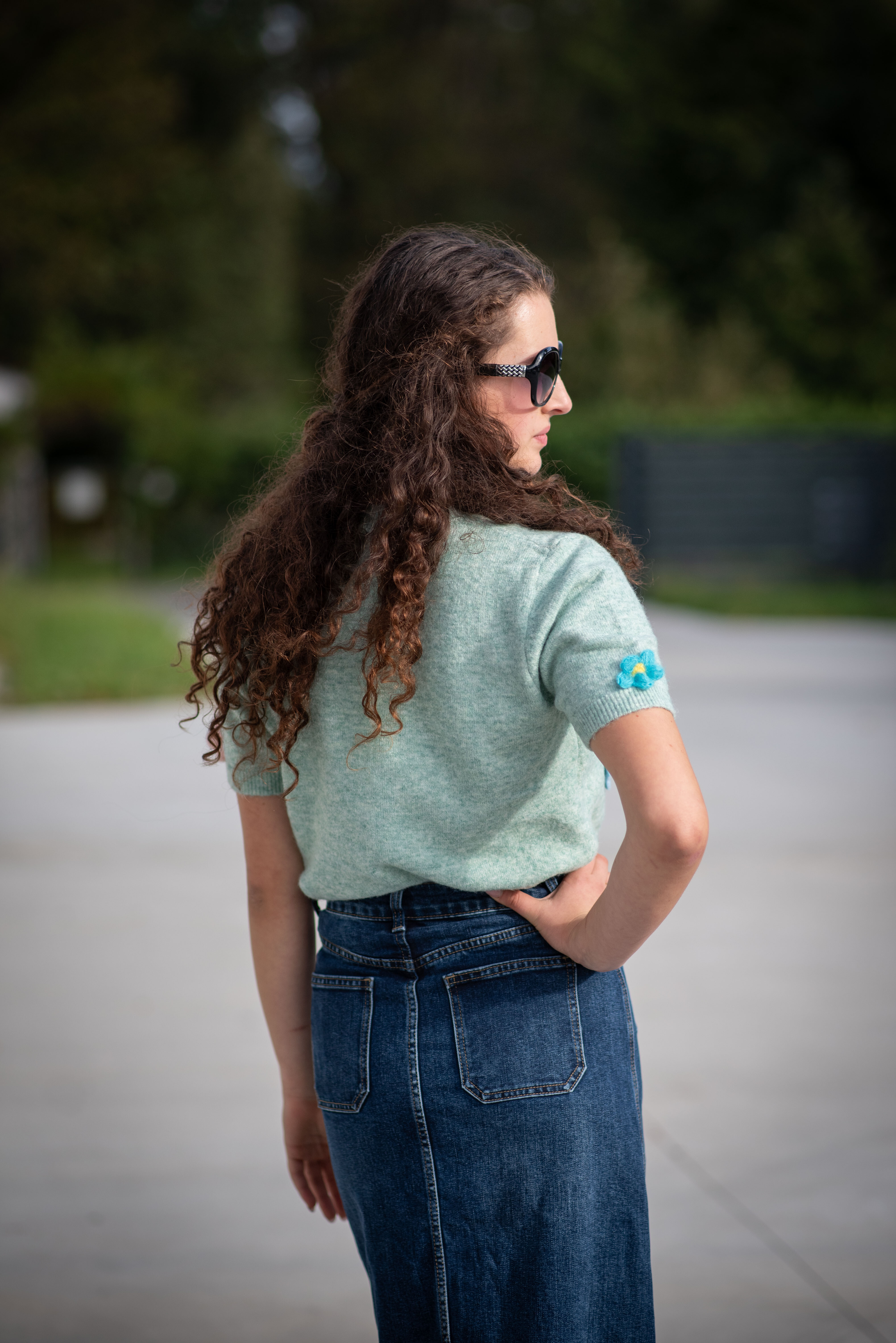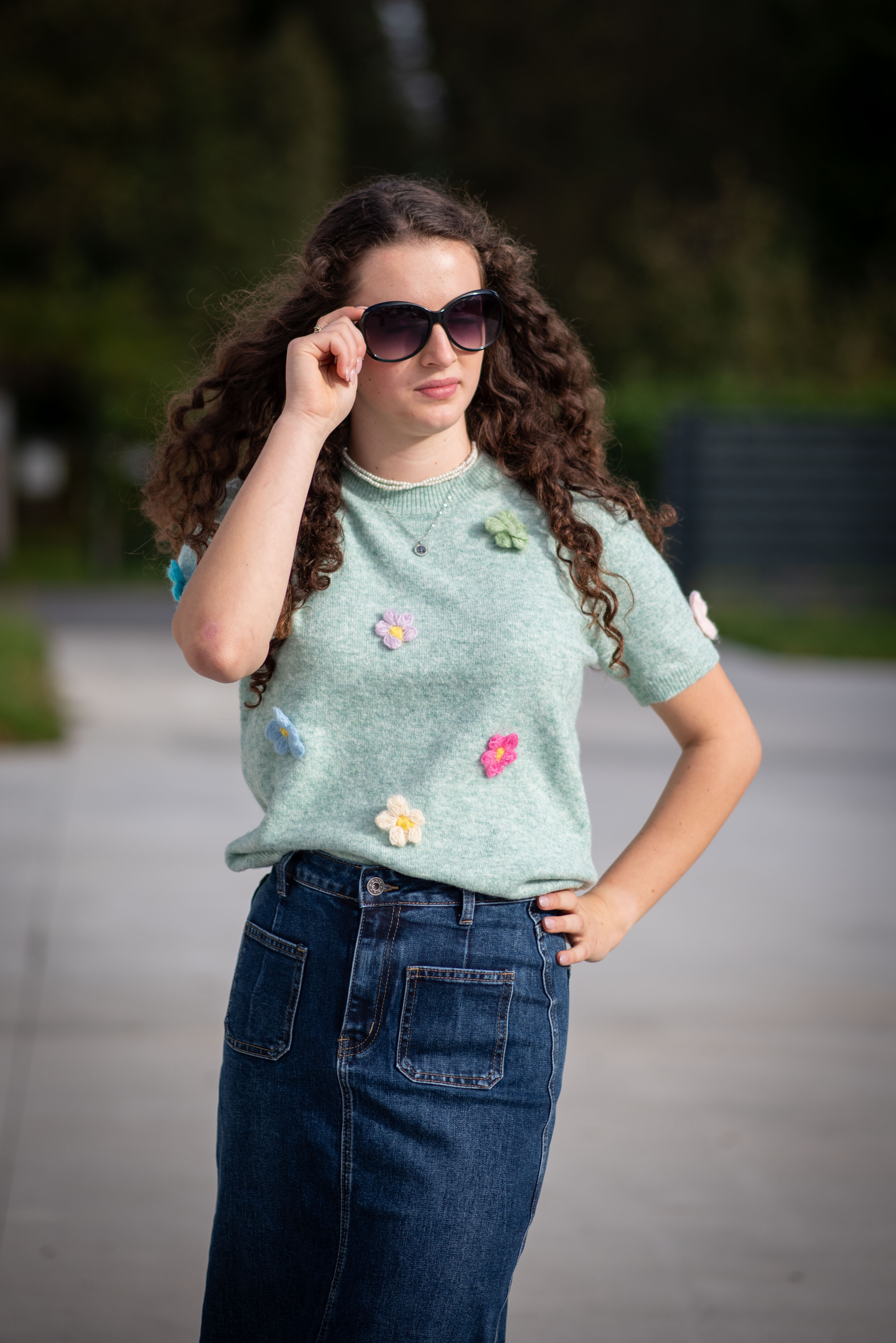 Svetřík s kr. rukávem, kulatý výstřih, doplněn aplikací květin. Dovoz Itálie.