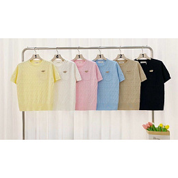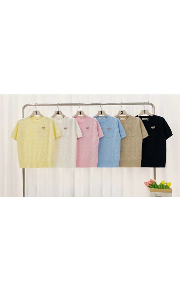 Dámský svetřík s kapsou a aplikací vyšívaného pejska v kapse. Svetřík má kulatý výstřih a krátký rukáv.
