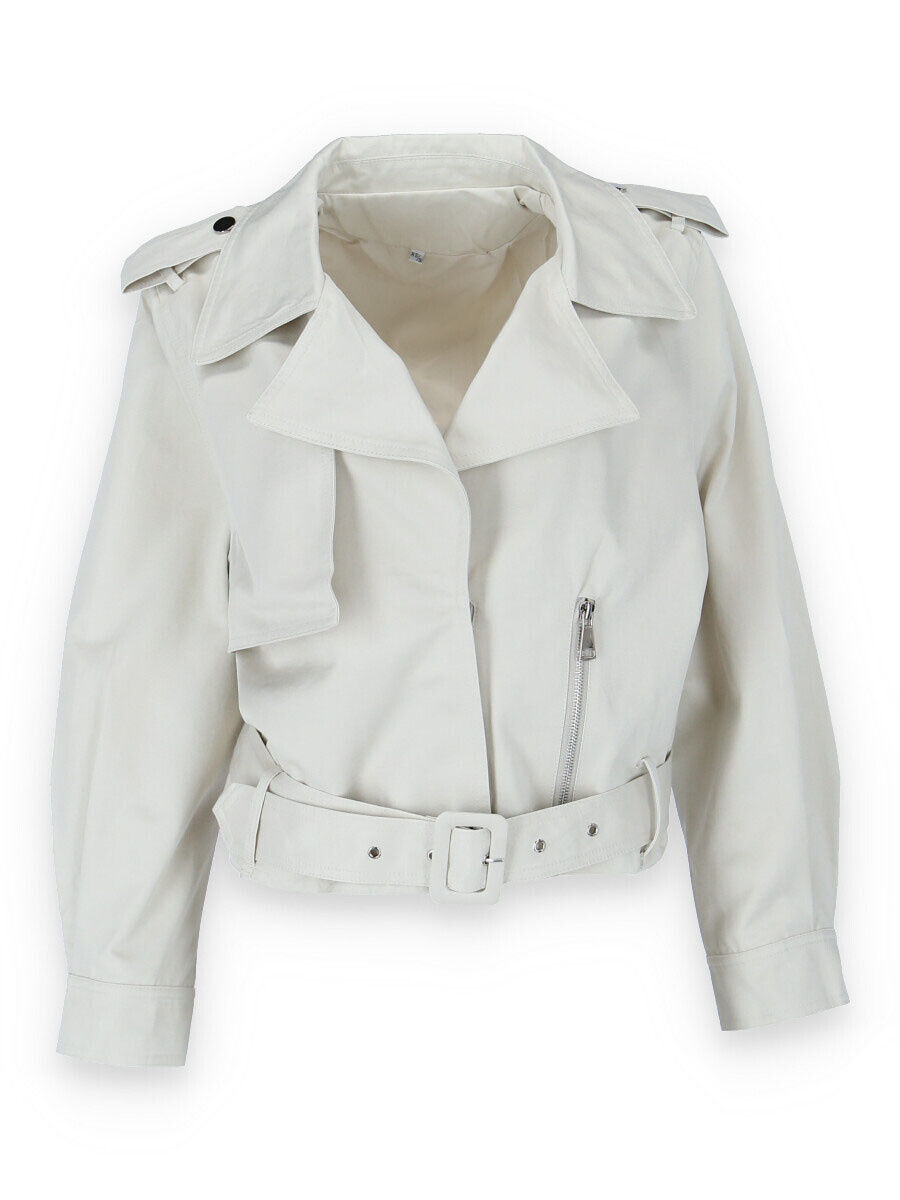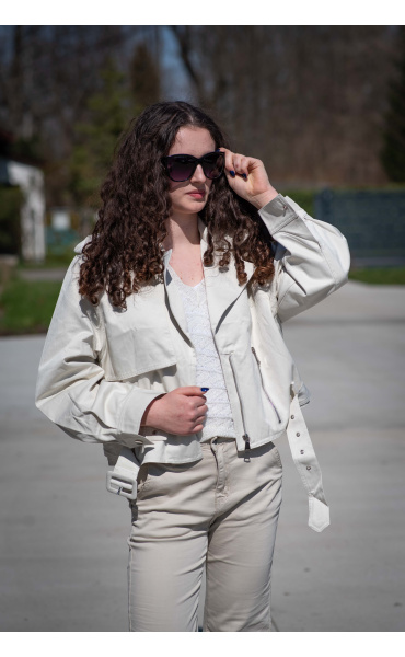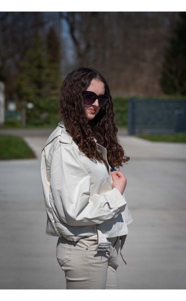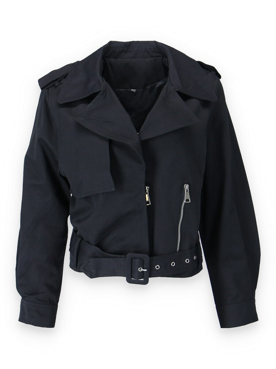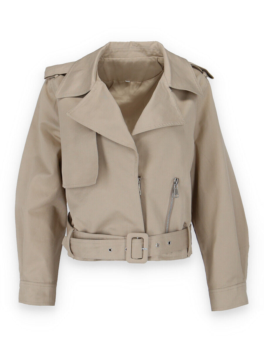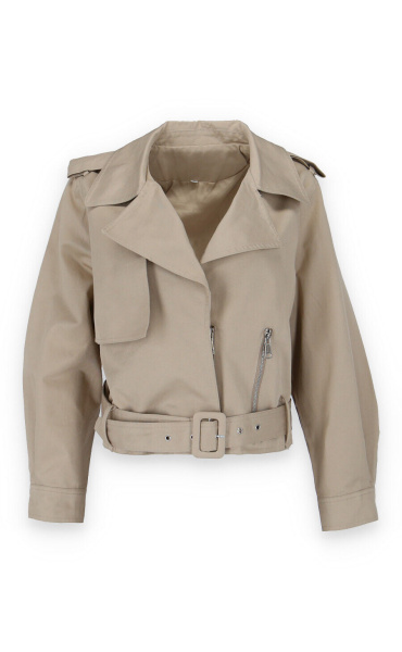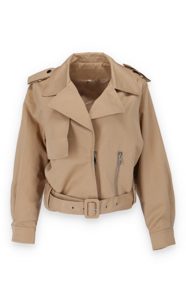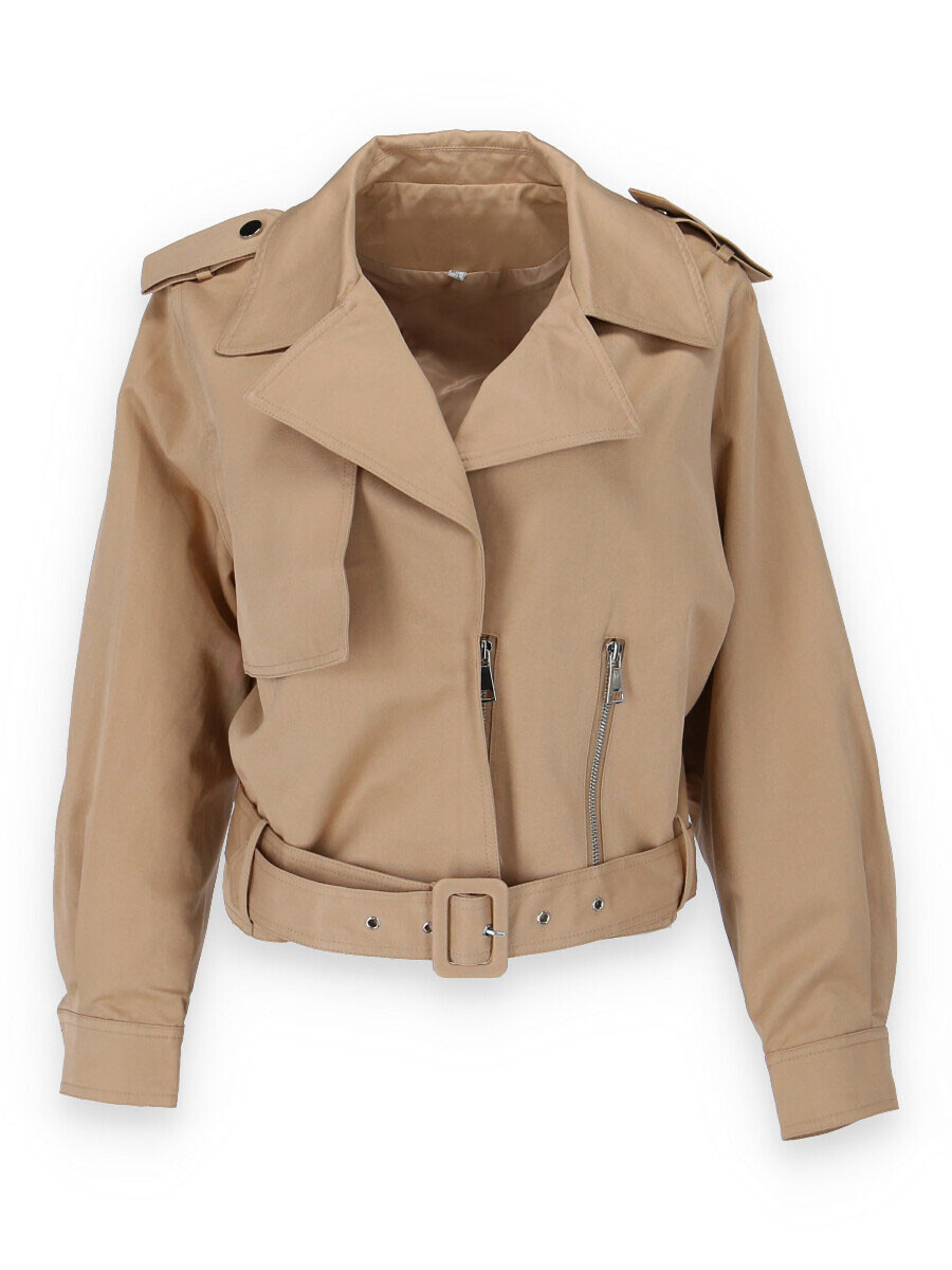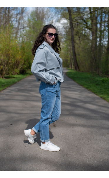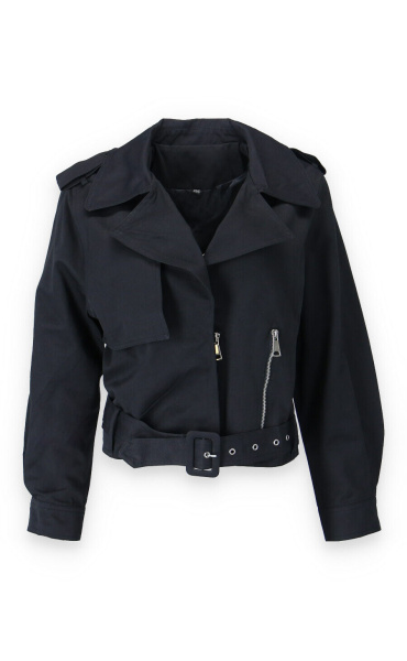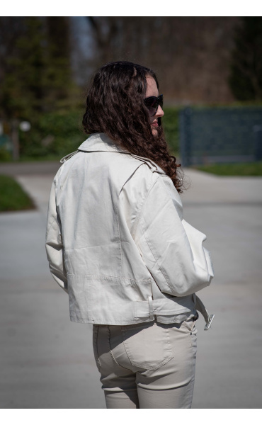 Stylový křivák oversize střihu. Na rukávech zapínání na cvoky, v pase je doplněn pásek a na přední straně našitá falešná kapsa.