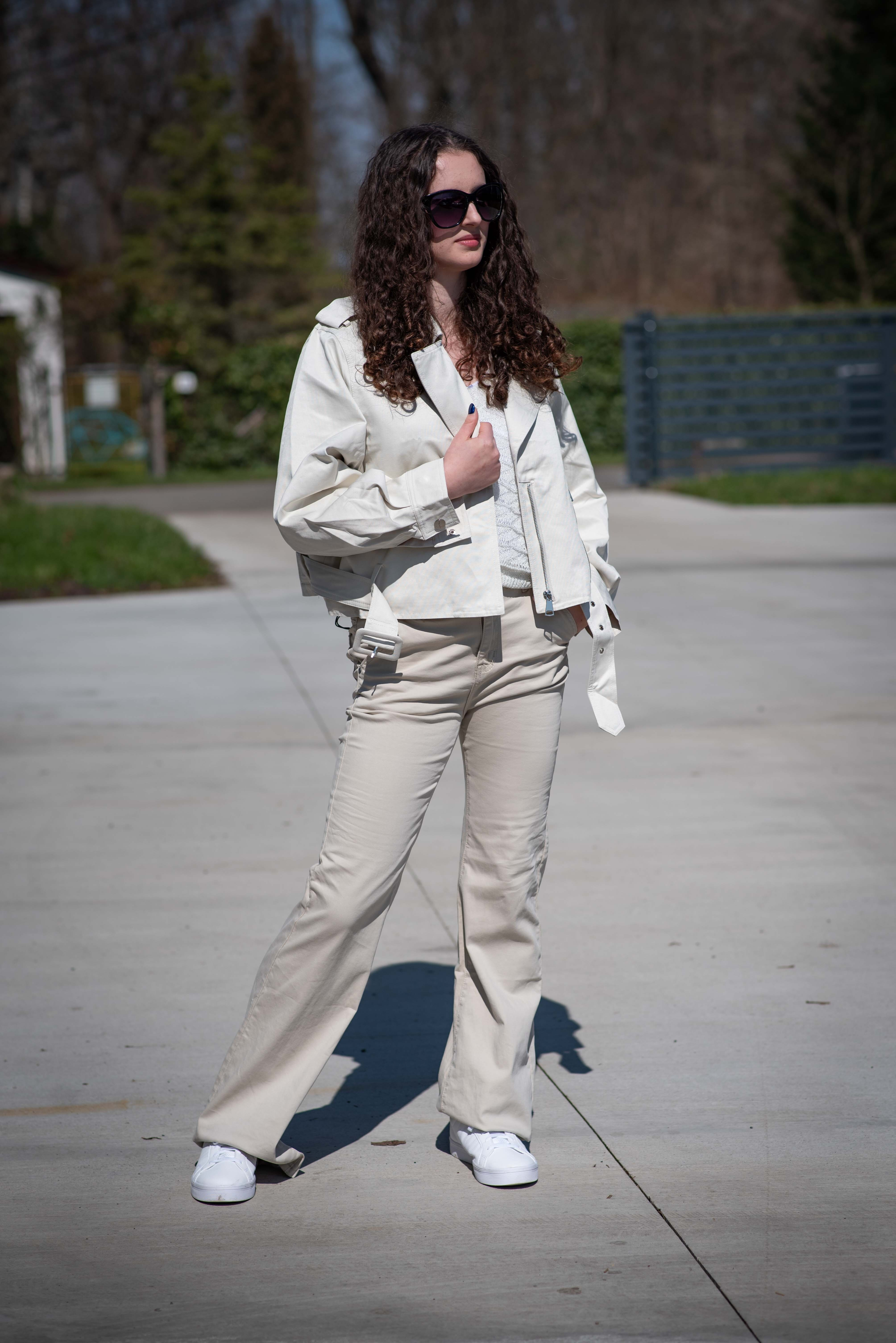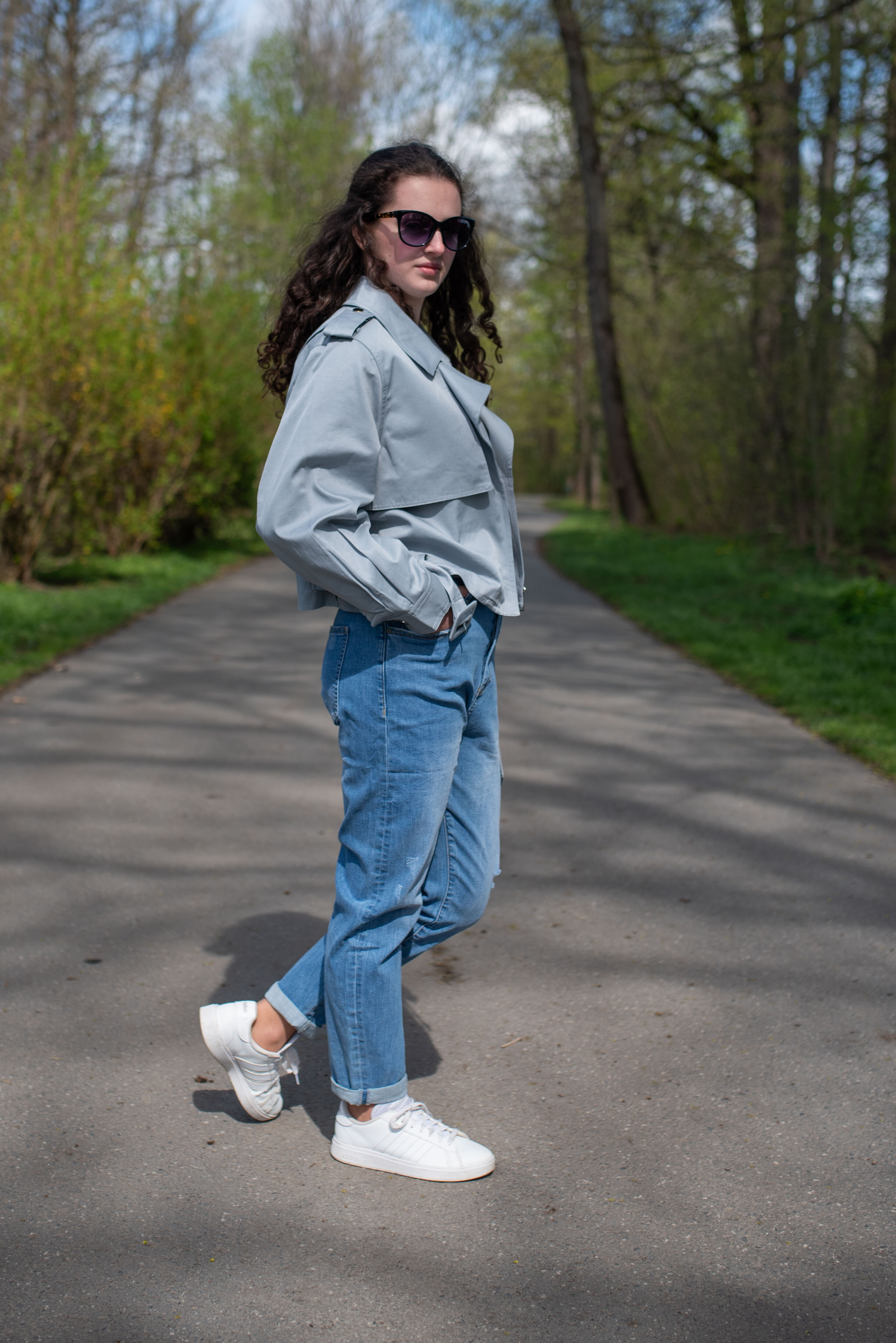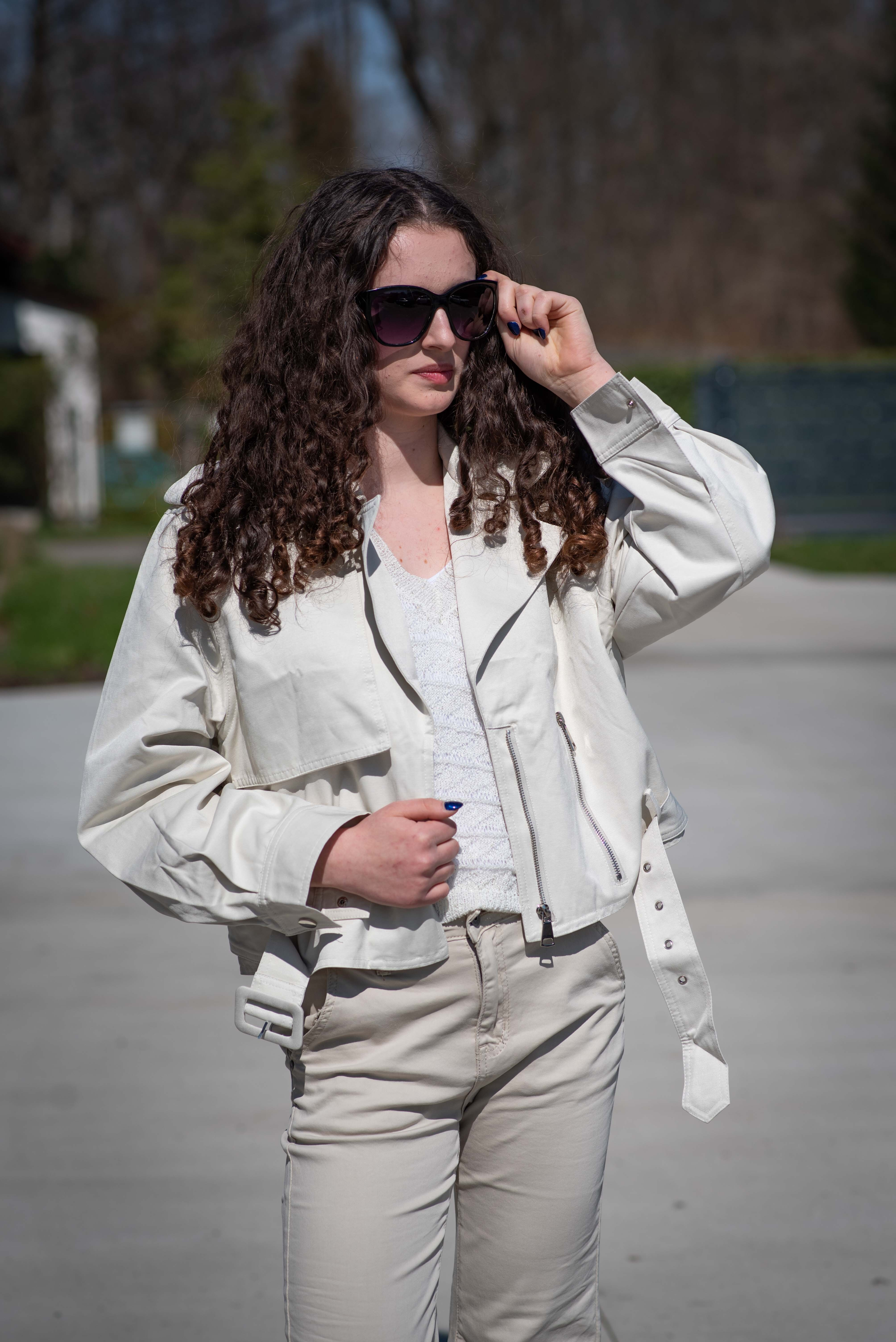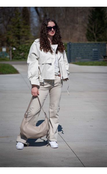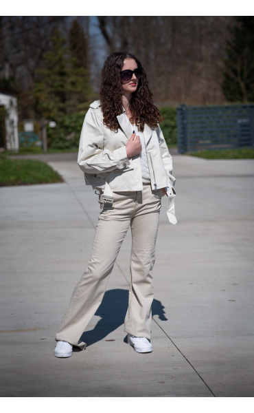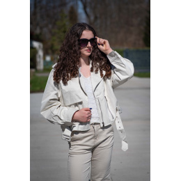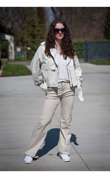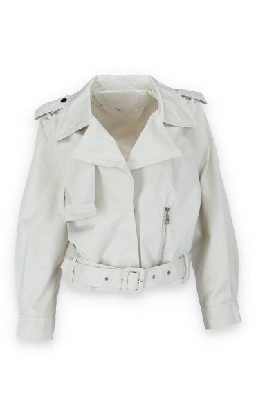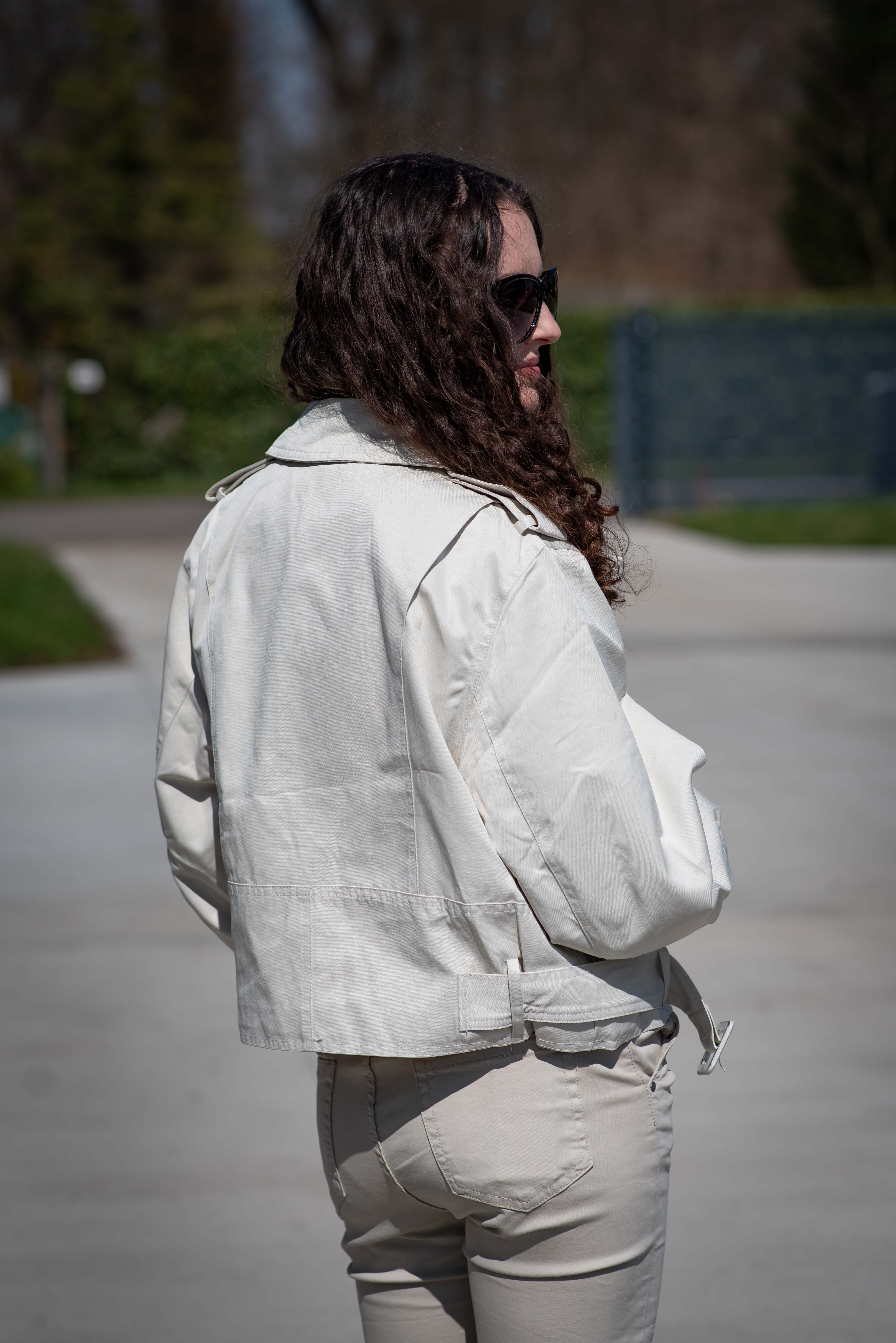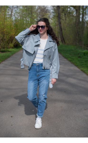 Stylový křivák oversize střihu. Na rukávech zapínání na cvoky, v pase je doplněn pásek a na přední straně našitá falešná kapsa.