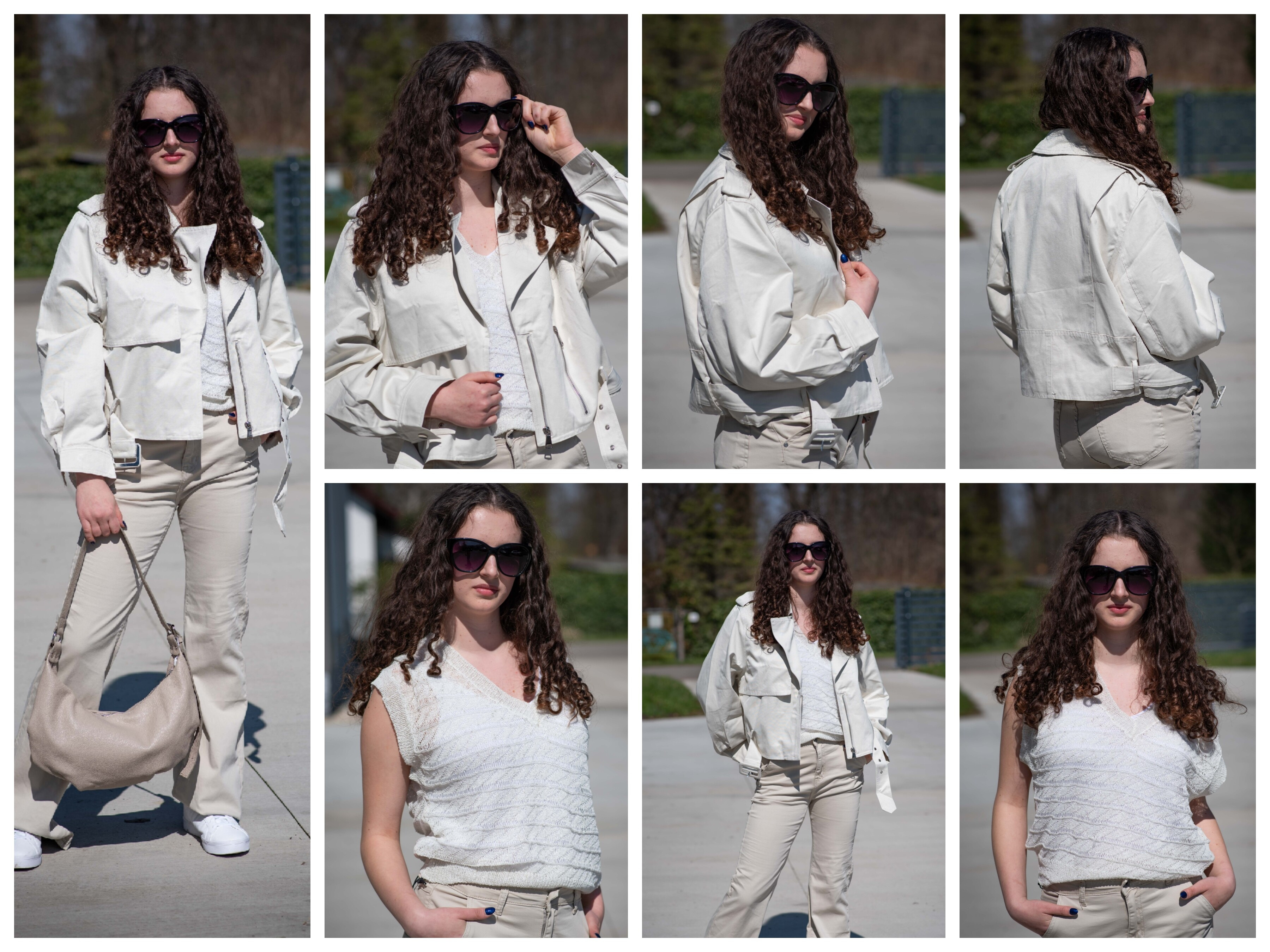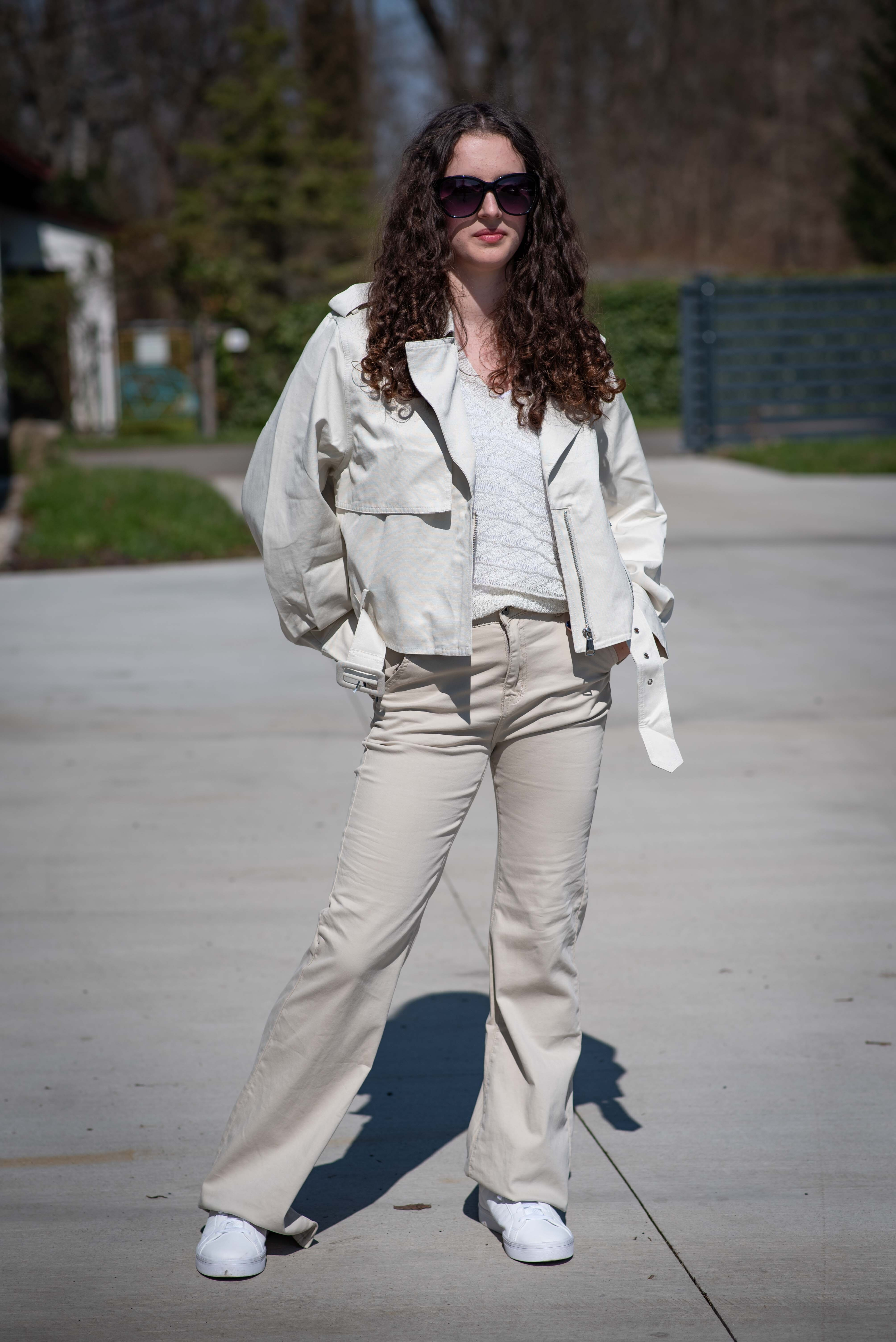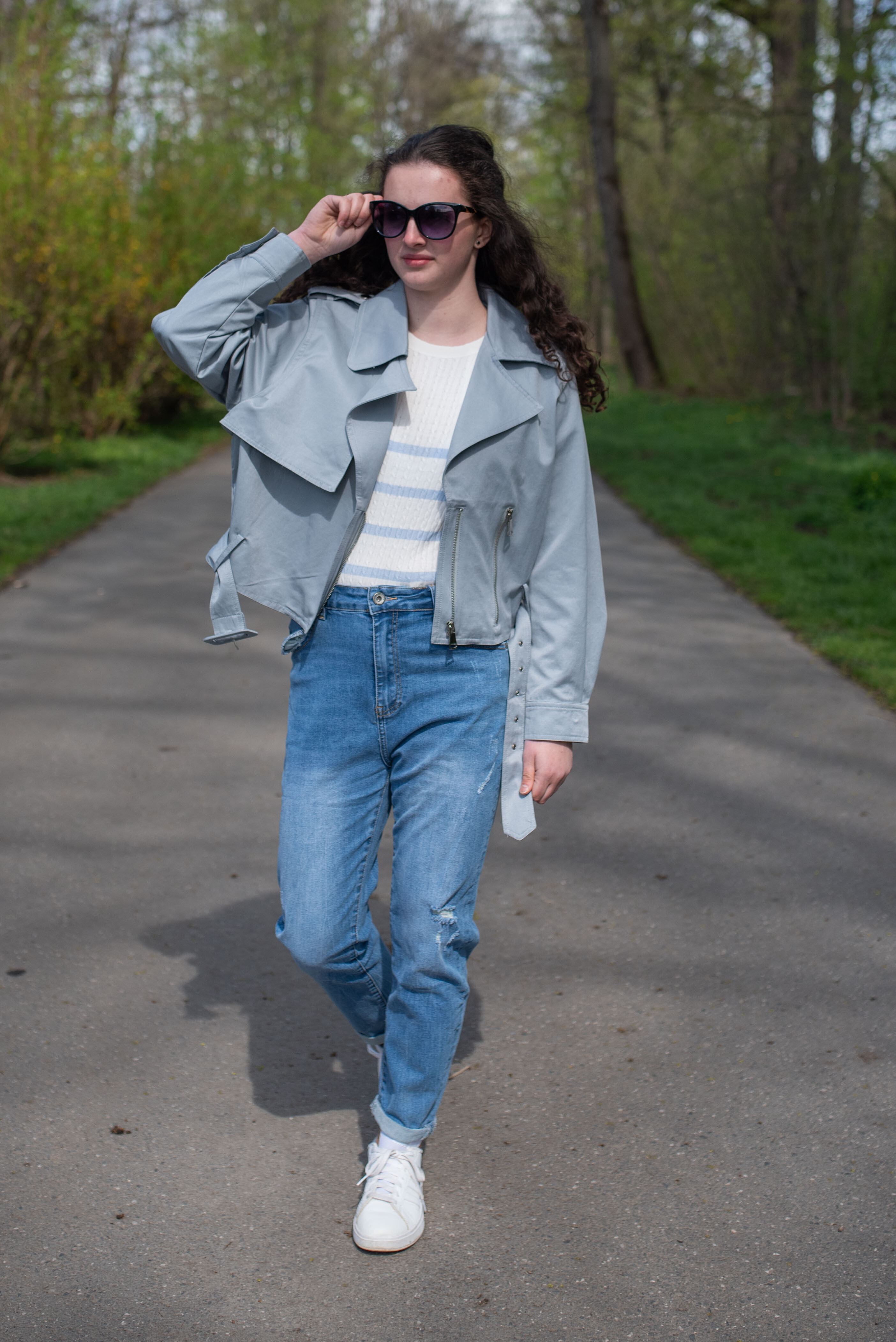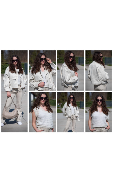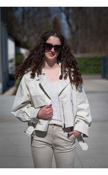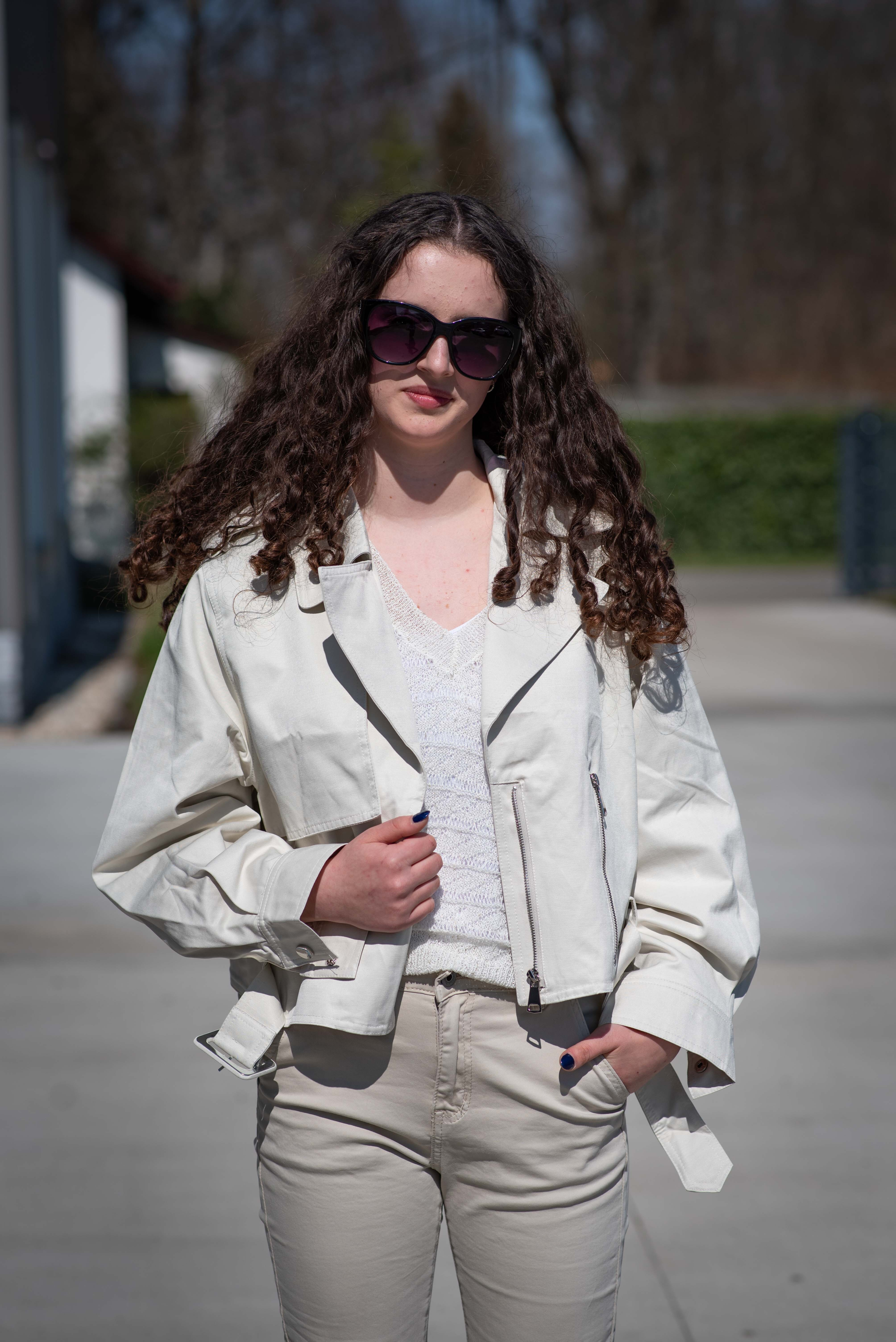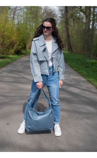 Stylový křivák oversize střihu. Na rukávech zapínání na cvoky, v pase je doplněn pásek a na přední straně našitá falešná kapsa.