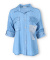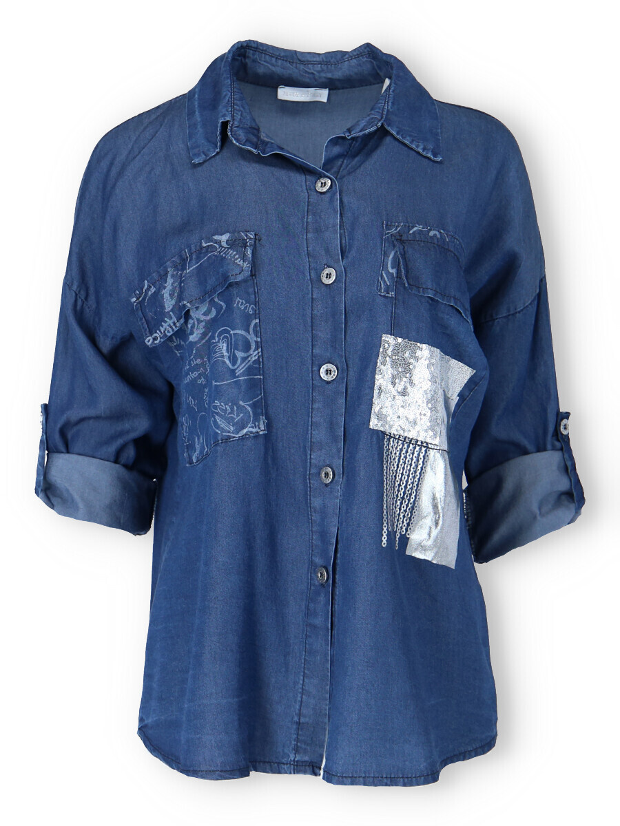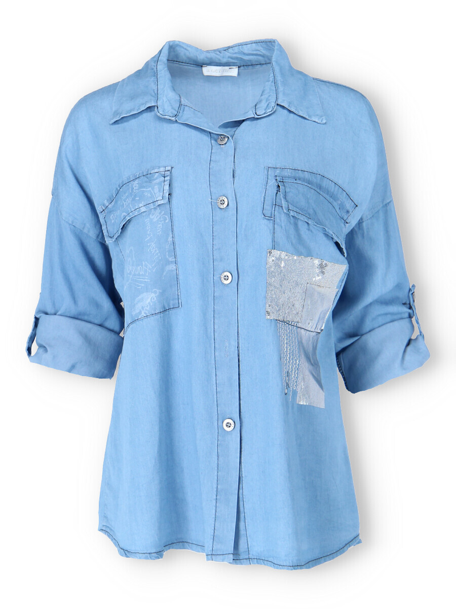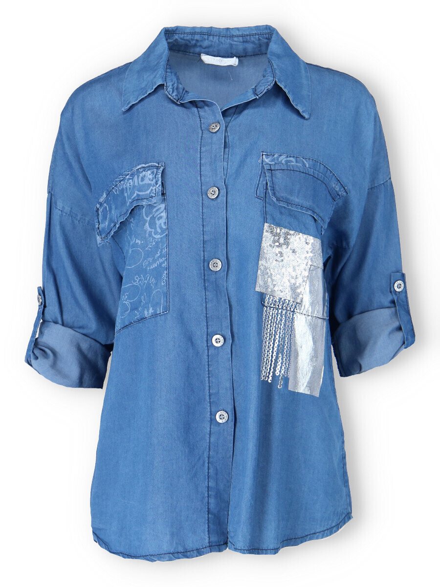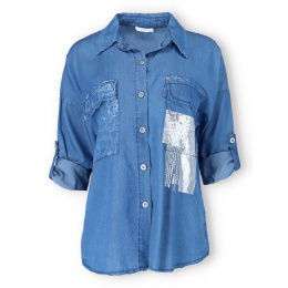 Trendy džínová propínací košile z odlehčené džínoviny. Košile má našité kapsy s klopami, regulaci na rukávu na knoflík a má prodlouženou zadní délku.