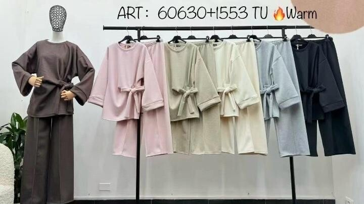 Trendy kalhotový komplet VOGUE, který se skládá z mikiny s vázáním na boku a teplákových kalhot se širokými nohavicemi.
