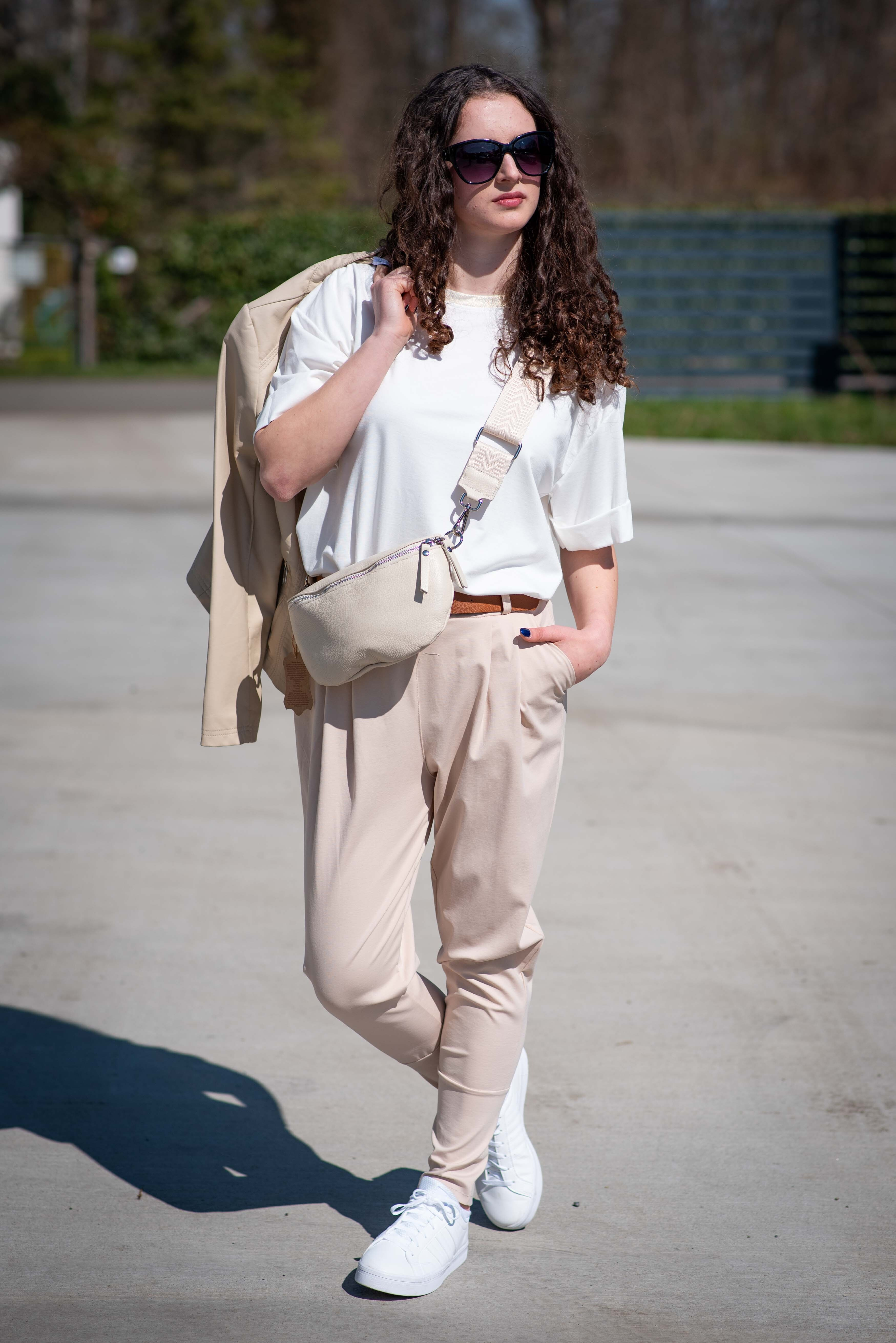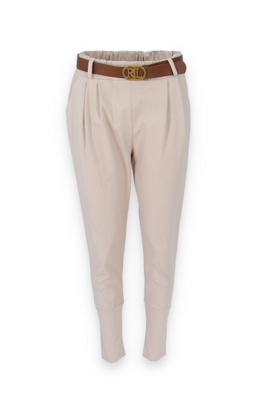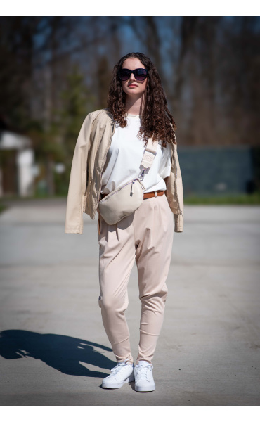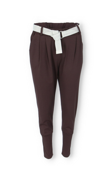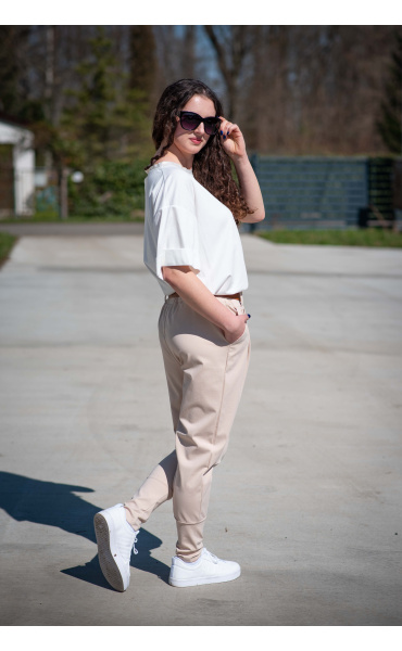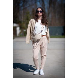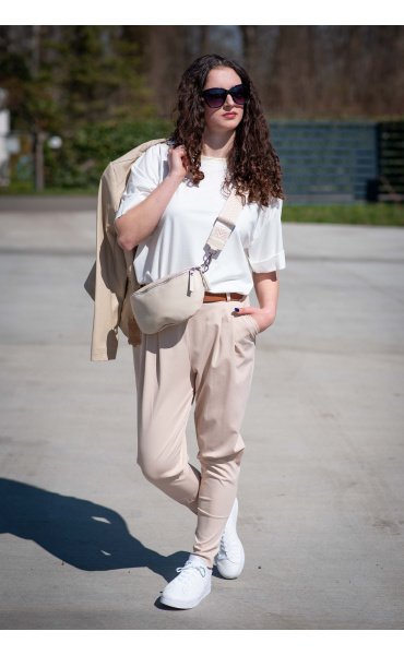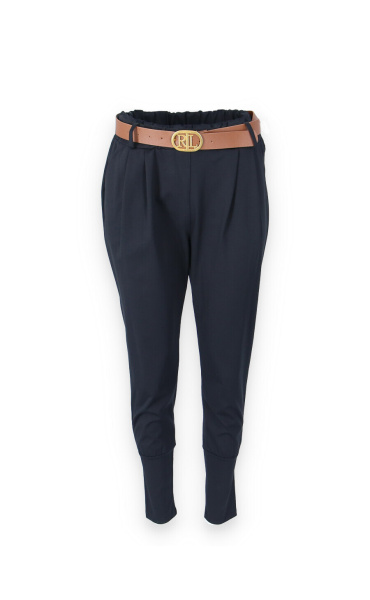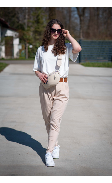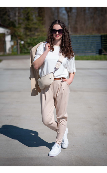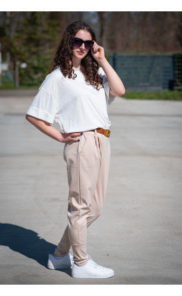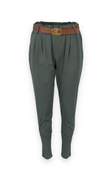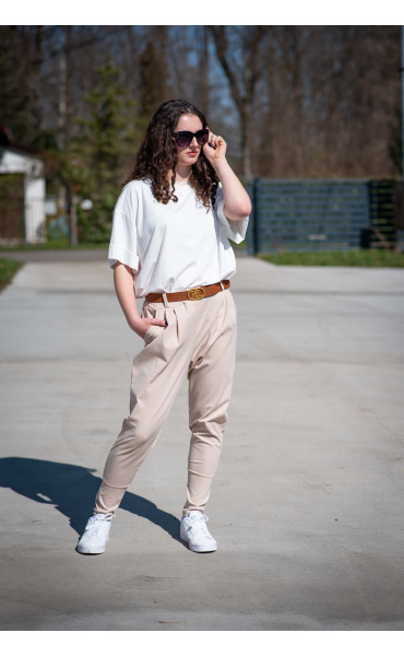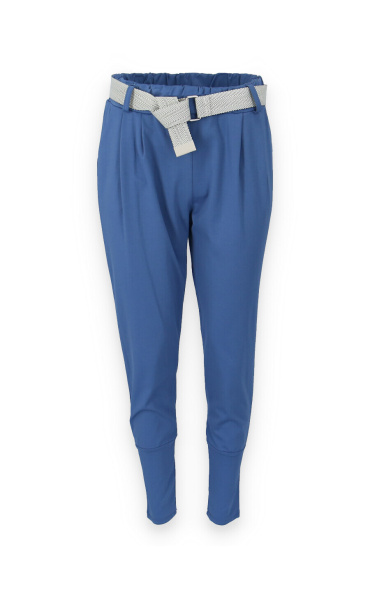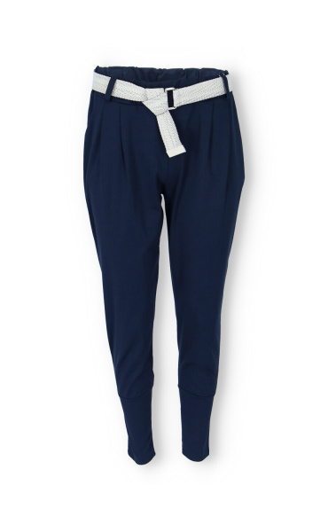Dámské trendy kalhoty do gumy, doplněny módním páskem. Kalhoty mají ve spodní části zúženou nohavici a všité kapsy.