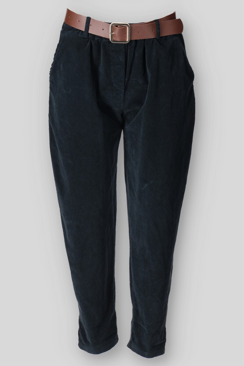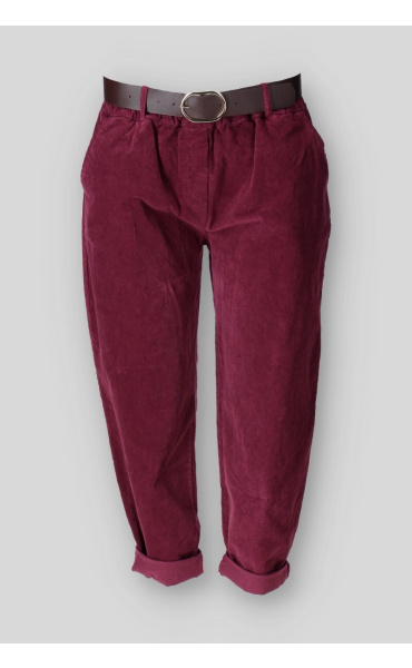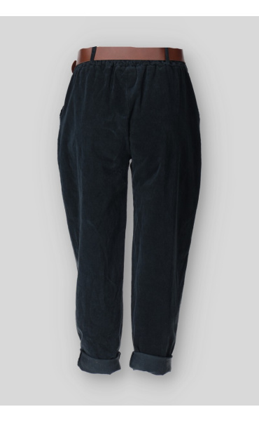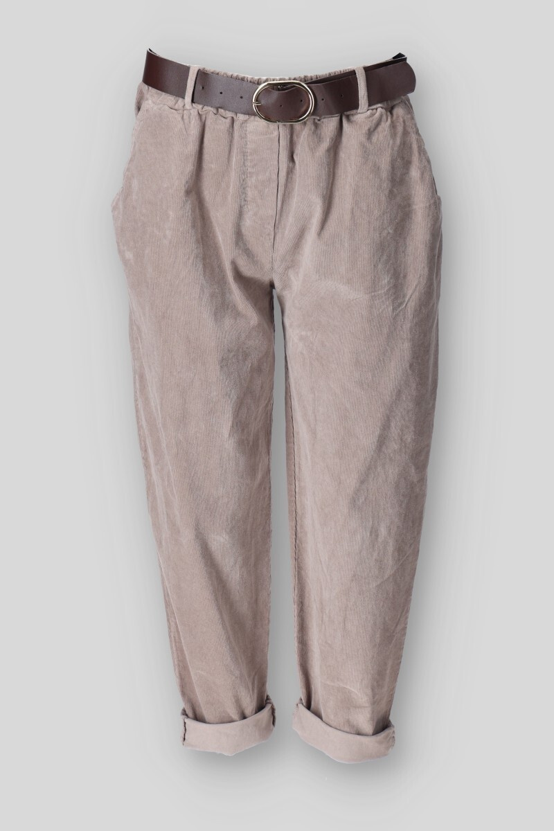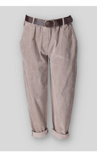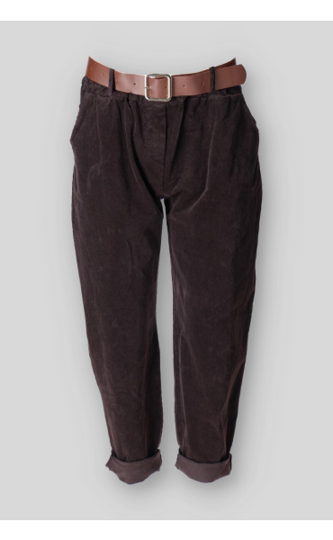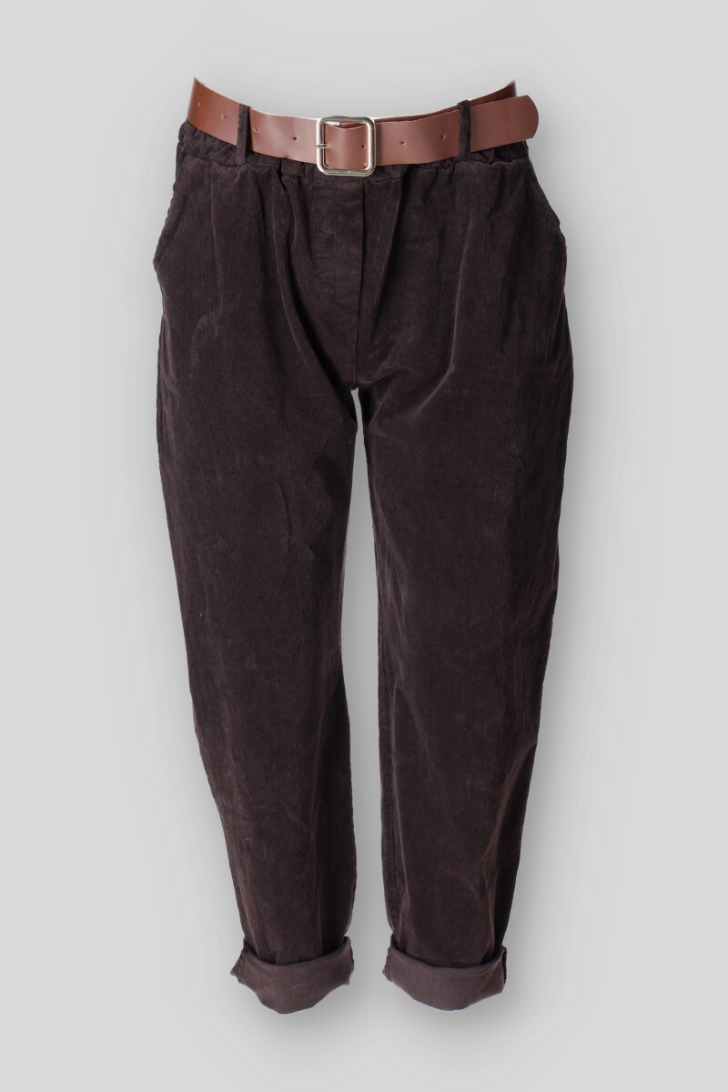 Dámské kalhoty do gumy, doplněny páskem. Kalhoty jsou volnějšího střihu, manšestrového materiálu a  mají všité kapsy. Vyrobeno v Itálii.