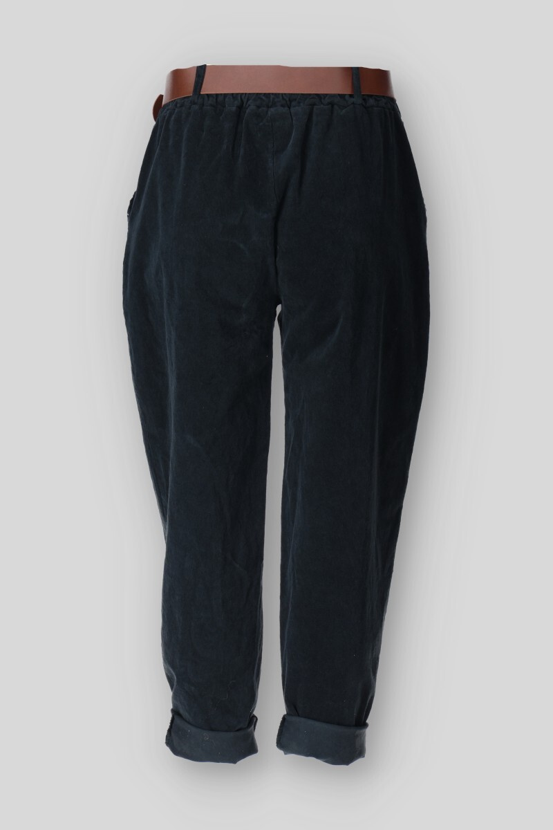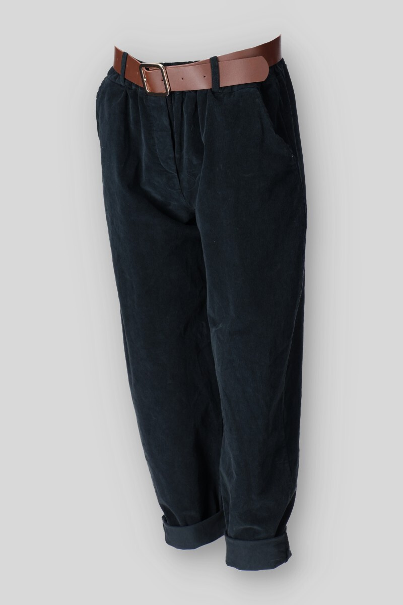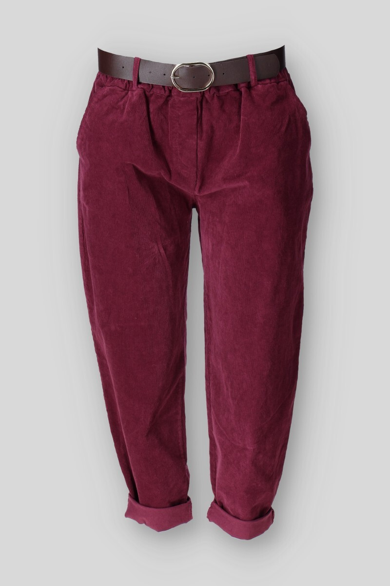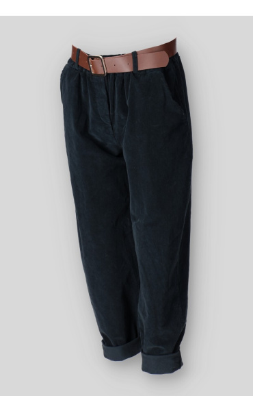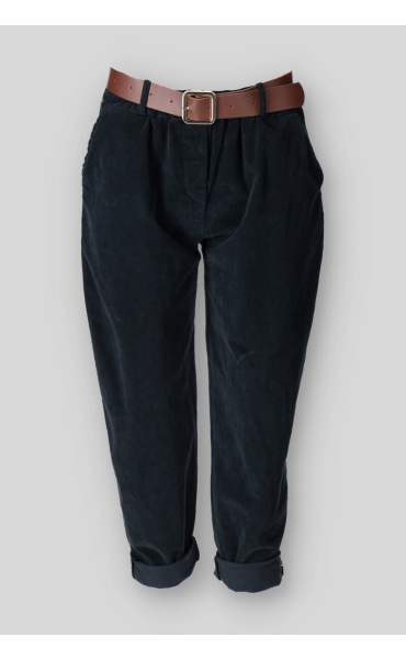 Dámské kalhoty do gumy, doplněny páskem. Kalhoty jsou volnějšího střihu, manšestrového materiálu a  mají všité kapsy. Vyrobeno v Itálii.