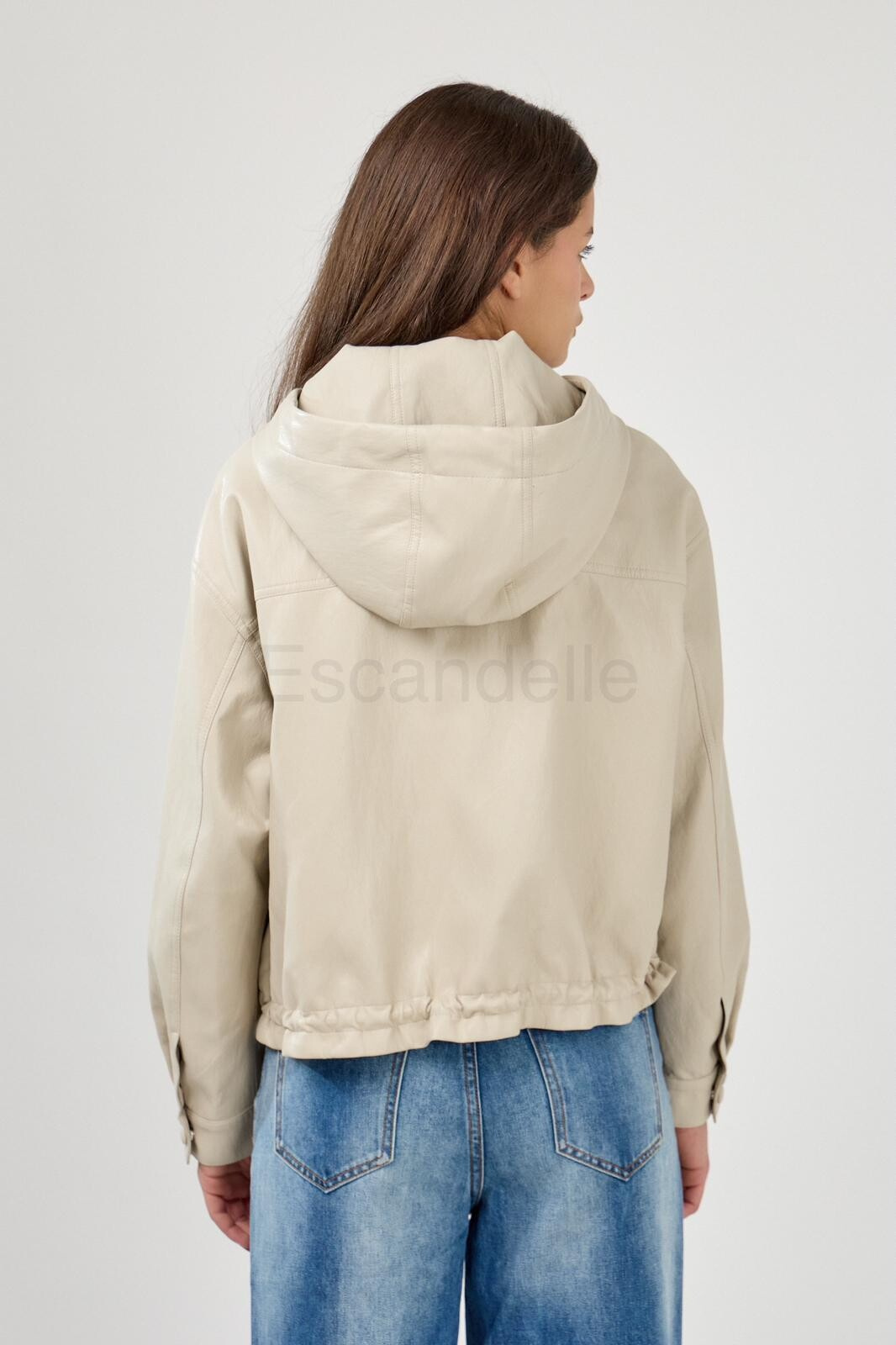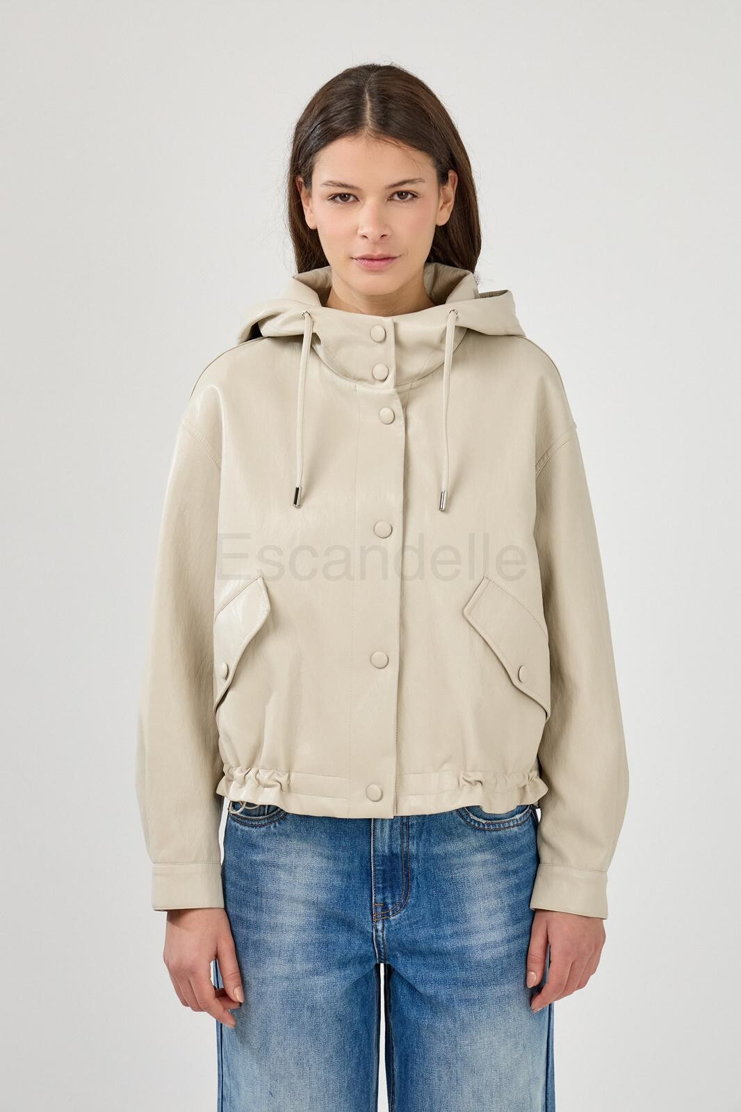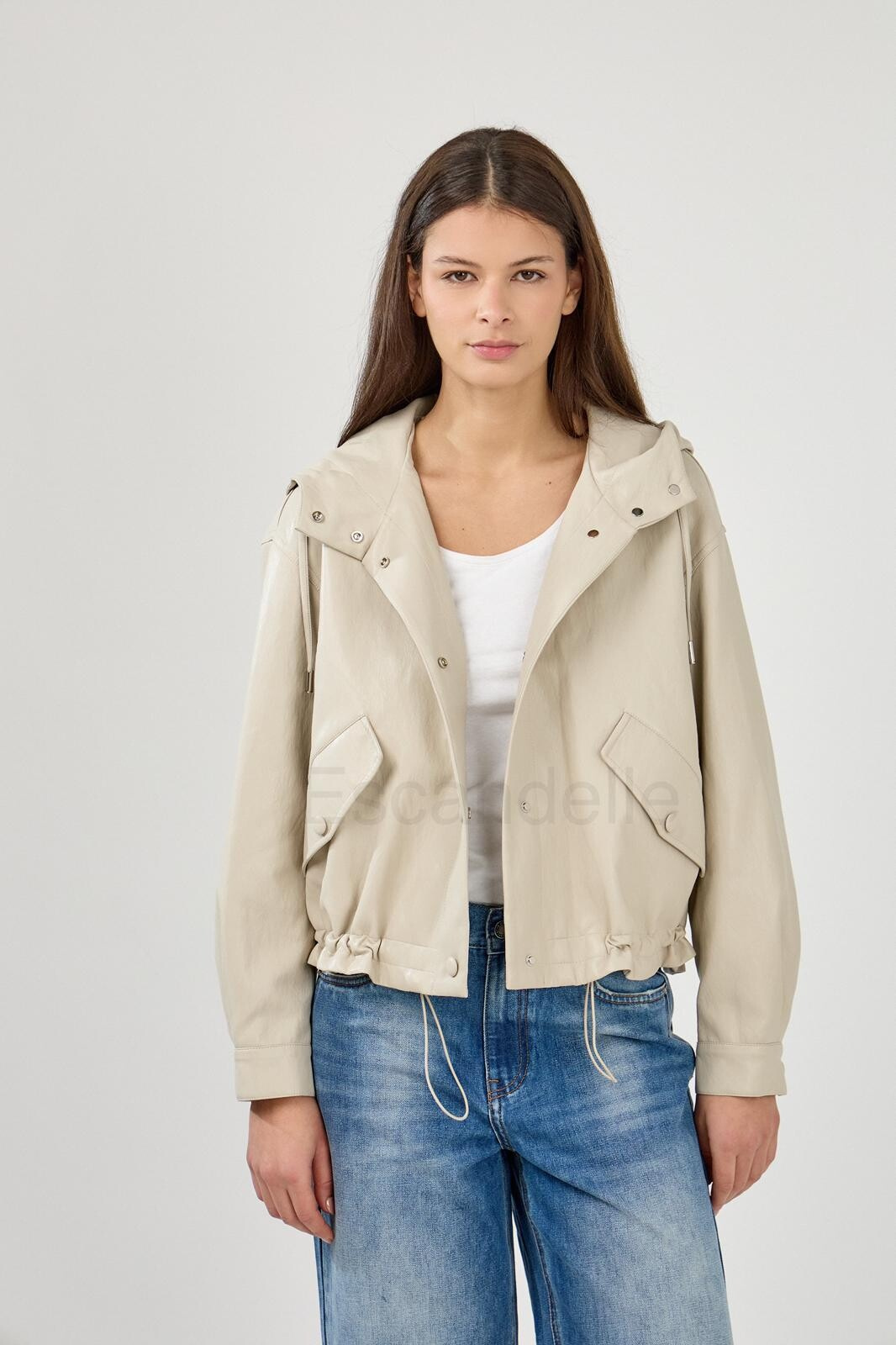 Trendy koženková bunda s kapucí. Bunda má zapínání na zip, po stranách našité kapsy s klopami a regulaci v pase na stažení. Módní kousek do Vašeho šatníku.