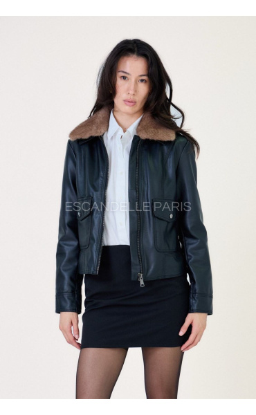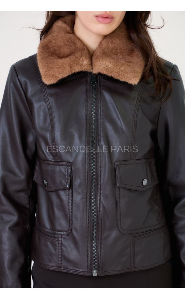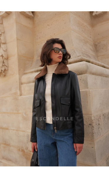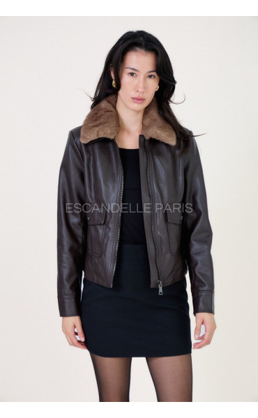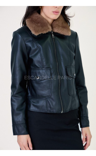 Koženková bunda s kožešinovým límcem, který je odnímatelný. Bunda má kapsy na přední straně, je kratšího střihu se zapínáním na zip.