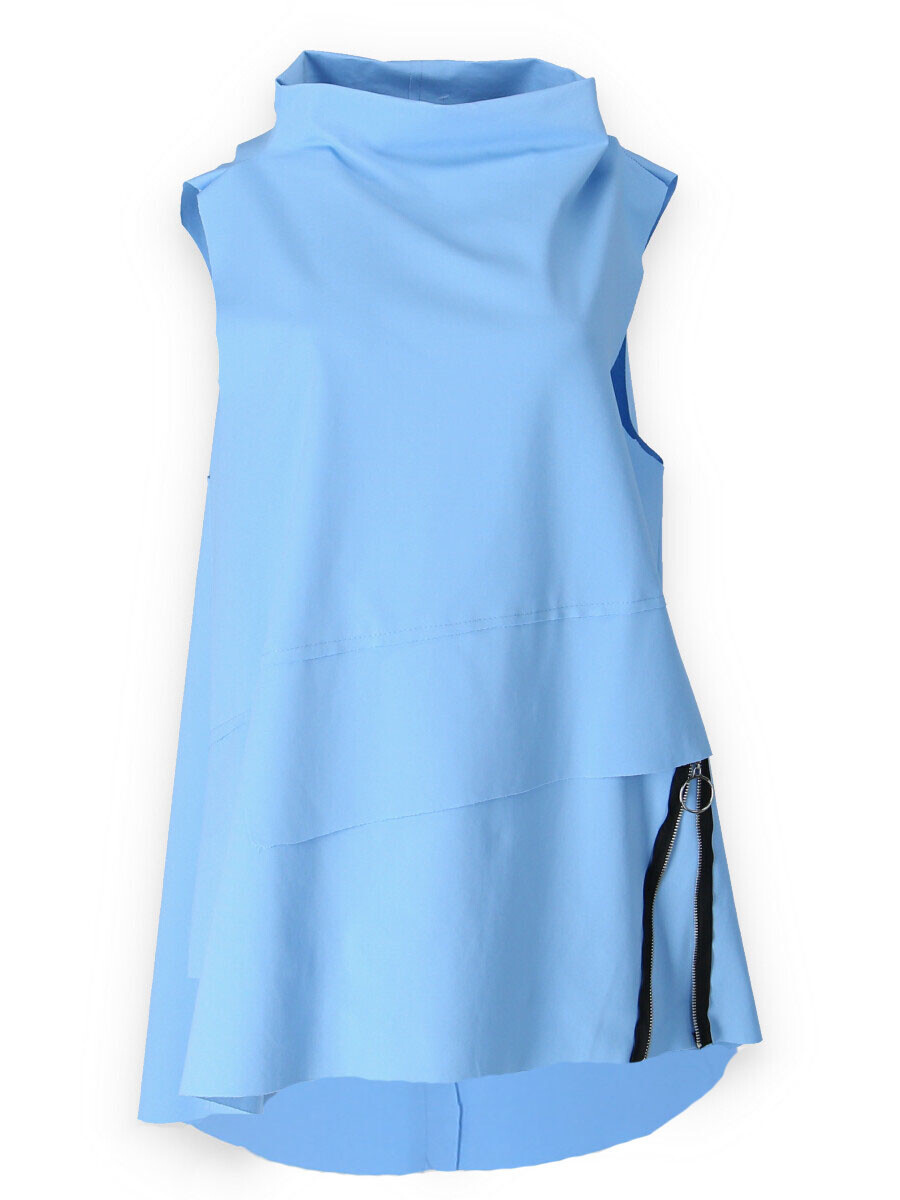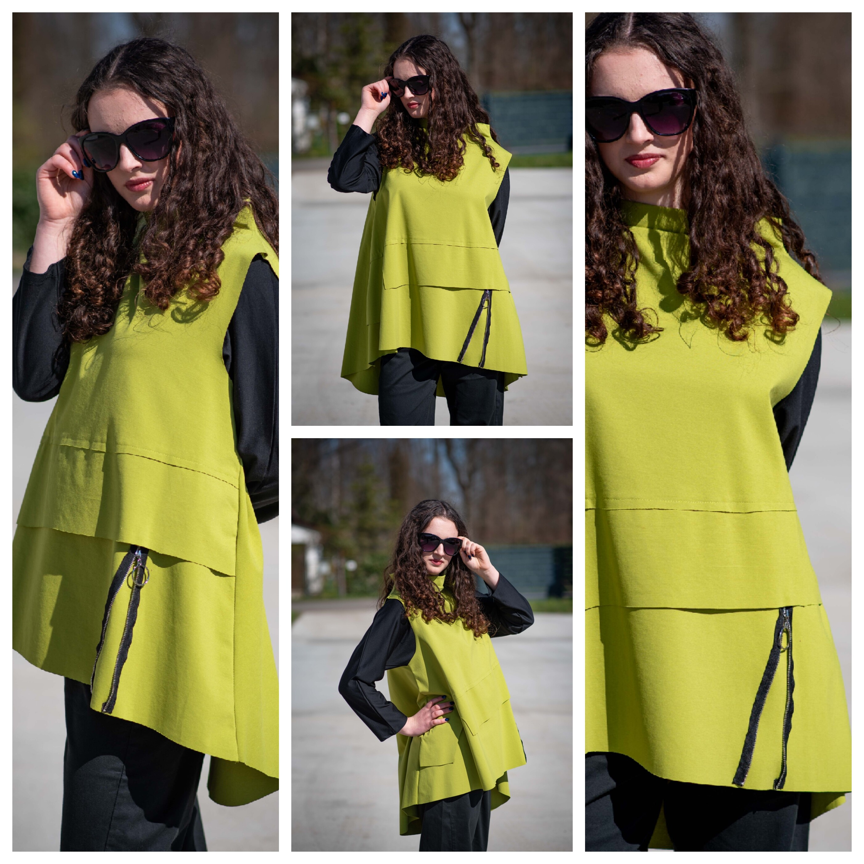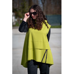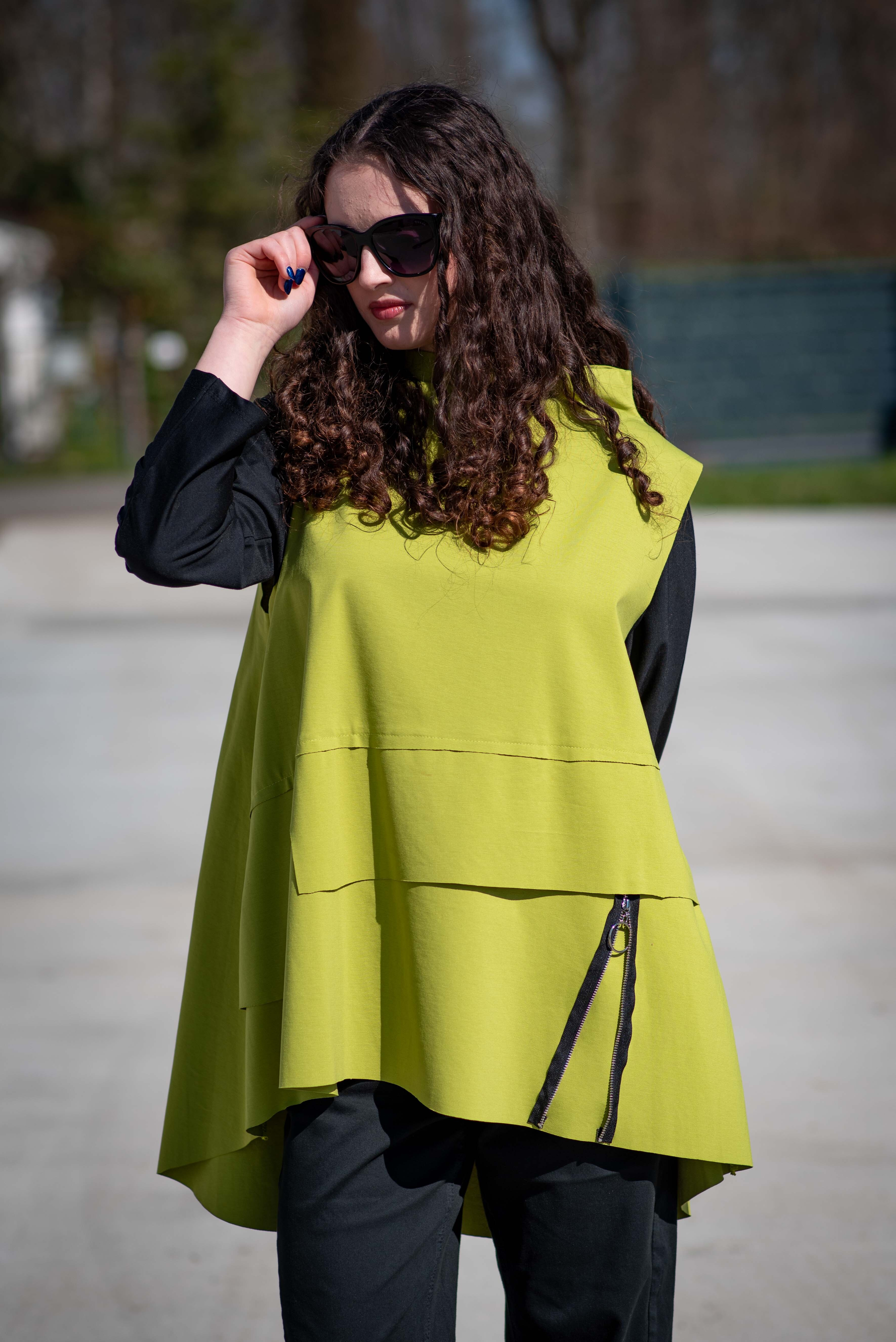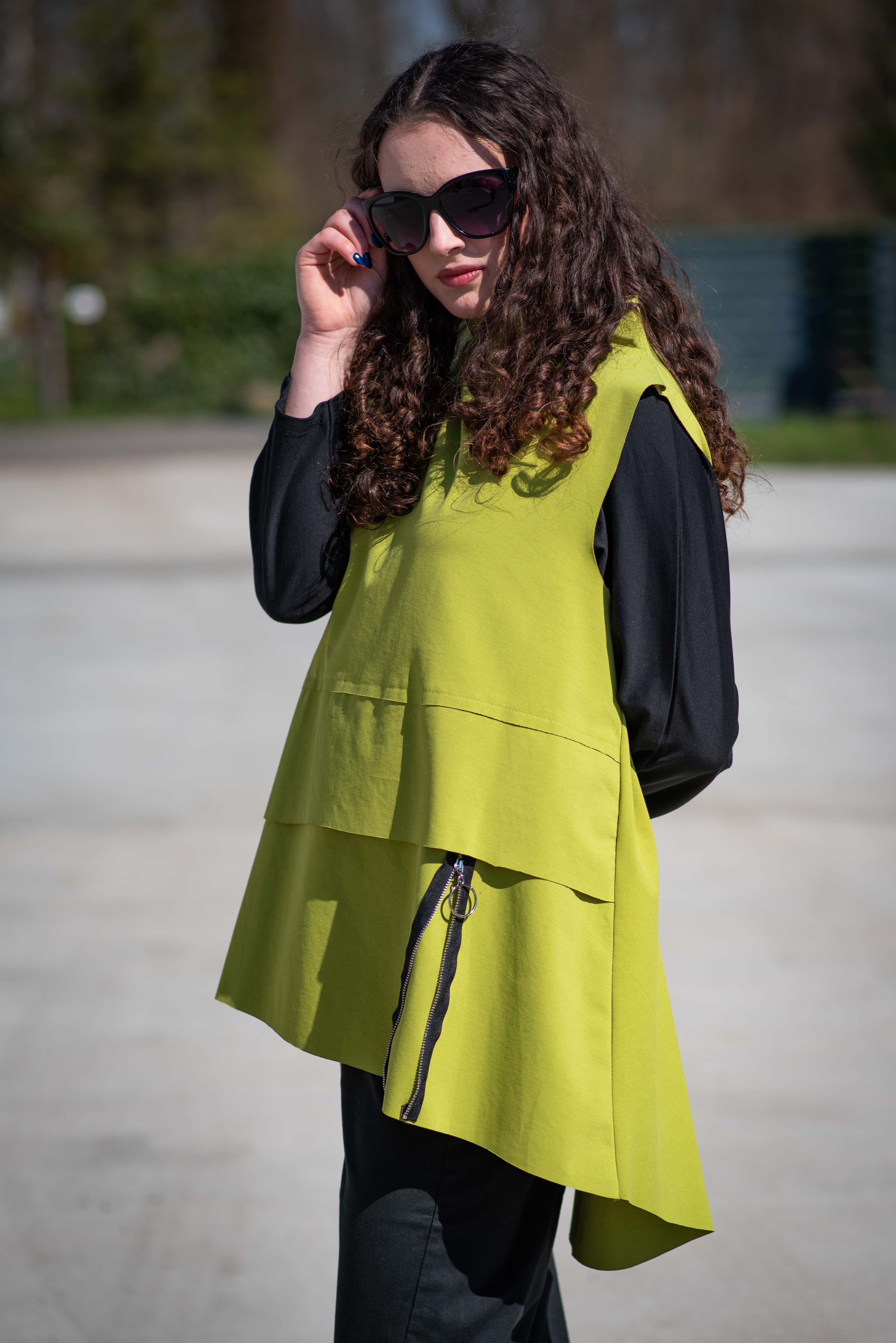 Trendy vesta se stojáčkem volnějšího střihu. Vesta má prodlouženou zadní délku a je doplněna aplikací zipu na přední straně.