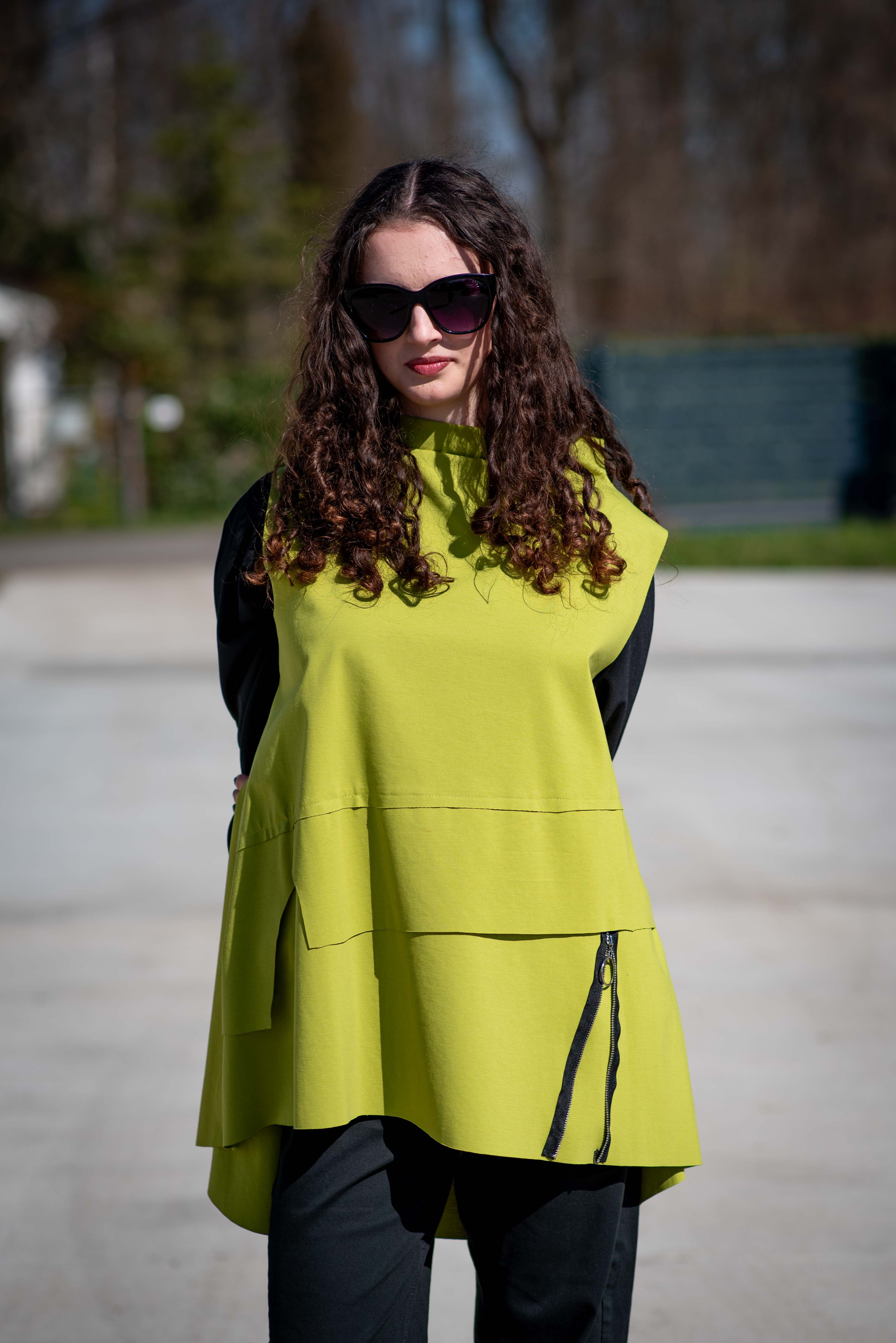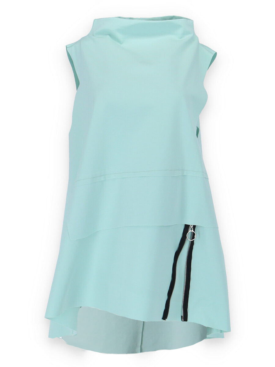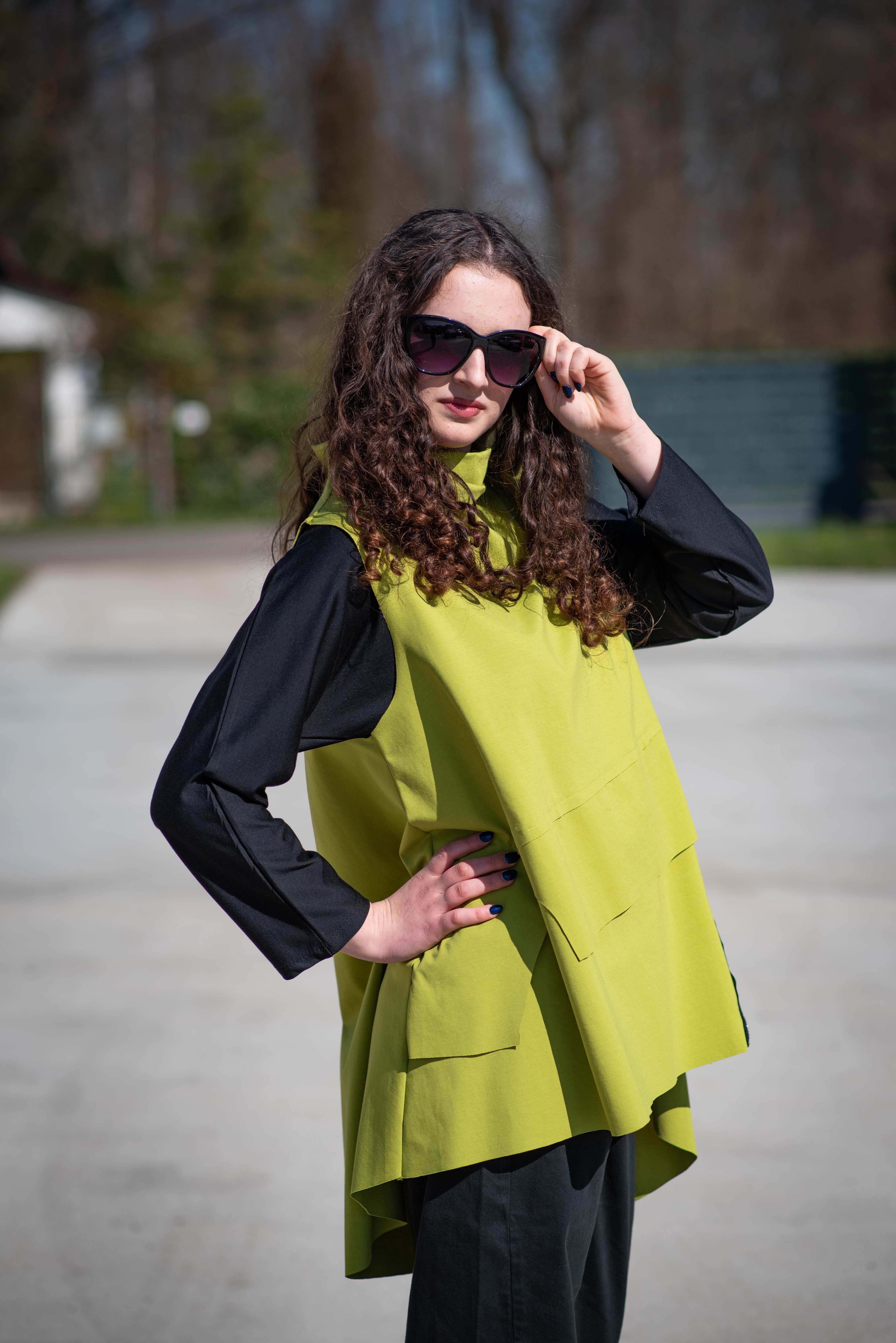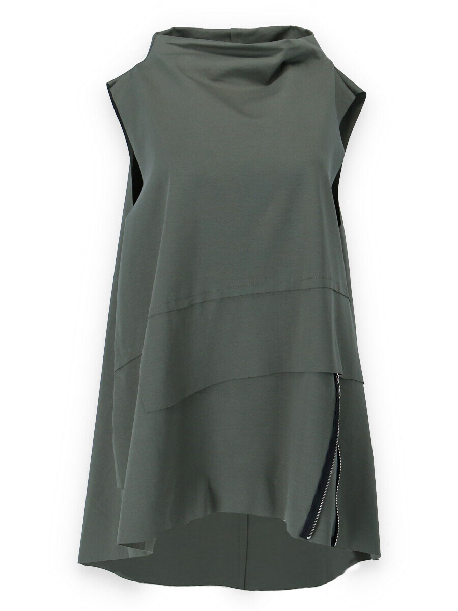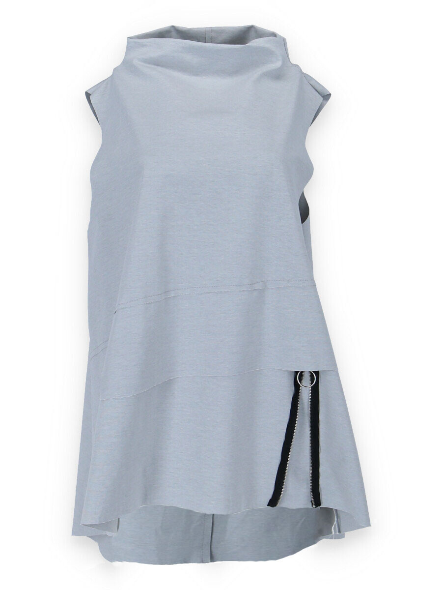 Trendy vesta se stojáčkem volnějšího střihu. Vesta má prodlouženou zadní délku a je doplněna aplikací zipu na přední straně.