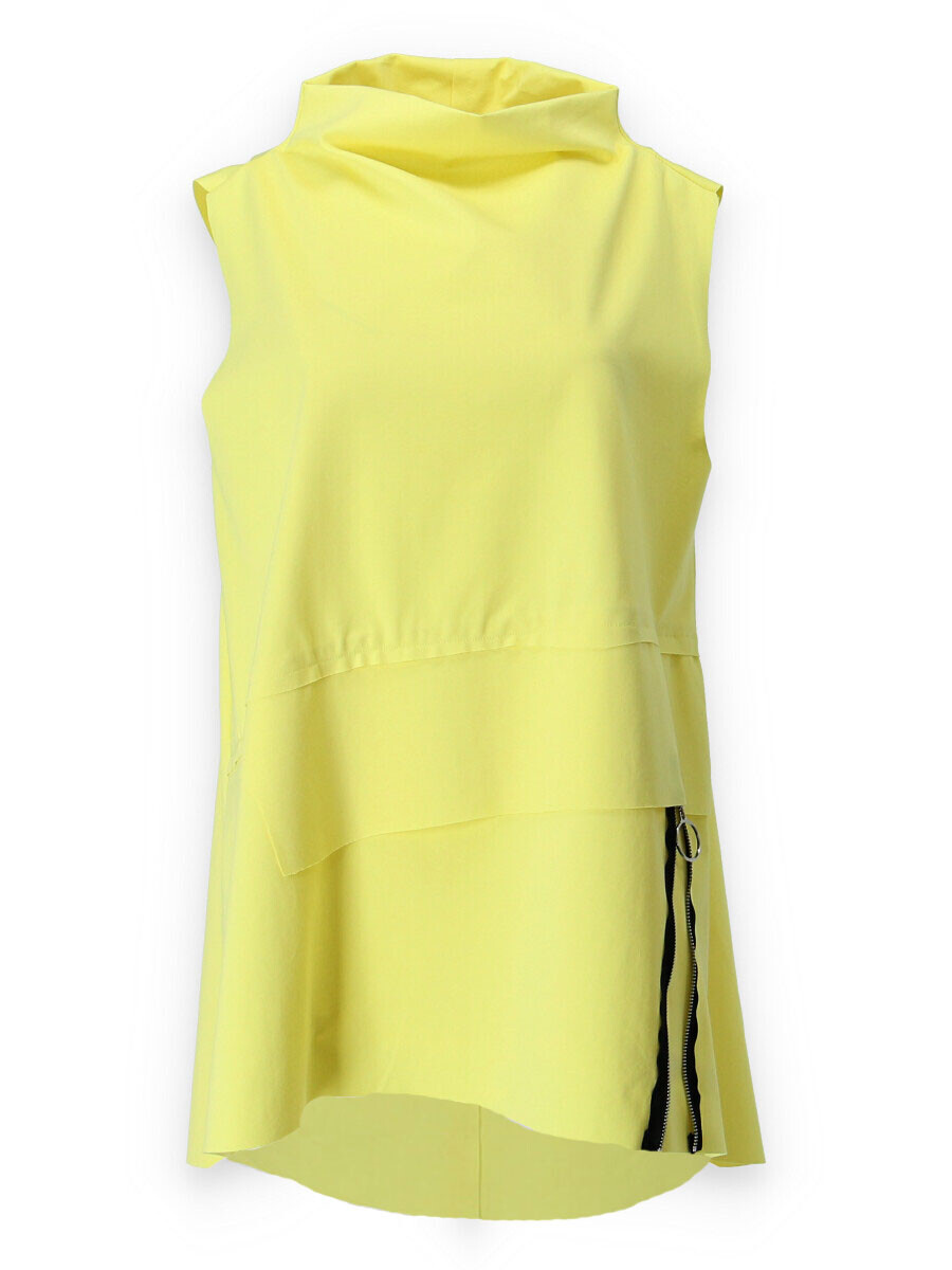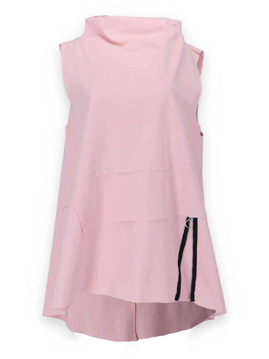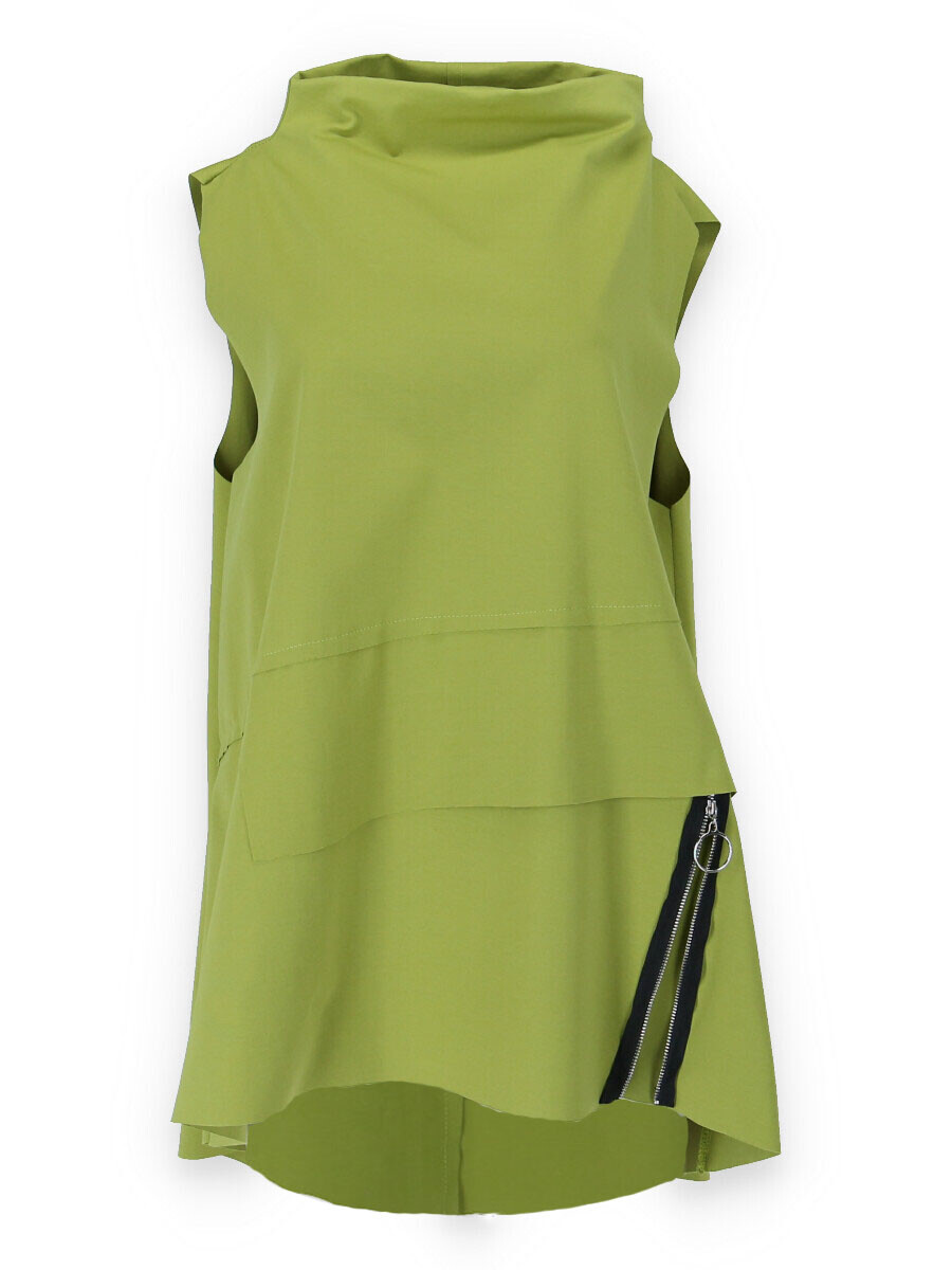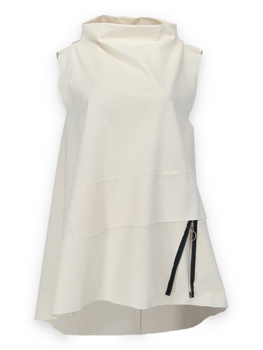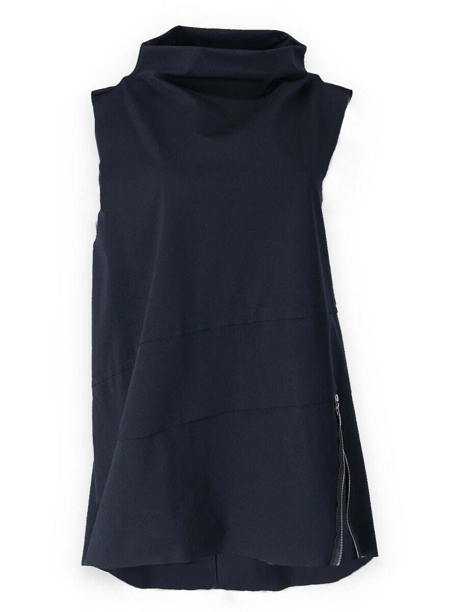 Trendy vesta se stojáčkem volnějšího střihu. Vesta má prodlouženou zadní délku a je doplněna aplikací zipu na přední straně.