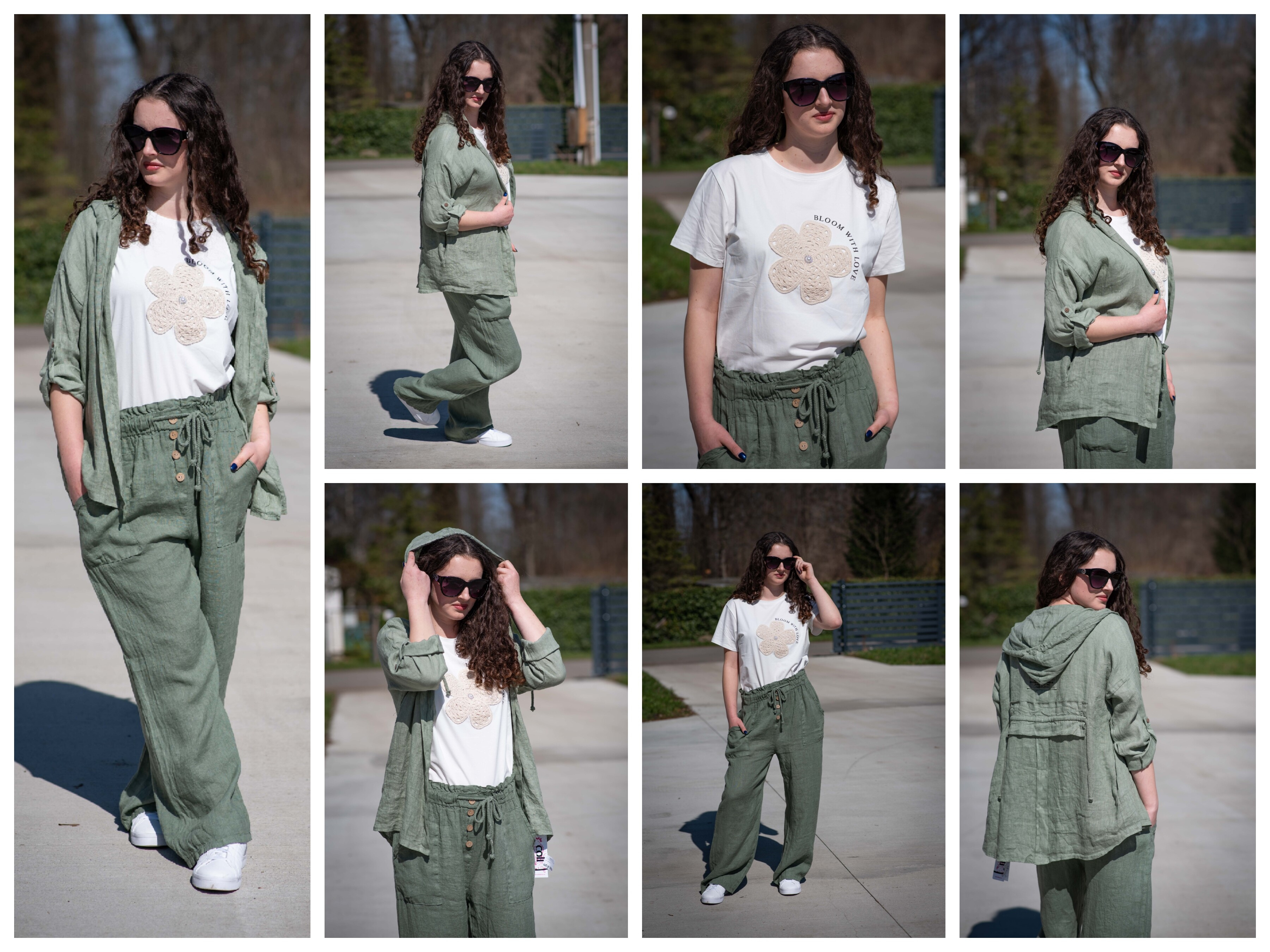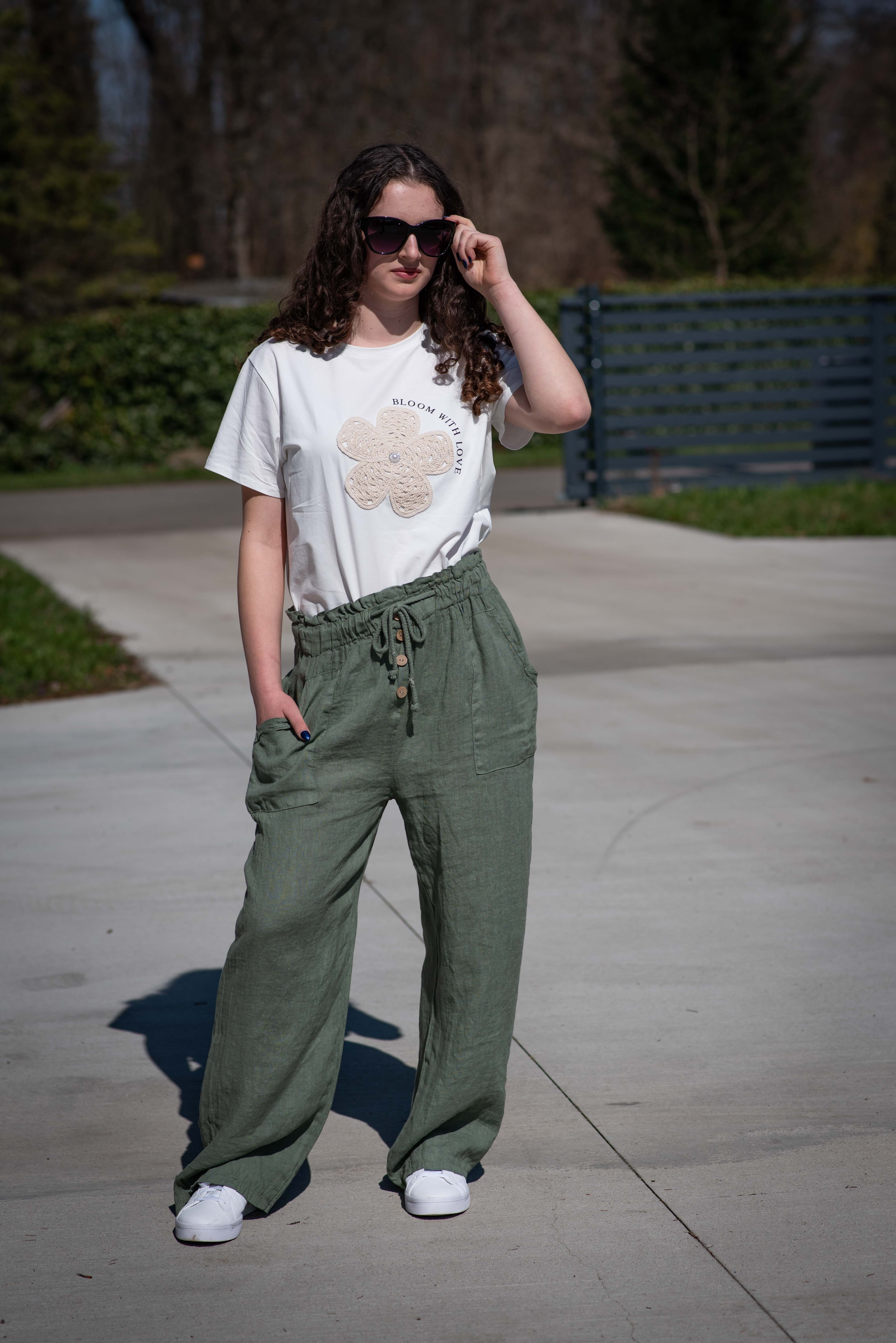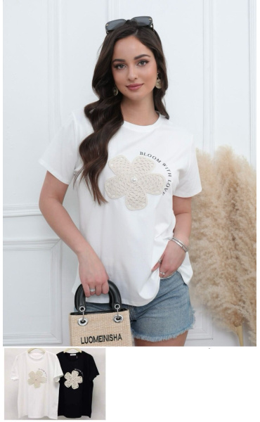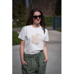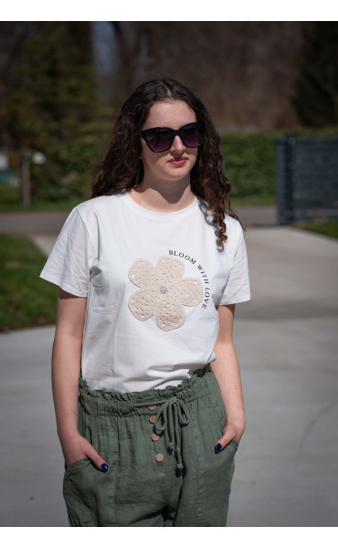 Dámské triko s aplikací výšivky květu. Triko má krátký rukáv a kulatý výstřih. Dovoz Itálie