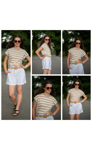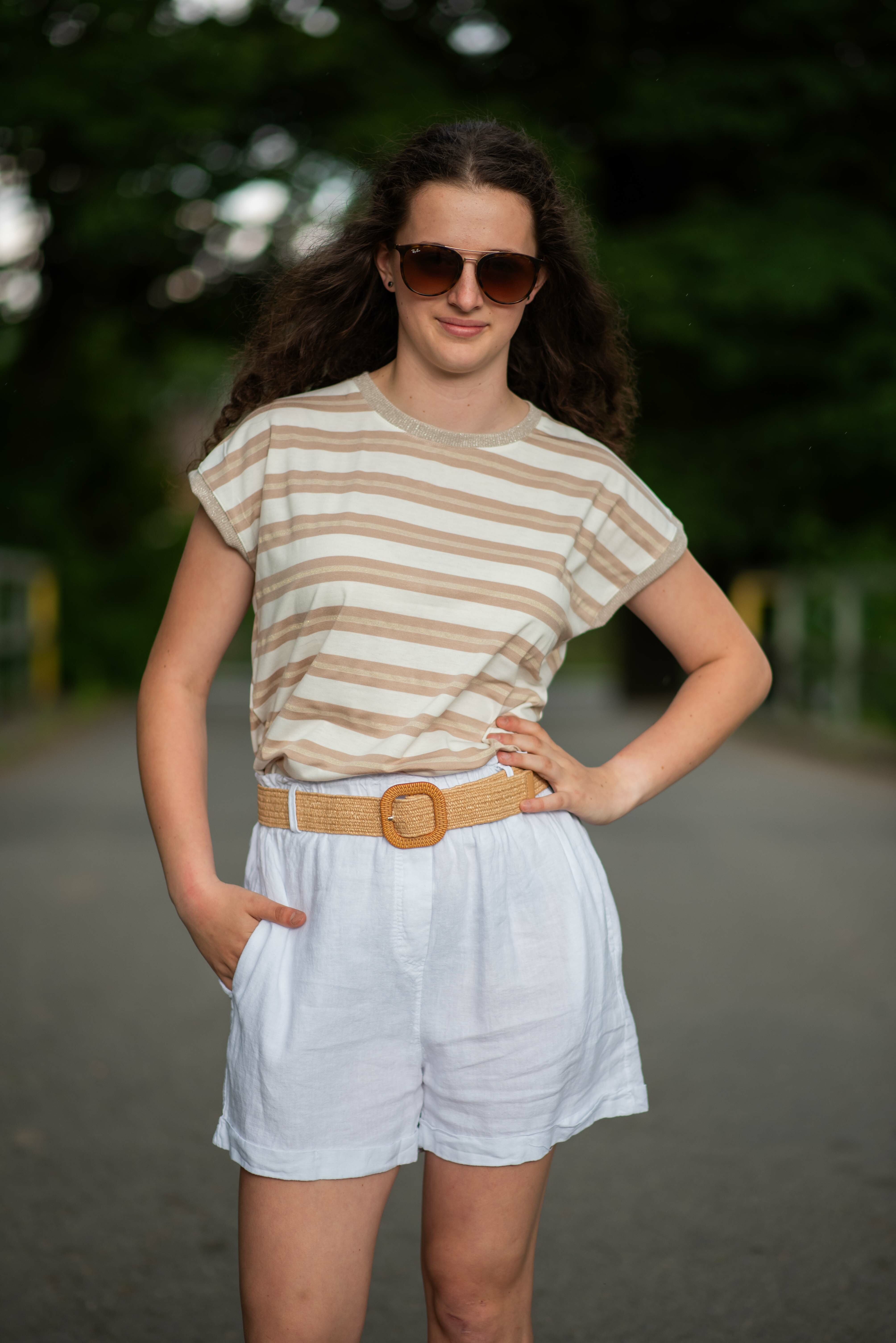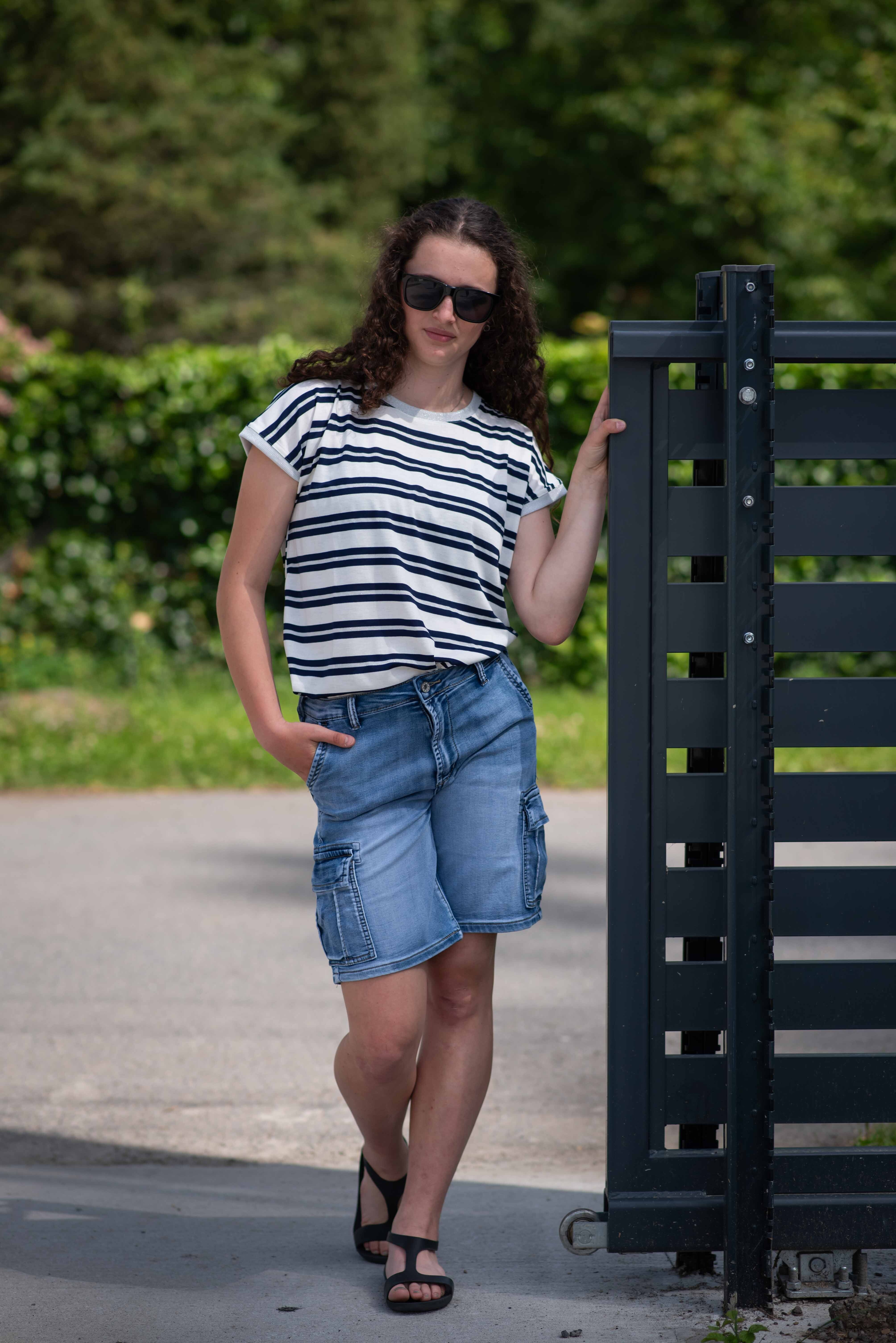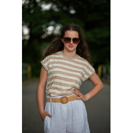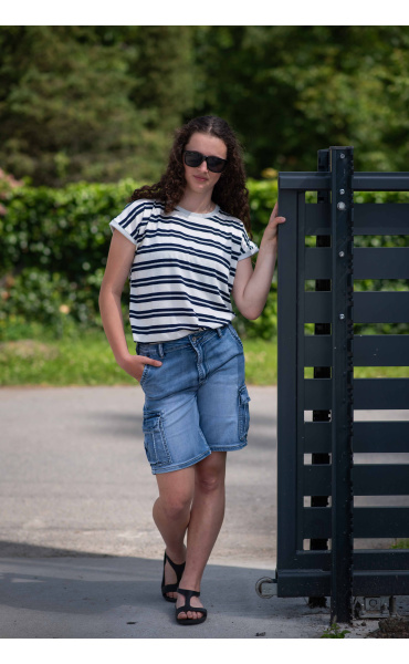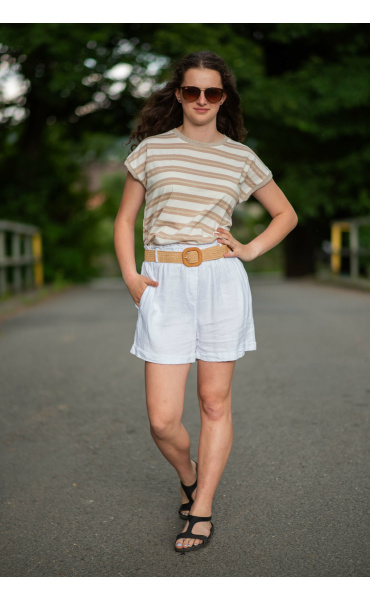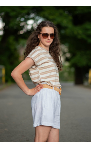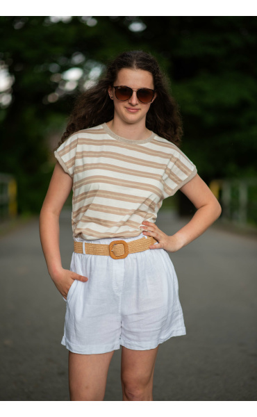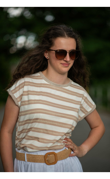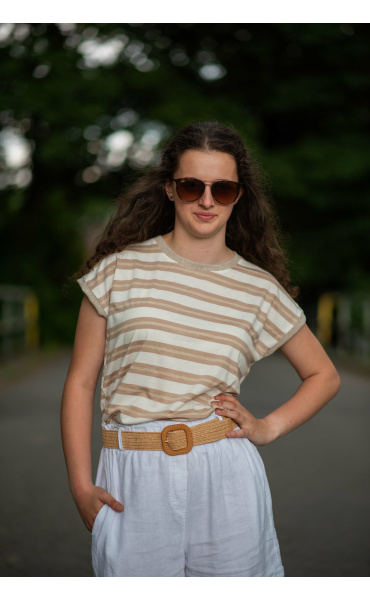Dámské módní triko s proužkem. Triko má kulatý výstřih a krátký rukáv.