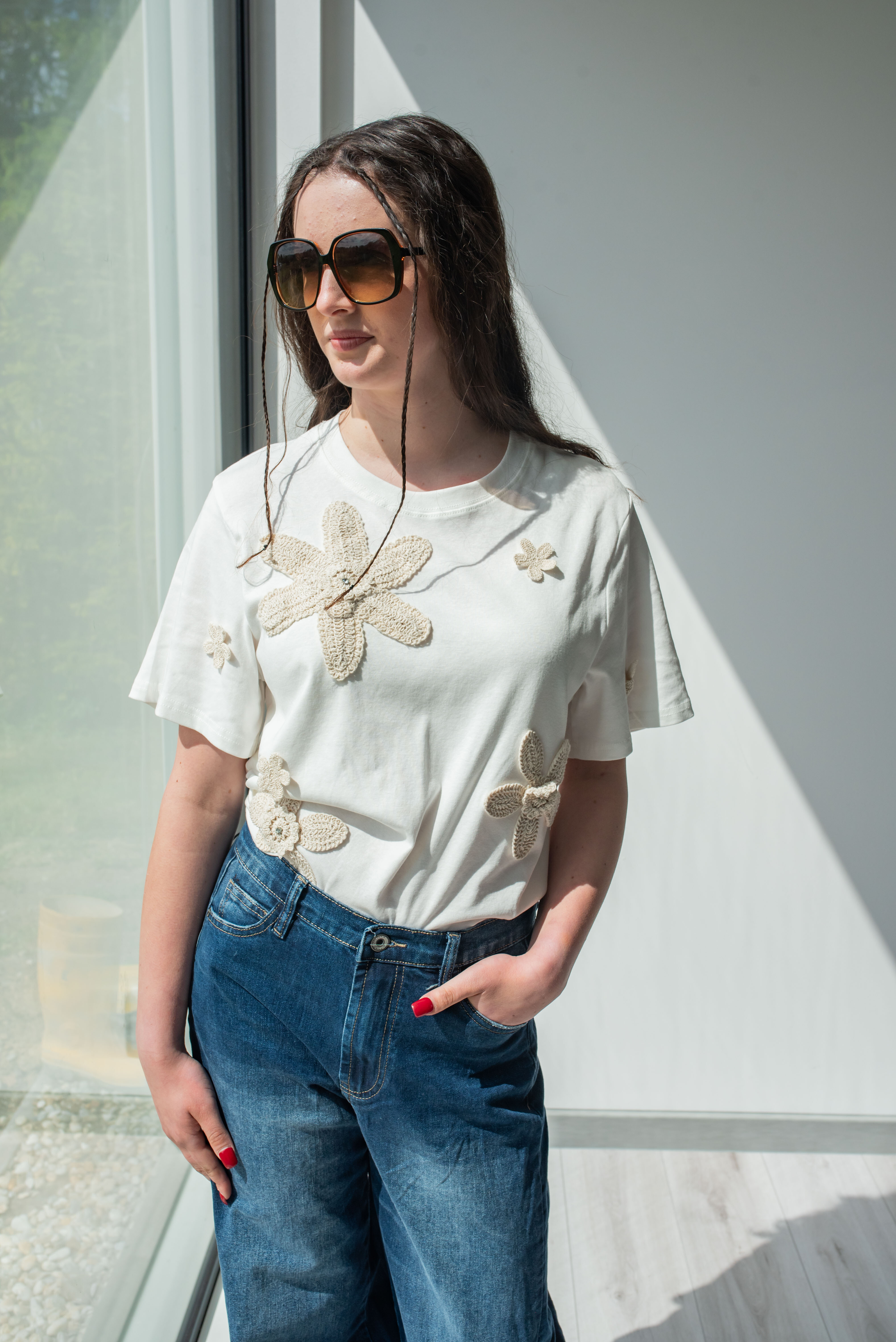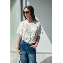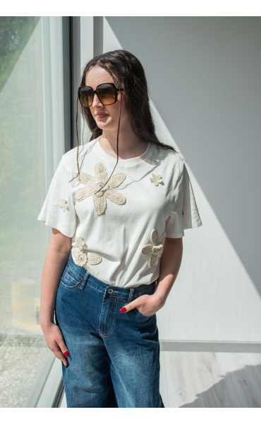 Dámské triko s krátkým rukávem. Triko má na přední straně háčkované květy s 3D efektem a kulatý výstřih. Dovoz Itálie
