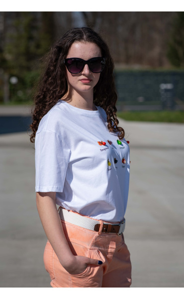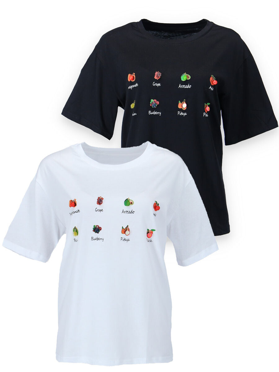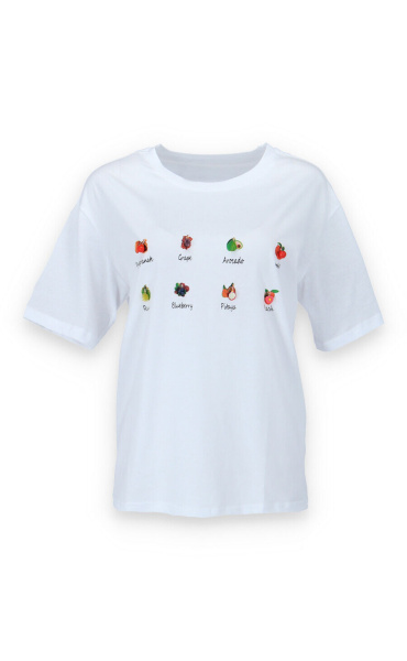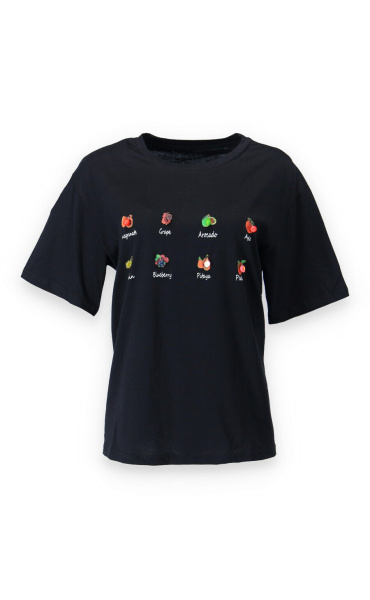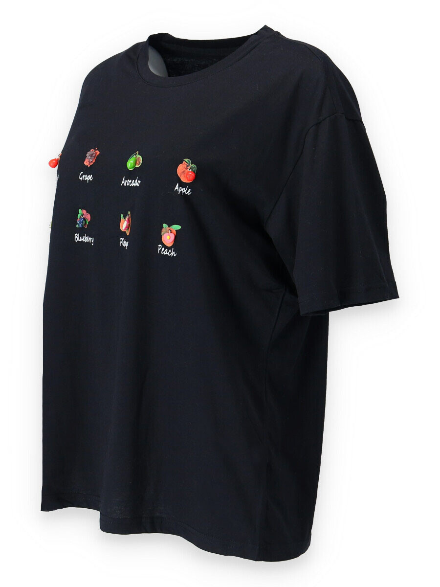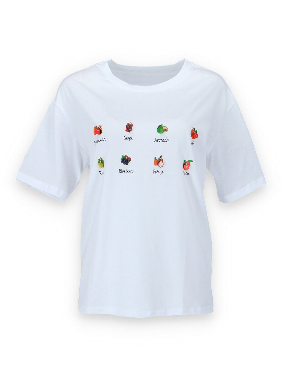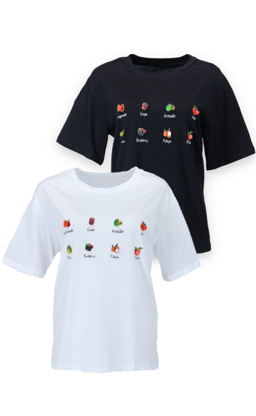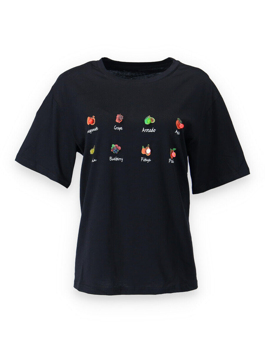 Dámské triko s aplikací ovoce na přední straně. Triko má krátký rukáv a kulatý výstřih. Dovoz Itálie