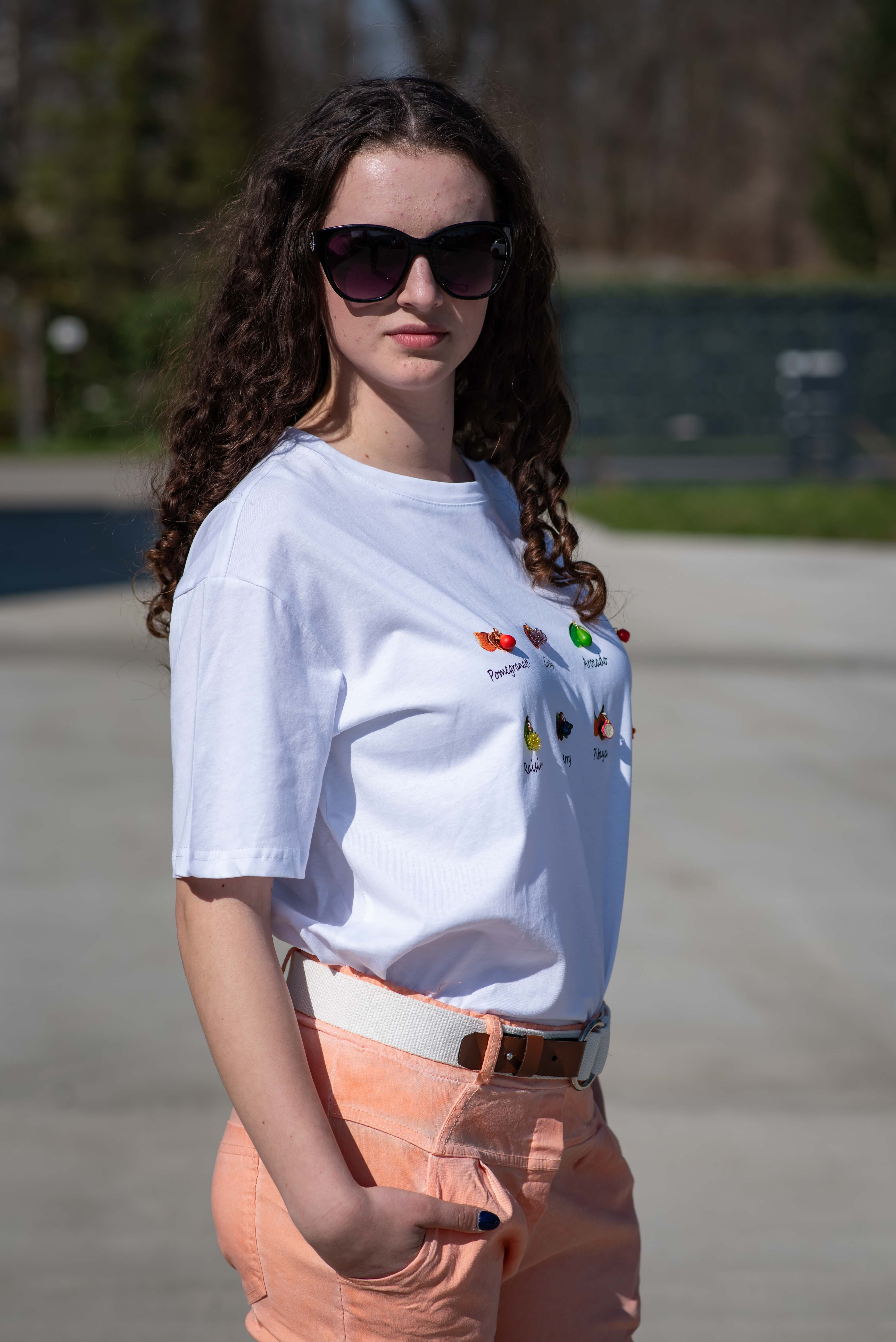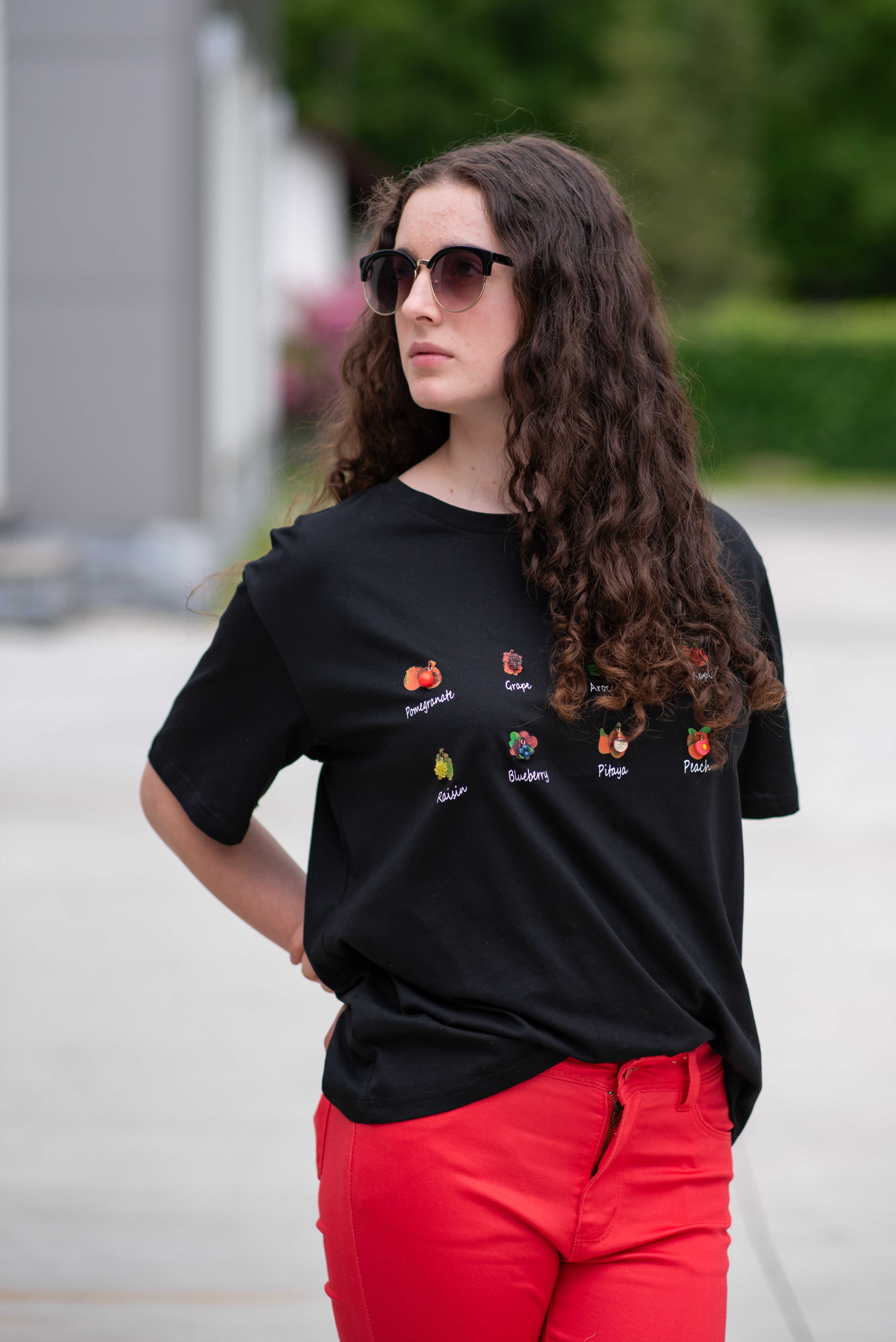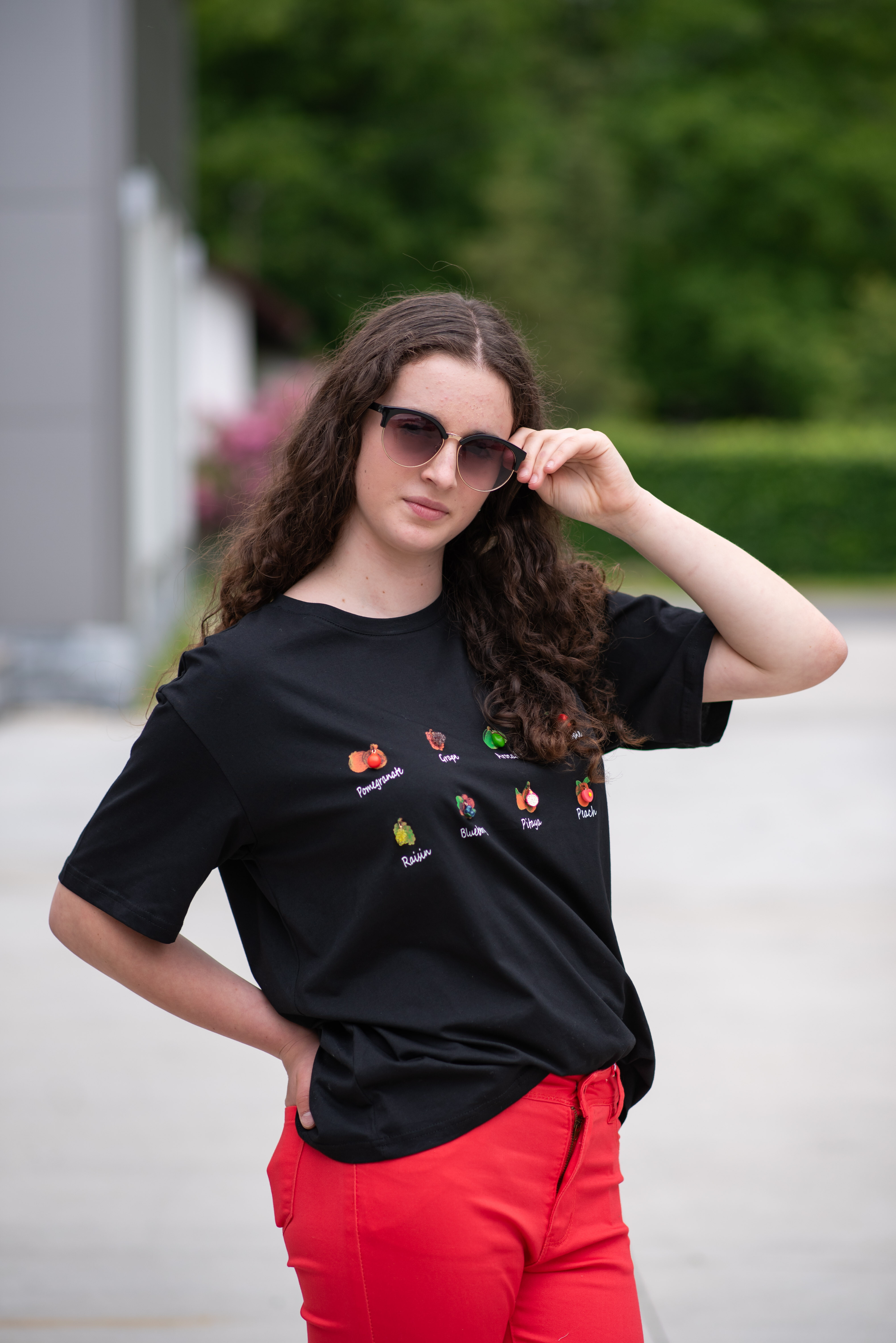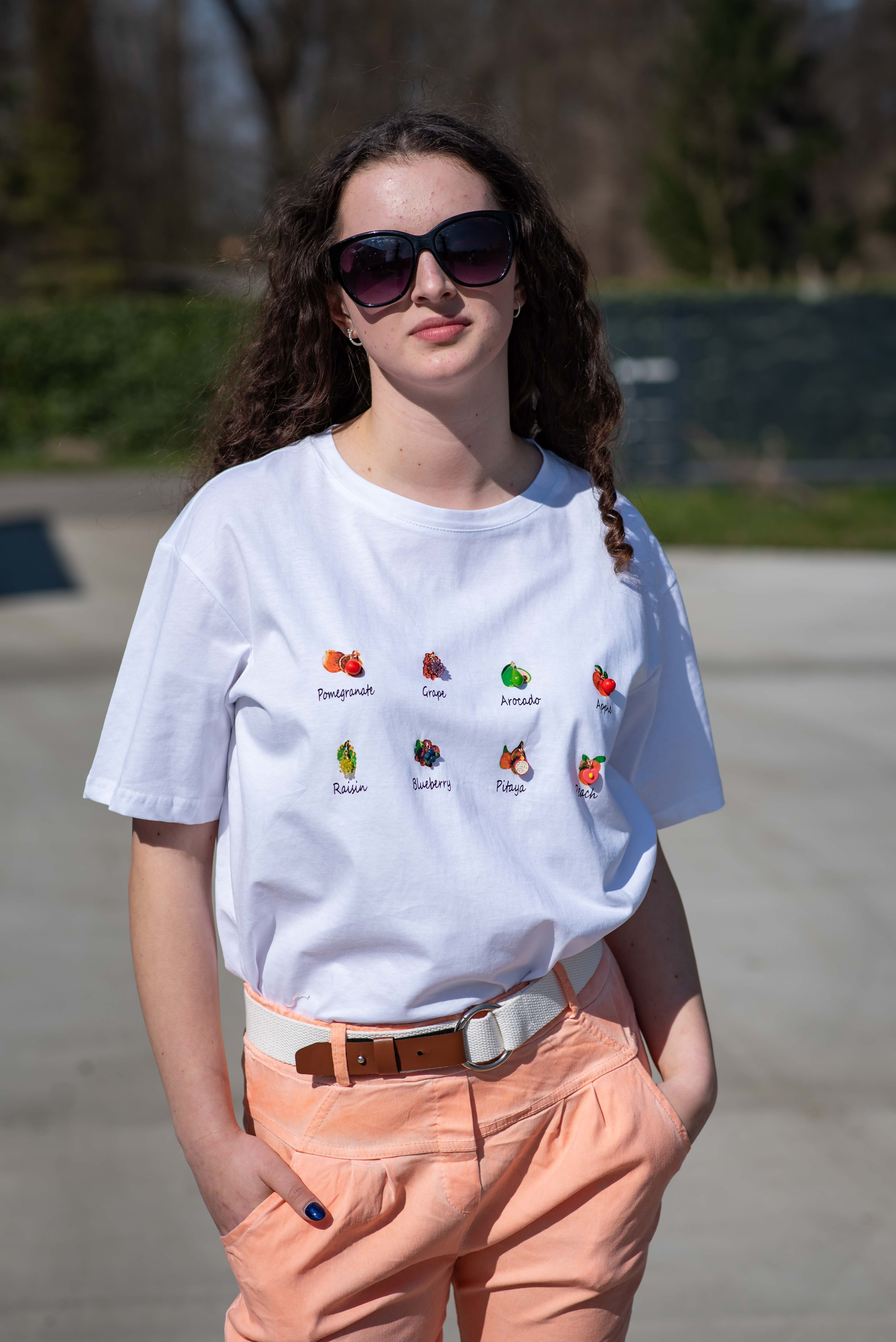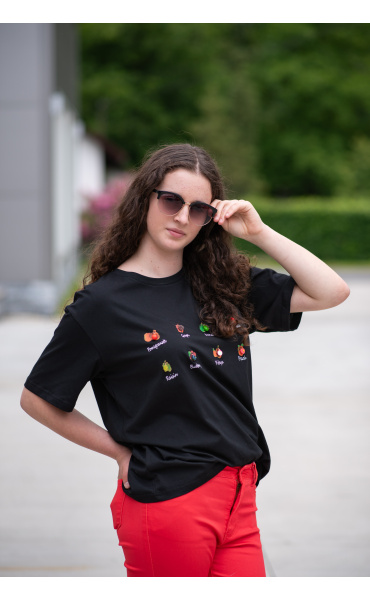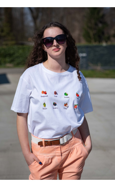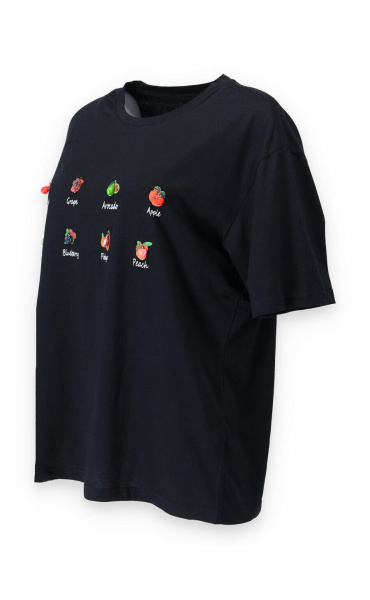 Dámské triko s aplikací ovoce na přední straně. Triko má krátký rukáv a kulatý výstřih. Dovoz Itálie