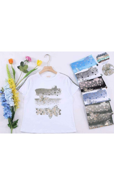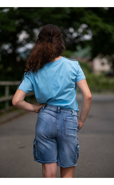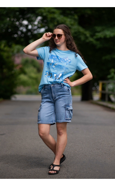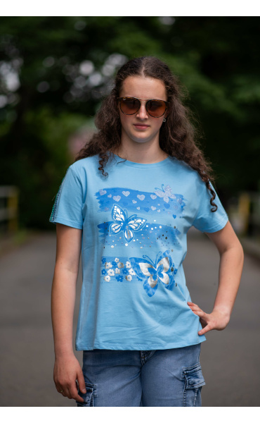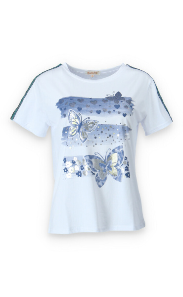 Dámské módní triko s potiskem. Triko má kulatý výstřih a krátký rukáv.
