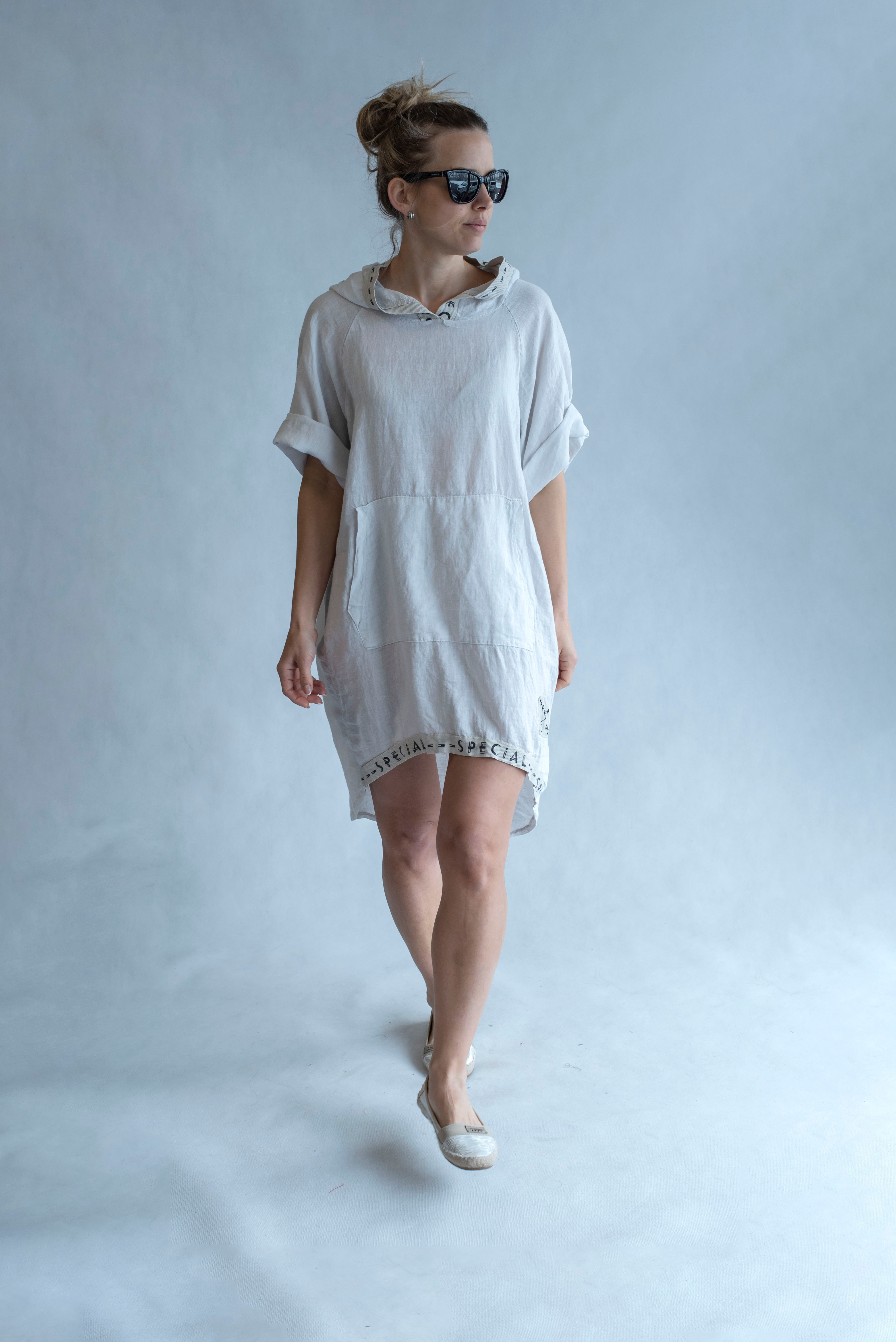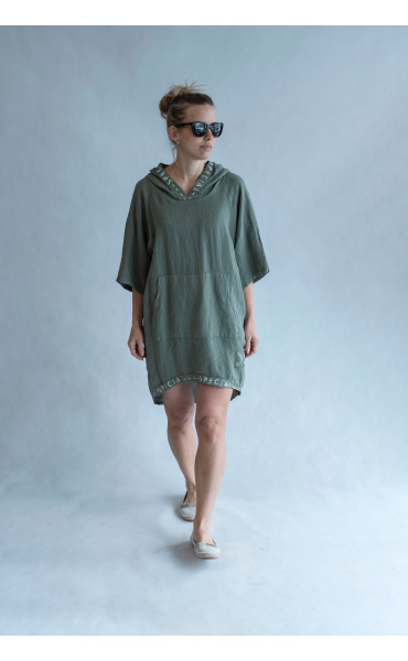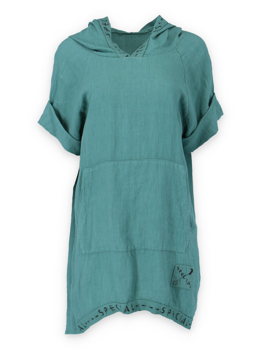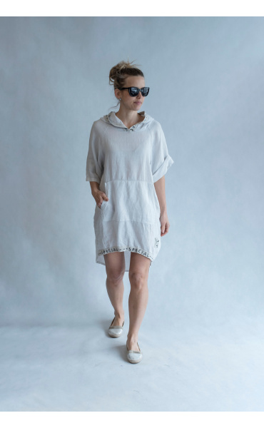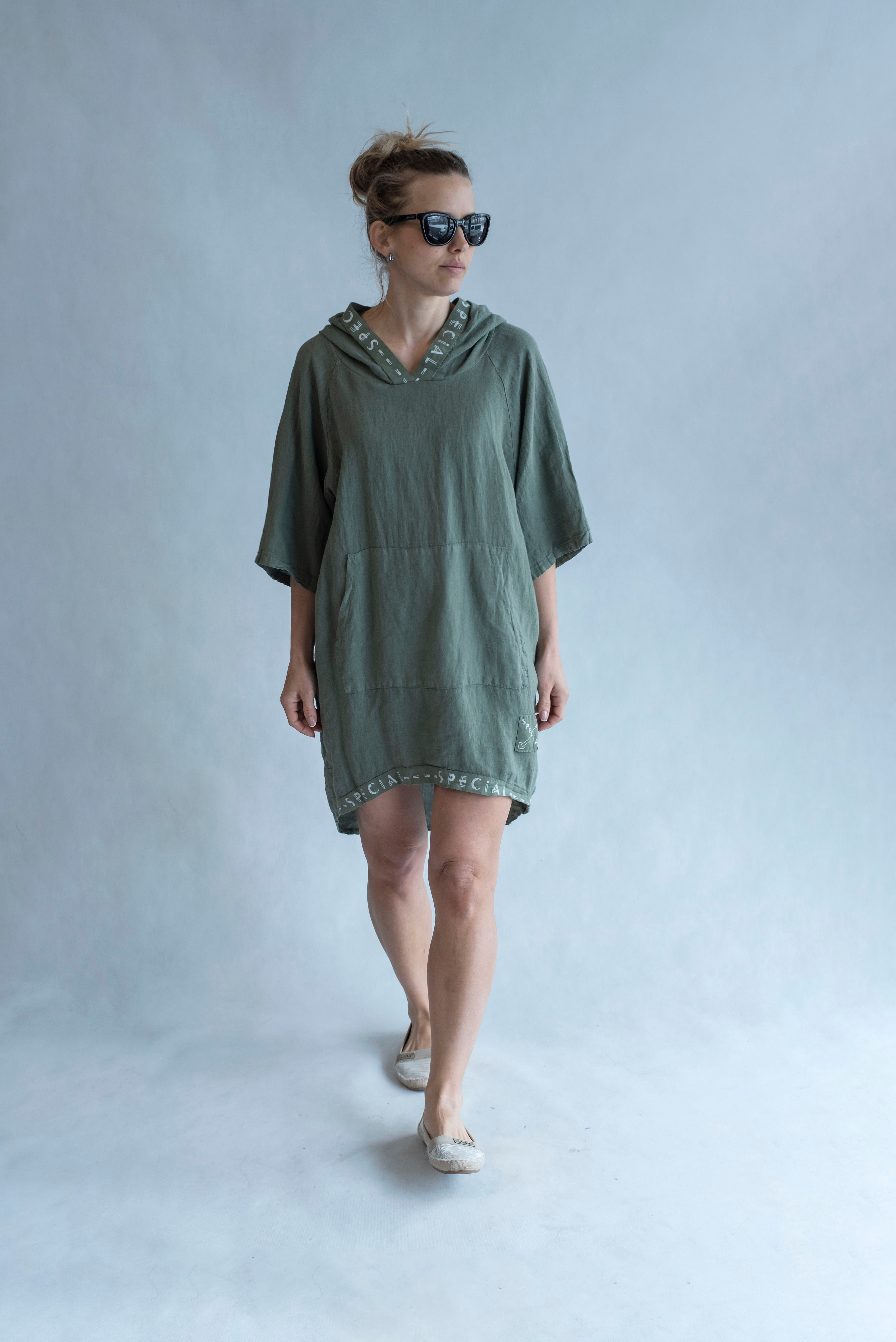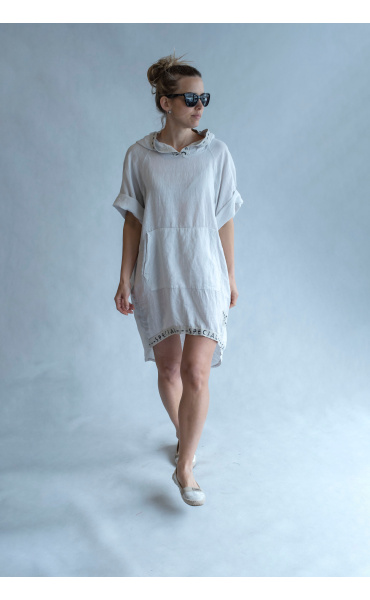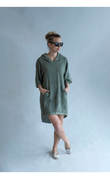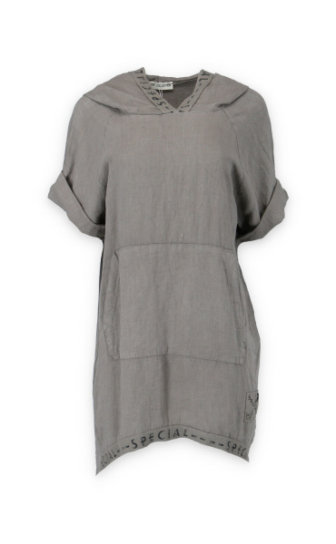 Lněná tunika s kapucí, velká přední kapsa-klokánka , prodloužená zadní část