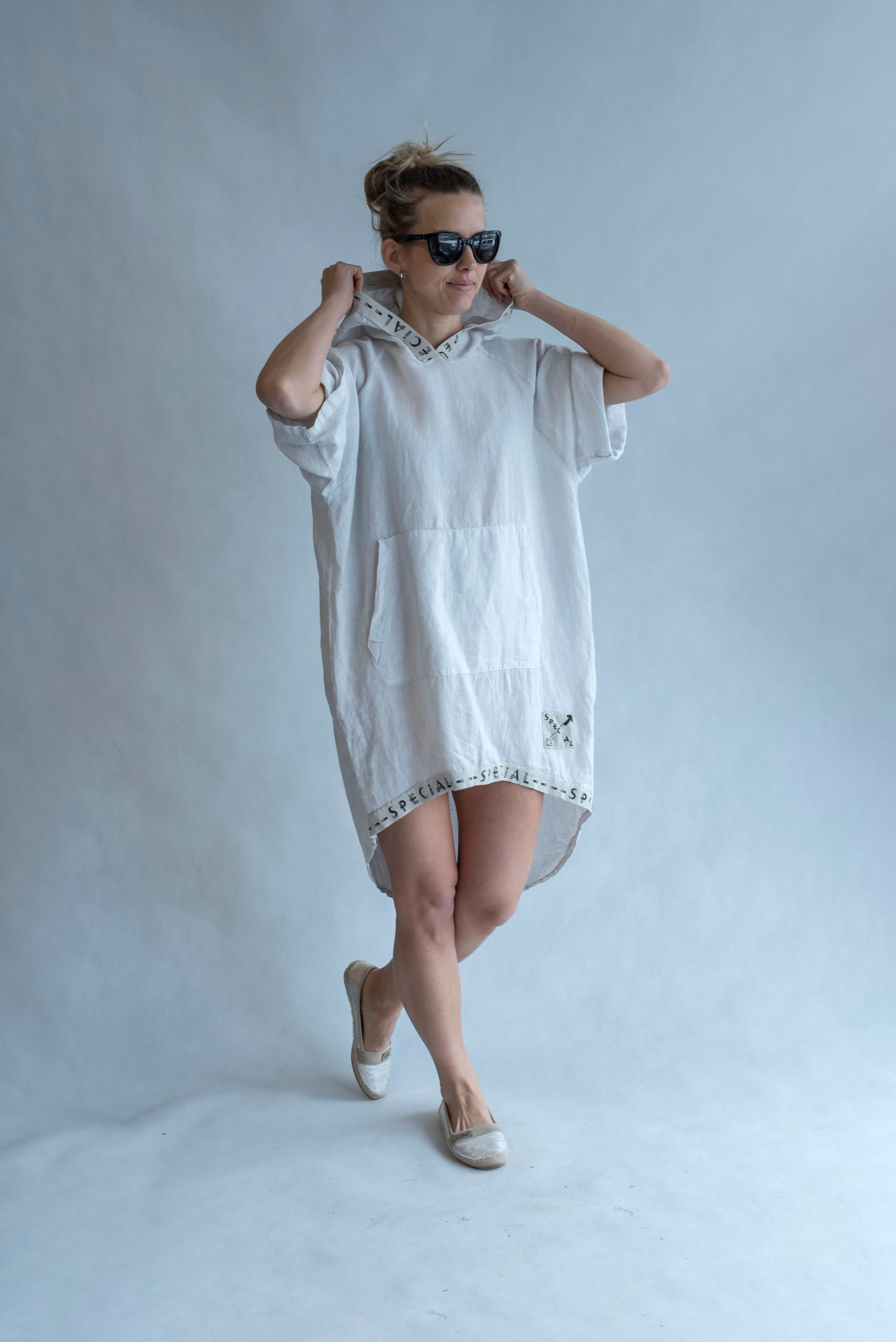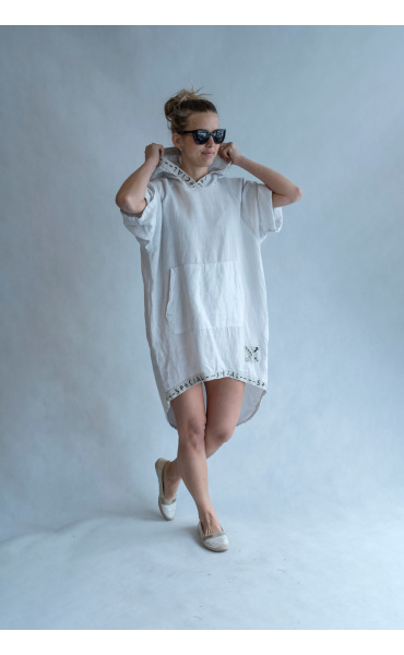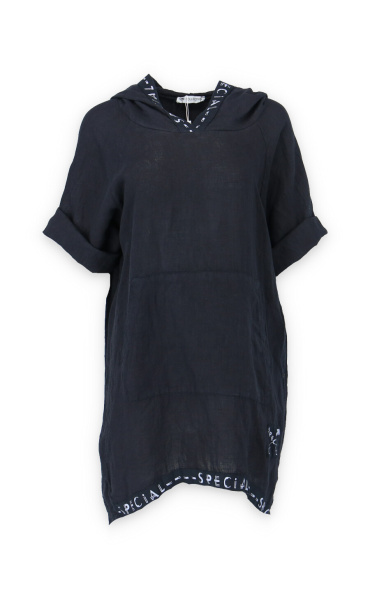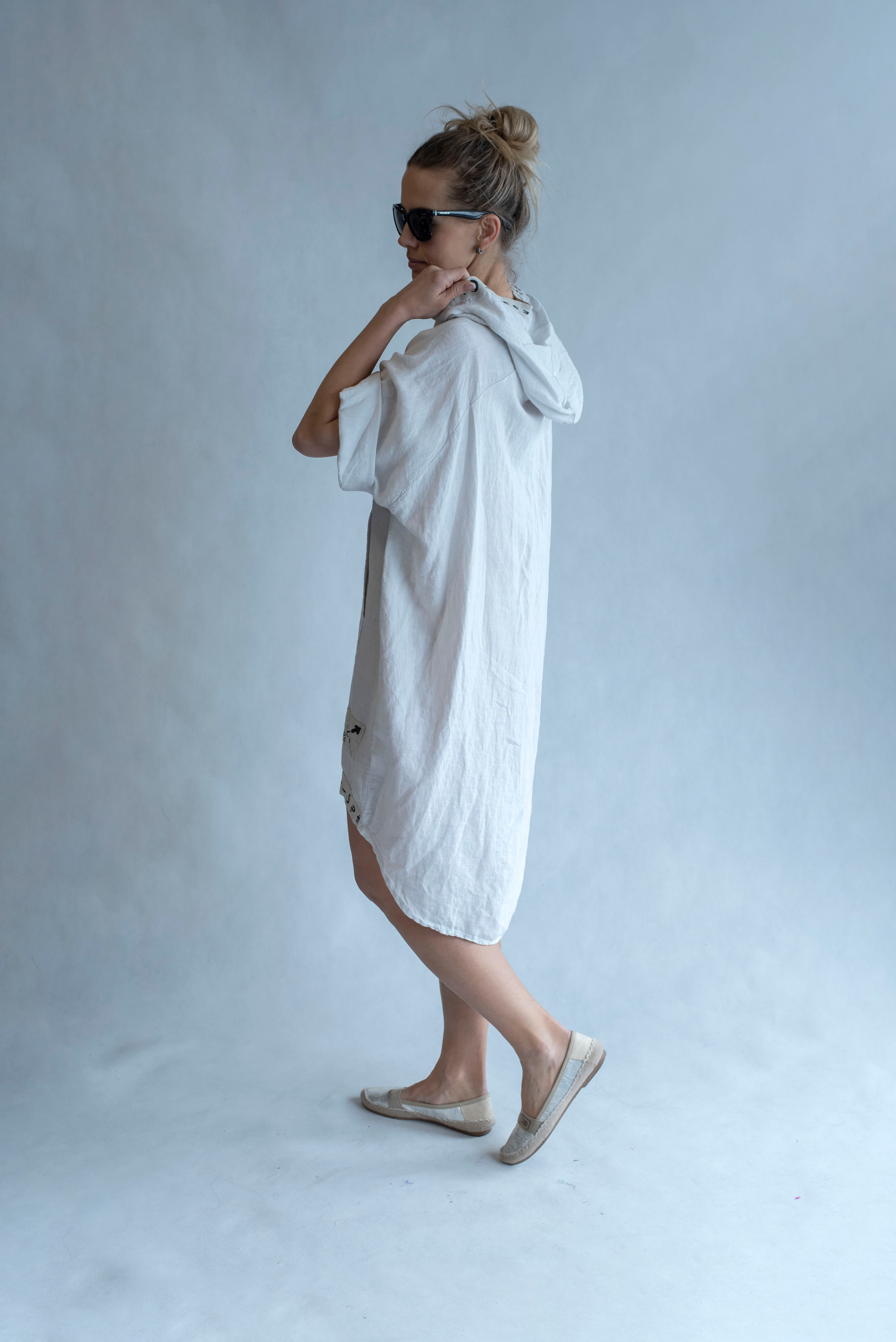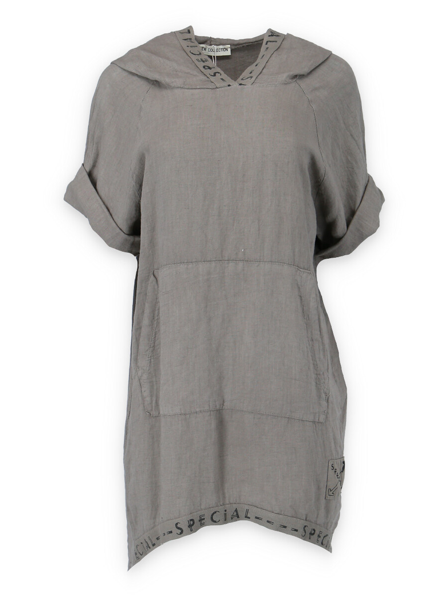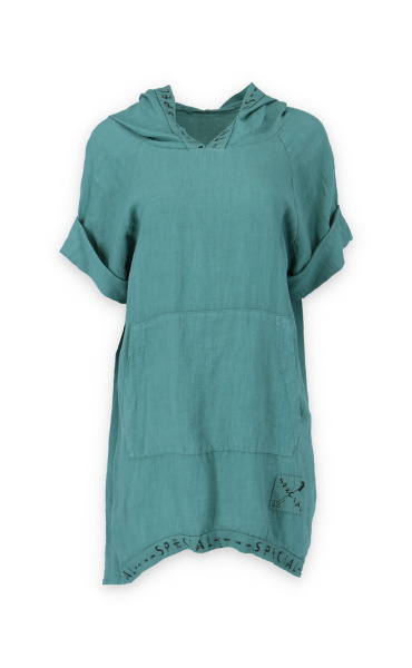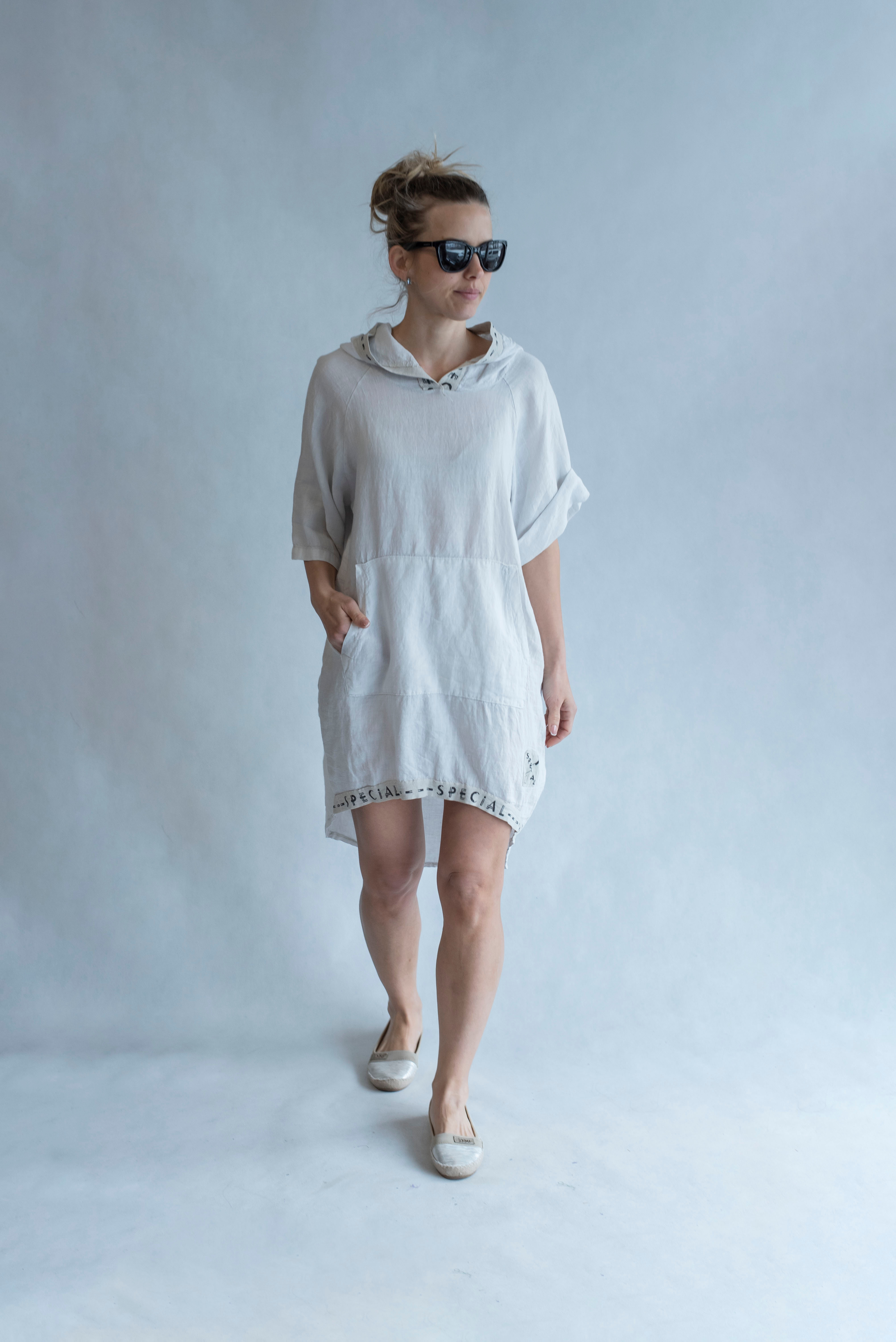 Lněná tunika s kapucí, velká přední kapsa-klokánka , prodloužená zadní část