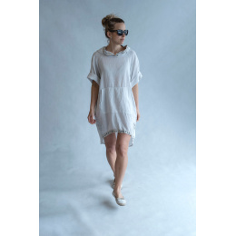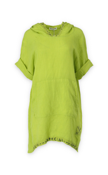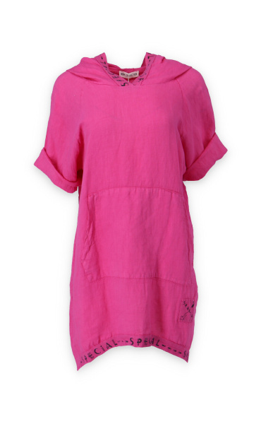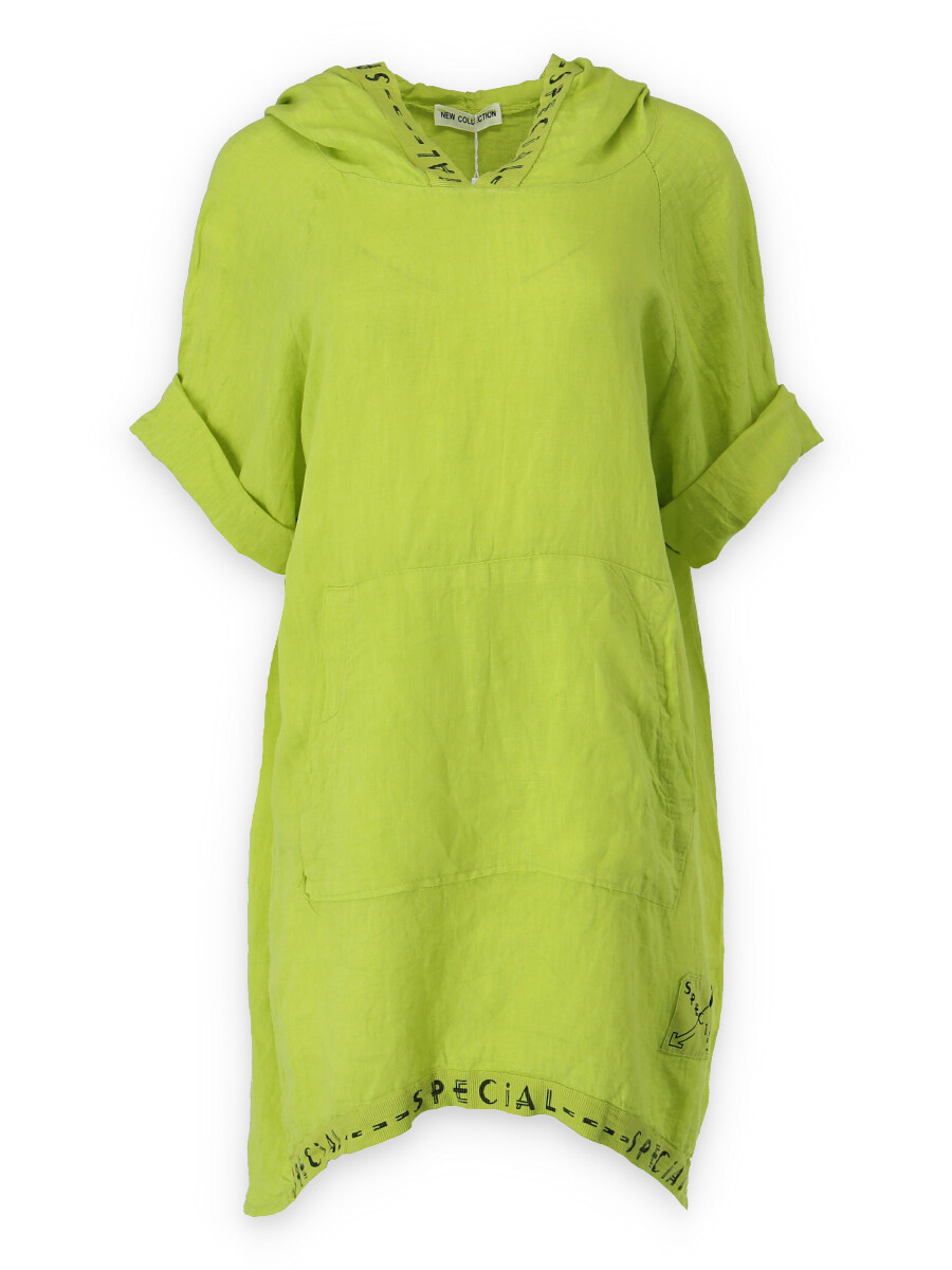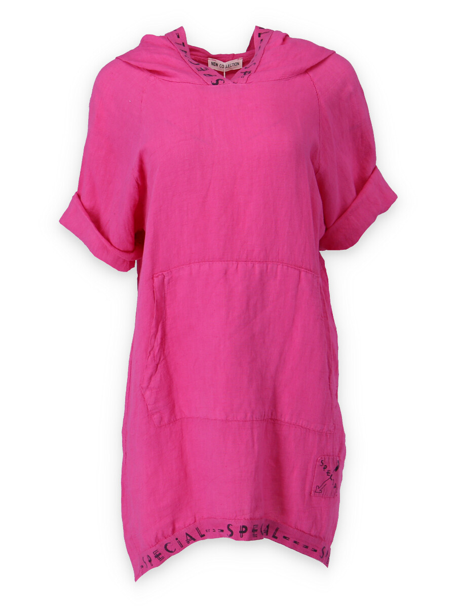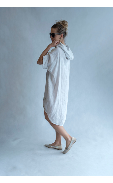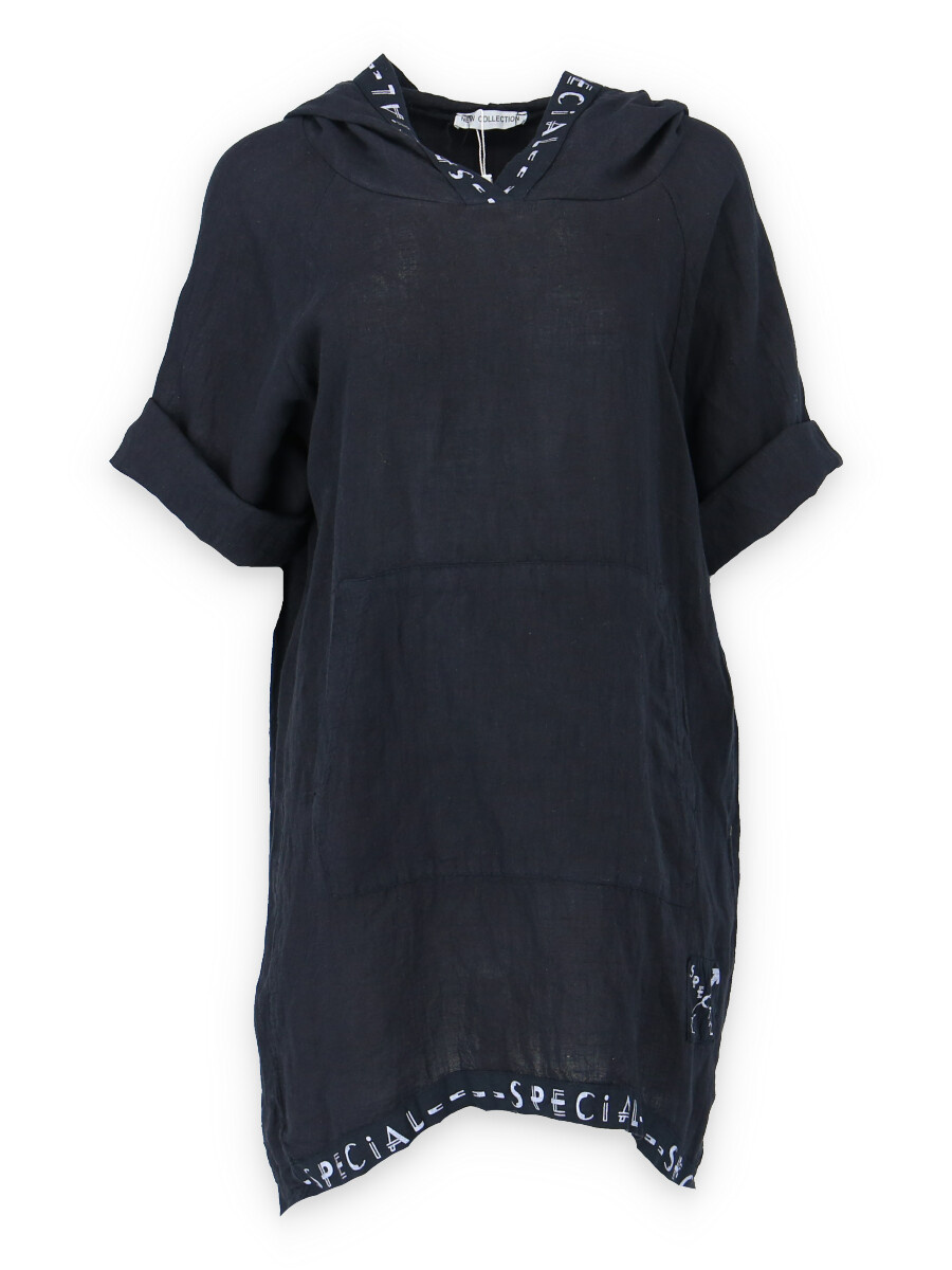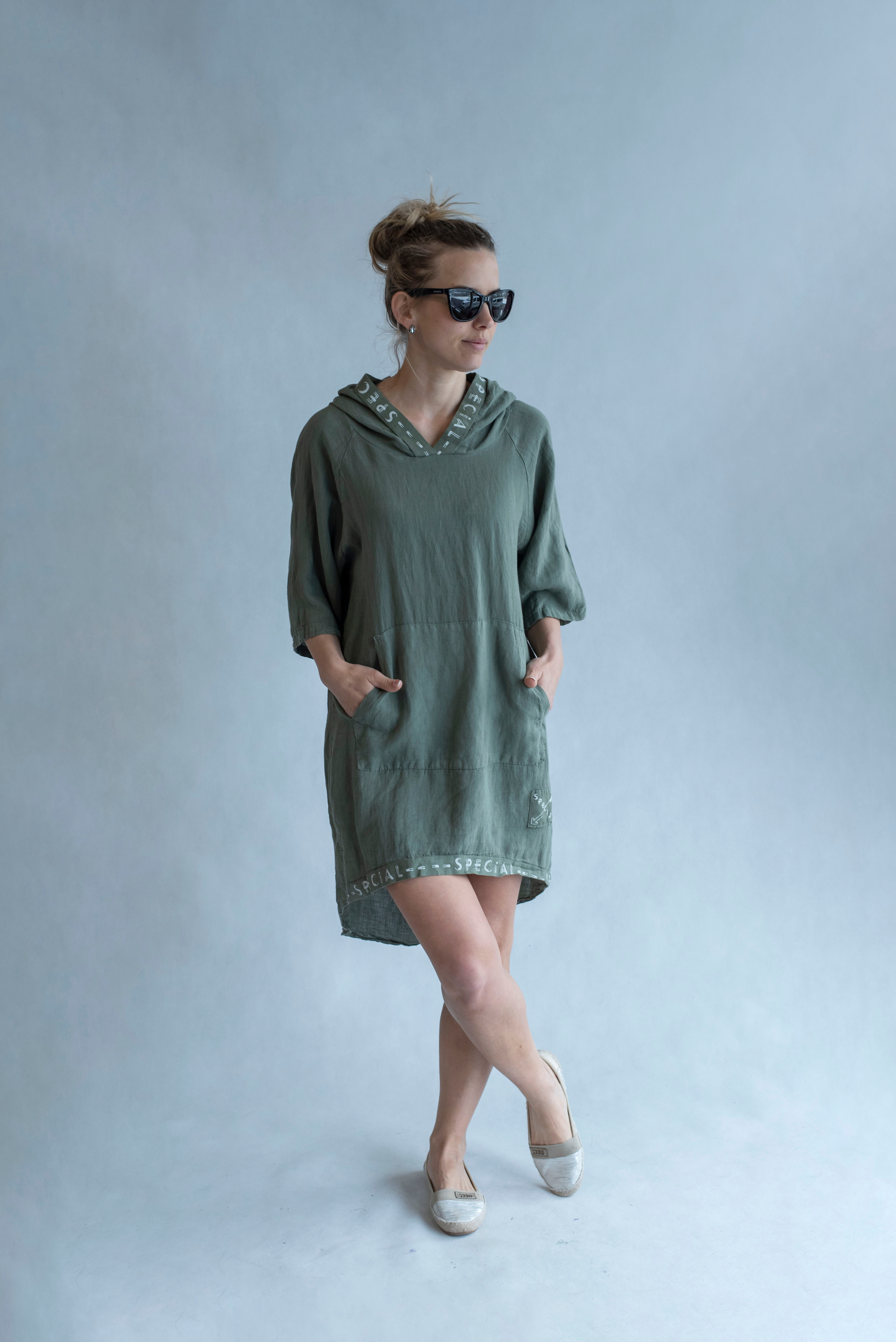 Lněná tunika s kapucí, velká přední kapsa-klokánka , prodloužená zadní část