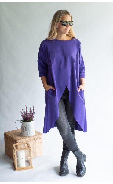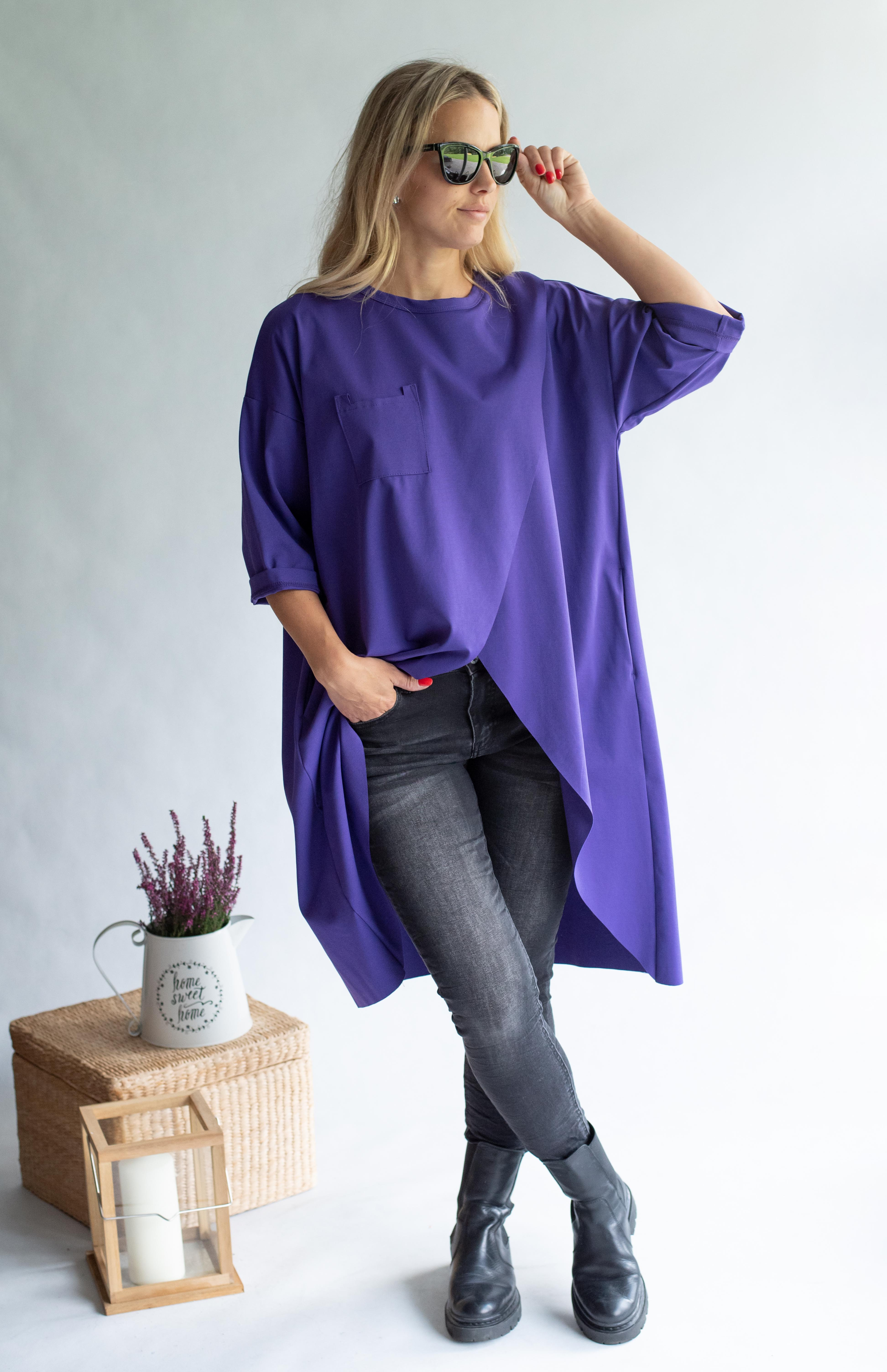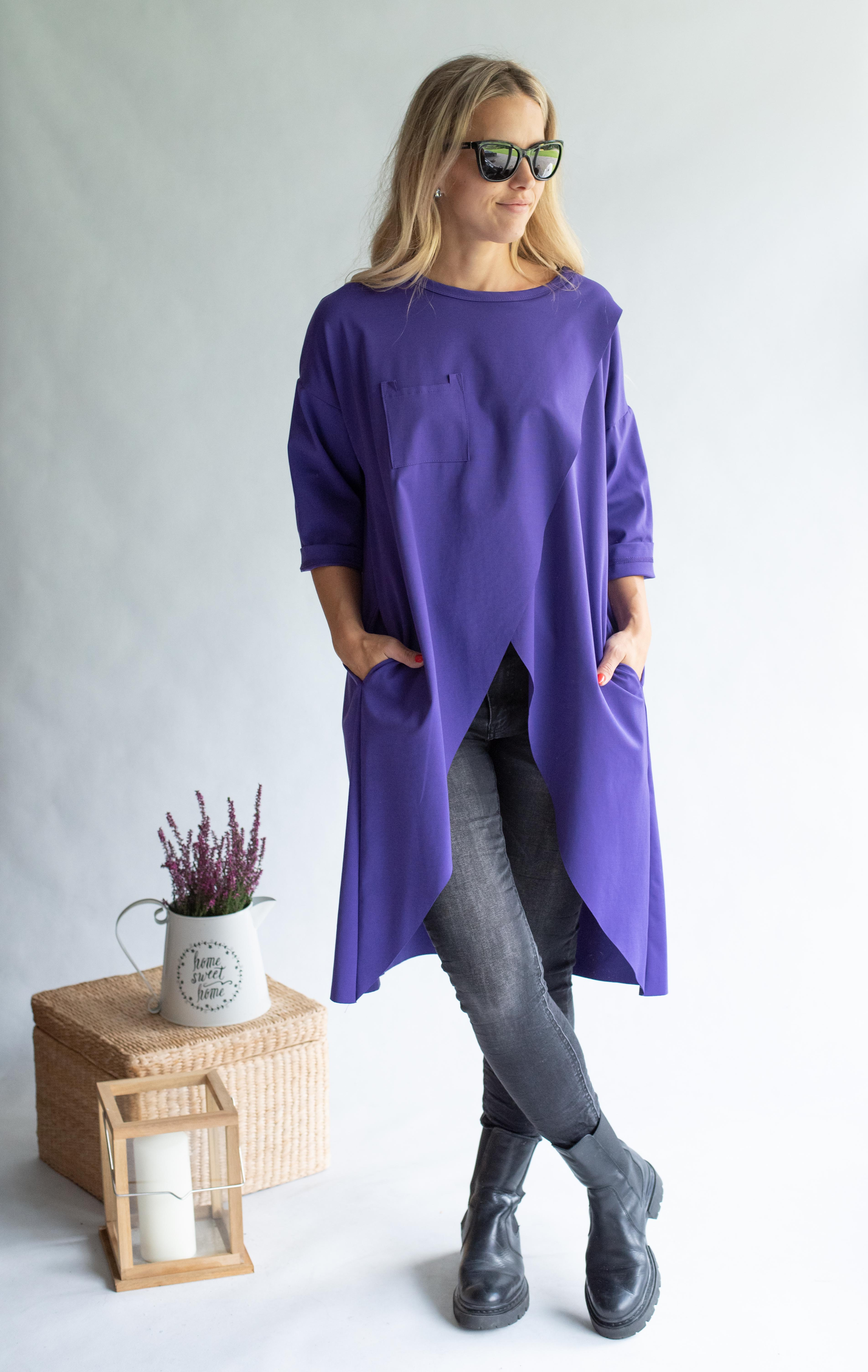 Dlouhá asymetrická tunika, volný střih, 3/4 rukáv, všité kapsy, vhodný doplněk k jeansovým kalhotám