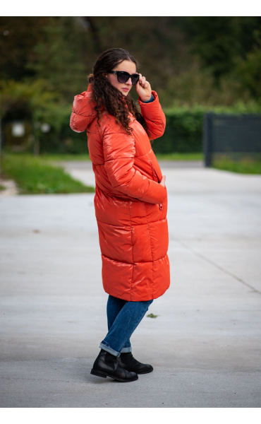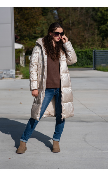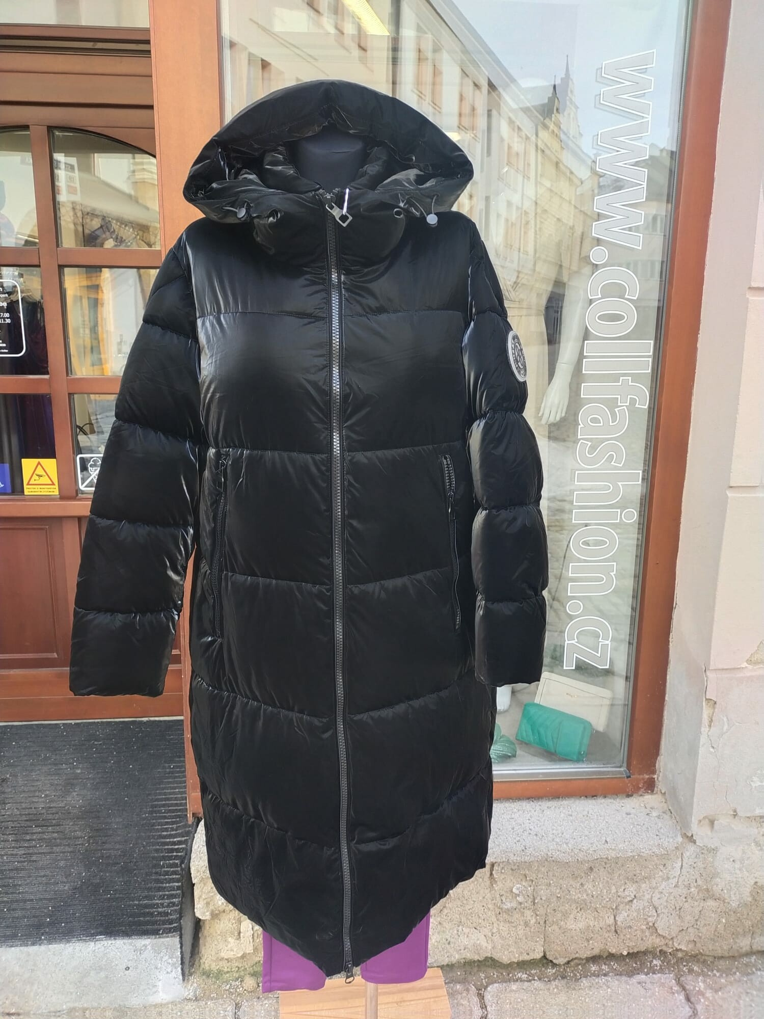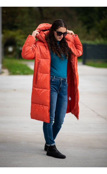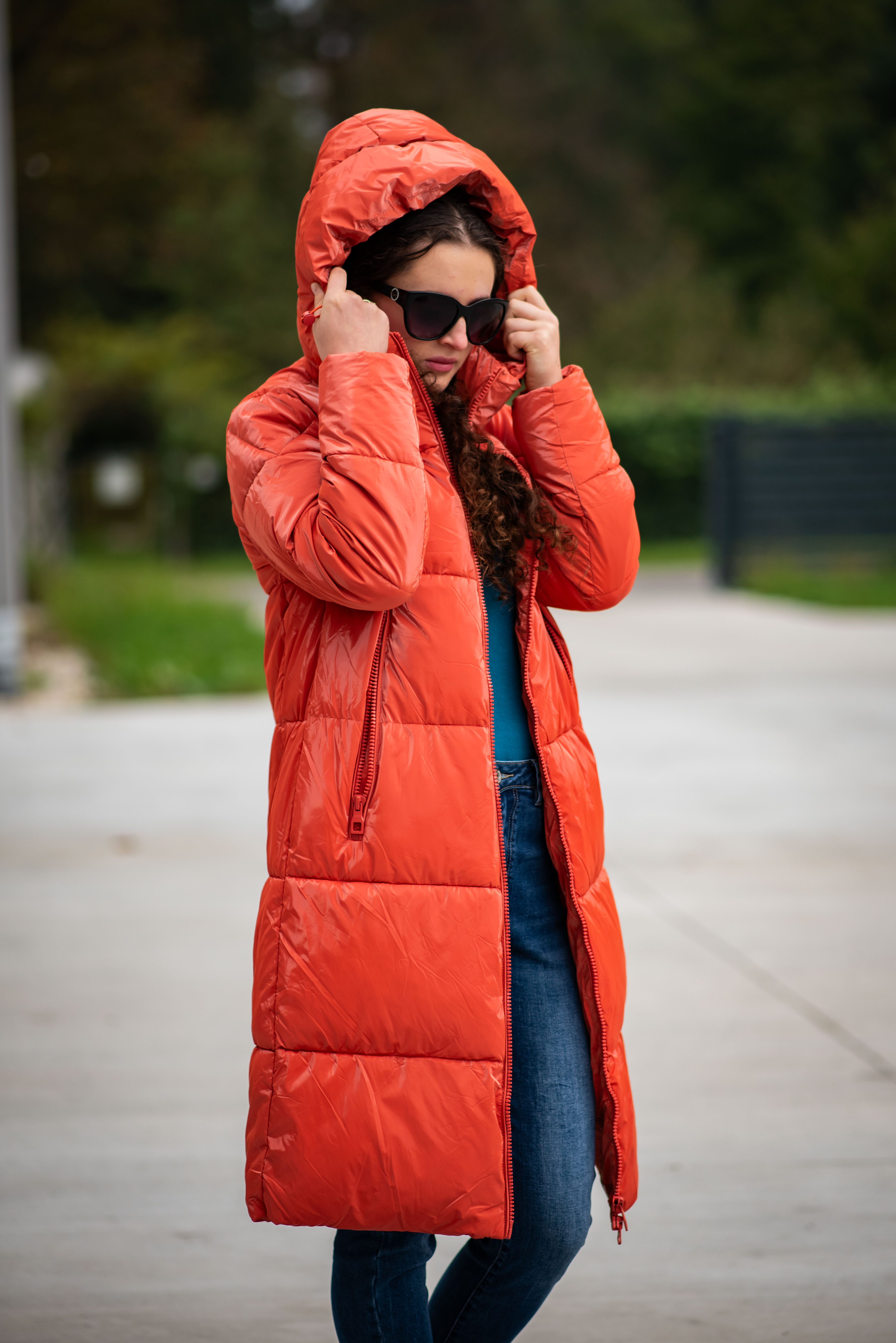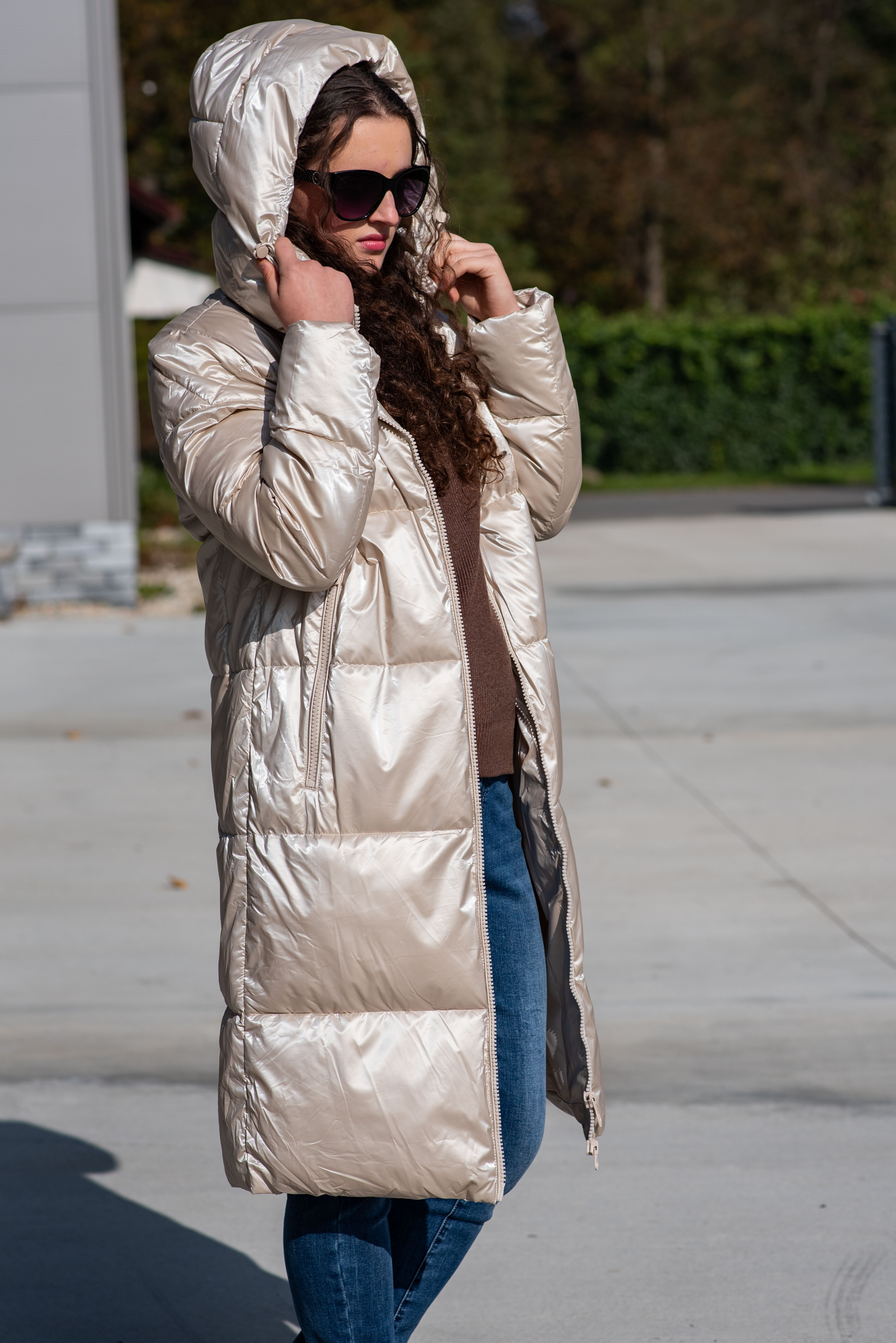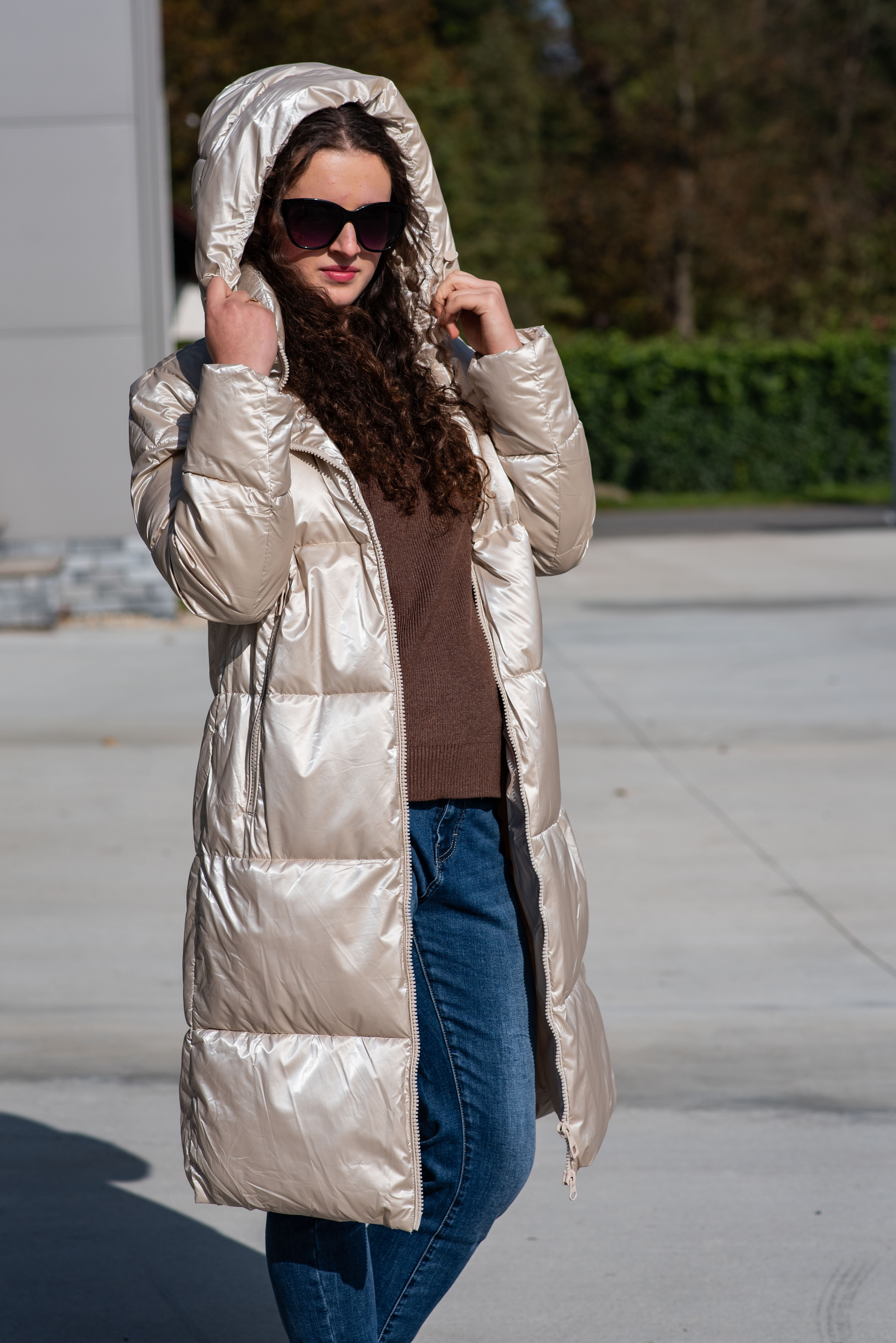 Módní delší zimní bunda s odepínací kapucí , vnitřní kapsa na mobil. Itálie